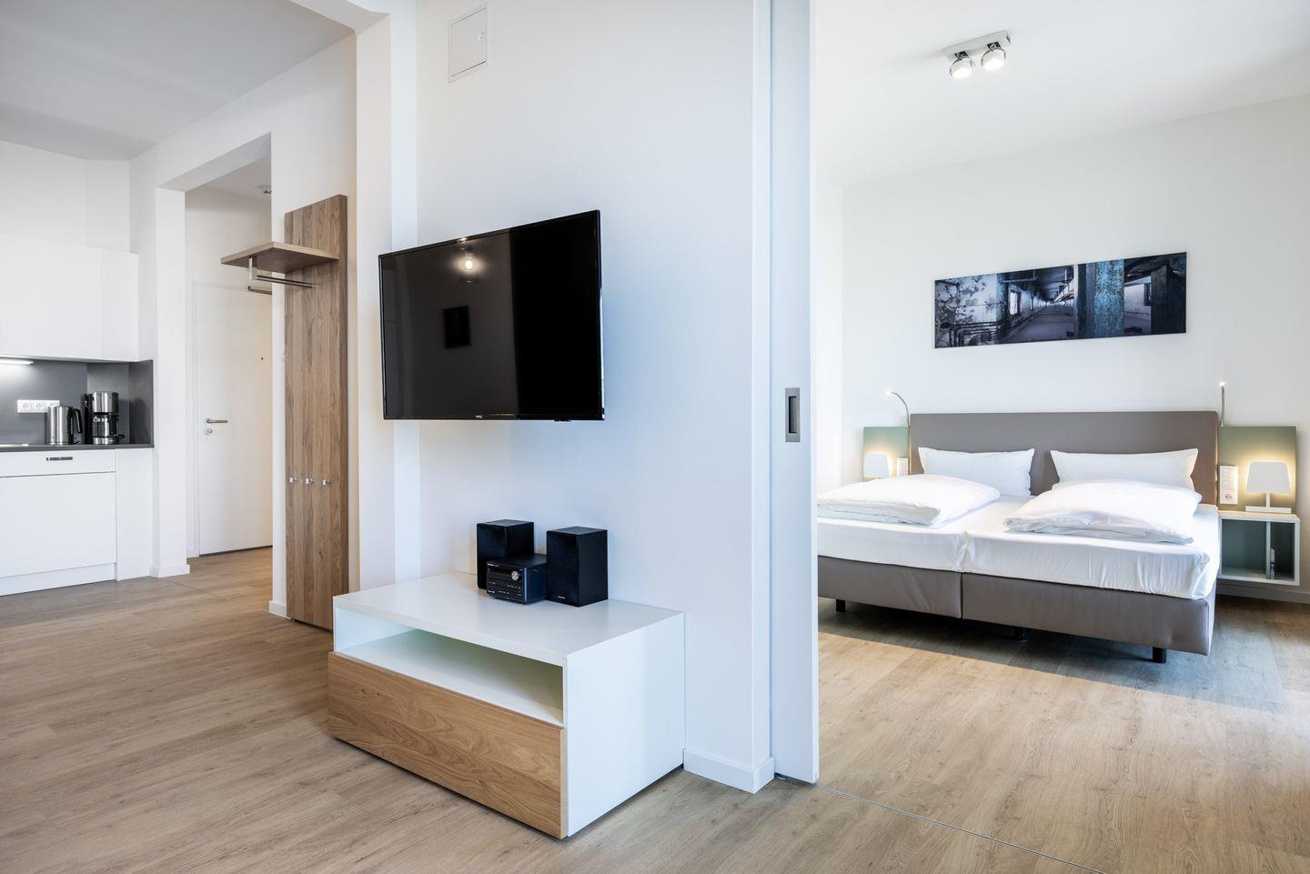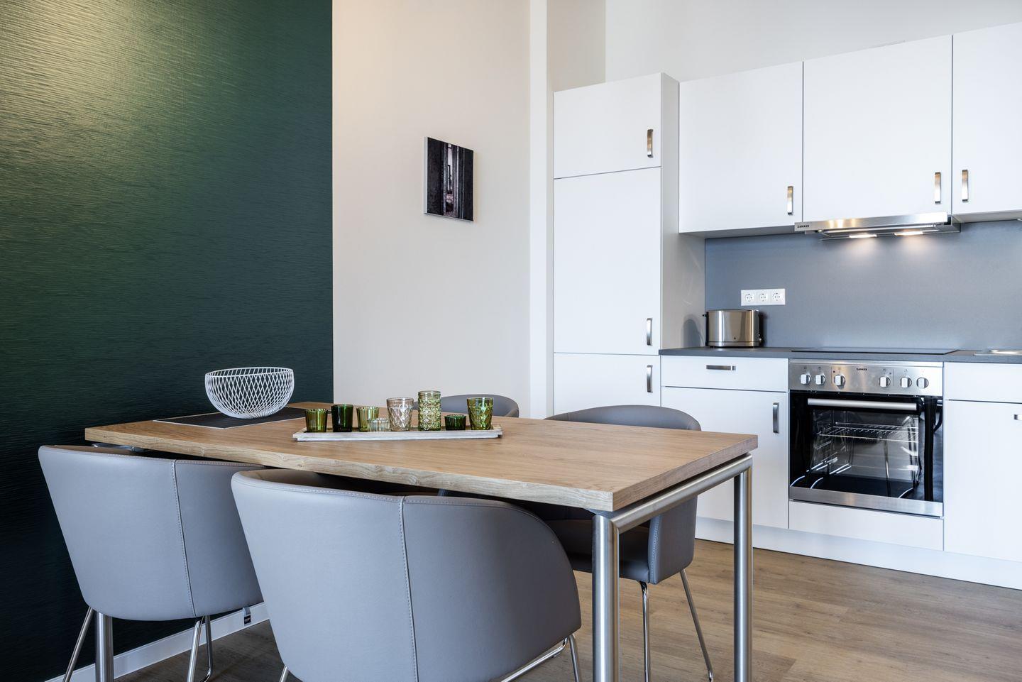 Das helle Apartment verfügt über bodentiefe Fenster, Fußbodenheizung, kostenfreies WLAN und eine voll ausgestattete offene Küche mit Geschirrspüler, Kühlschrank mit Tiefkühlfach, Herd mit 4 Glaskeramikkochfeldern und Backofen, Kaffeemaschine, Toaster, Wasserkocher und Mixstab. Im kombinierten Wohn-Essbereich befinden sich eine Doppelschlafcouch (1,40 x 2,00 m), ein Flatscreen-TV (42 Zoll), eine HiFi-Anlage sowie Gesellschaftsspiele. Genießt schöne Stunden auf dem Balkon mit direktem Blick zum Hafen. Das Schlafzimmer beinhaltet ein komfortables Boxspring-Doppelbett (1,80 x 2,00 m) und einen Flatscreen-TV (42 Zoll). Im geschmackvollen Badezimmer stehen euch eine ebenerdige Regendusche, ein Waschtisch, WC, ein Handtuchwärmer sowie ein Föhn zur Verfügung. Das Apartment verfügt über einen Safe für eine Laptopgröße bis ca. 17 Zoll.