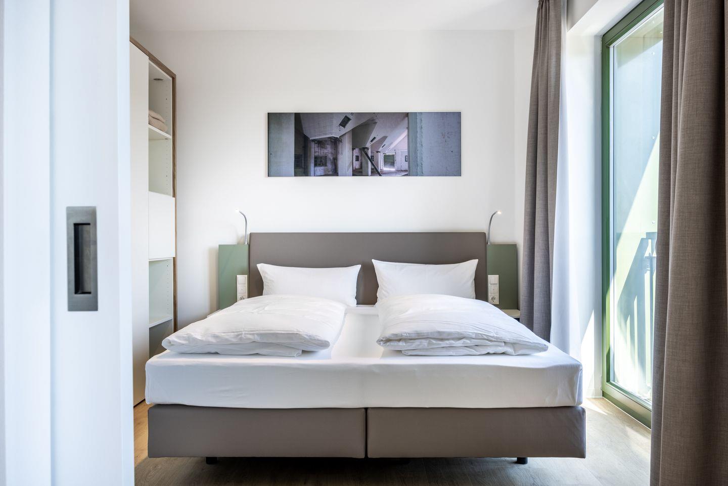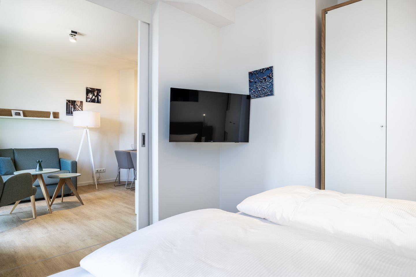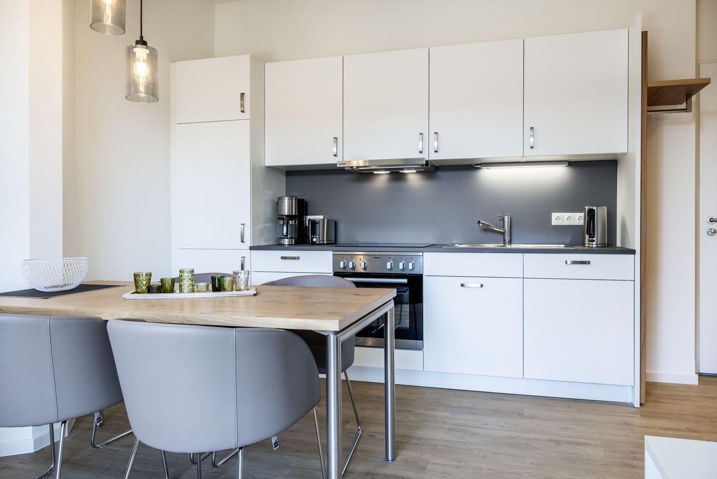 Das helle Apartment verfügt über bodentiefe Fenster, Fußbodenheizung, kostenfreies WLAN und eine voll ausgestattete offene Küche mit Geschirrspüler, Kühlschrank mit Tiefkühlfach, Herd mit 4 Glaskeramikkochfeldern und Backofen, Kaffeemaschine, Toaster, Wasserkocher und Mixstab. Im kombinierten Wohn-Essbereich befinden sich eine Einzelschlafcouch (1,20 x 2,00 m), ein Flatscreen-TV (42 Zoll), eine HiFi-Anlage sowie Gesellschaftsspiele. Genießt schöne Stunden auf dem Balkon mit Blick zum Hafen. Das Schlafzimmer beinhaltet ein komfortables Boxspring-Doppelbett (1,80 x 2,00 m) und einen Flatscreen-TV (42 Zoll). Im geschmackvollen Badezimmer stehen euch eine ebenerdige Regendusche, ein Waschtisch, WC, ein Handtuchwärmer sowie ein Föhn zur Verfügung. Das Apartment verfügt über einen Safe für eine Laptopgröße bis ca. 17 Zoll. Haustiere sind in diesem Apartment nicht zugelassen.