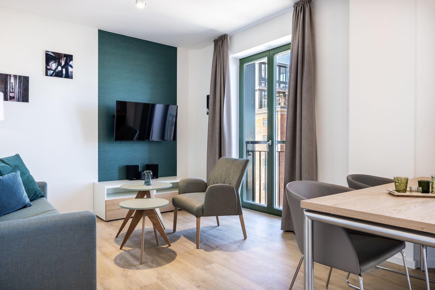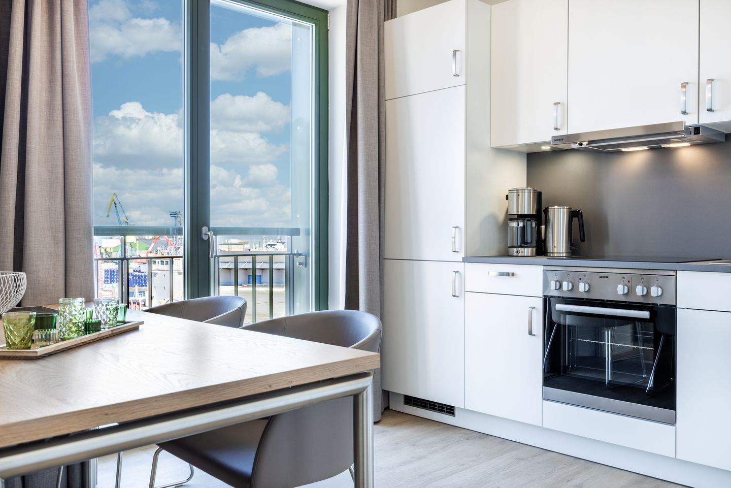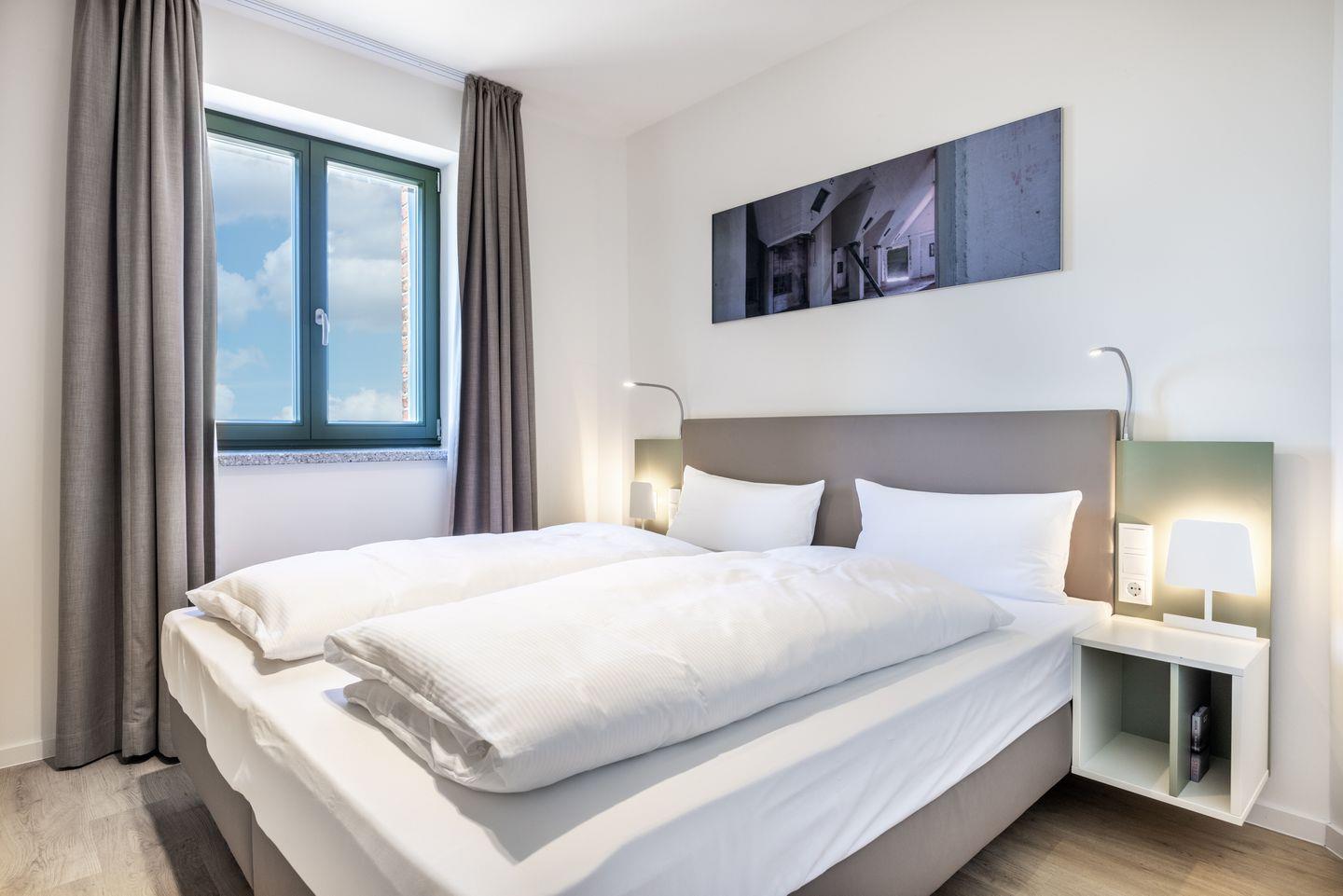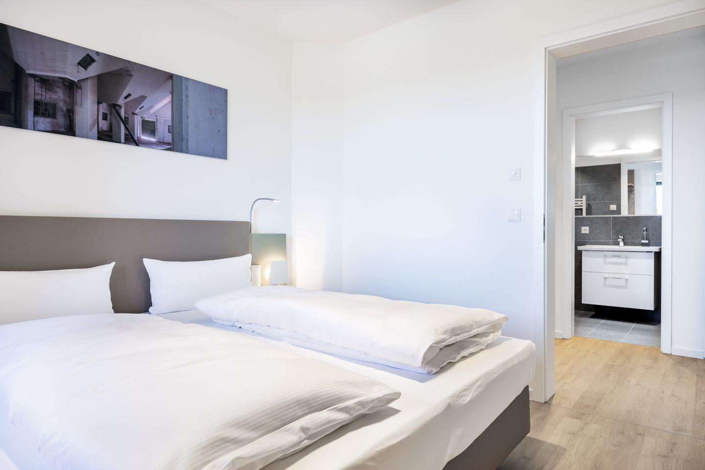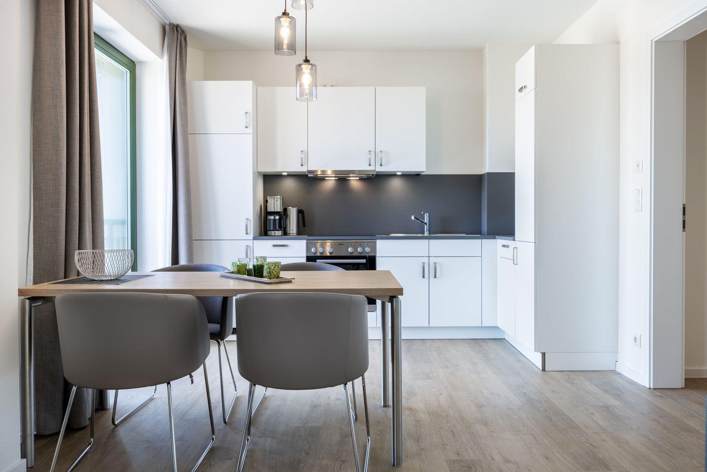 Das helle Apartment verfügt über bodentiefe Fenster, Fußbodenheizung, kostenfreies WLAN und eine voll ausgestattete offene Küche mit Geschirrspüler, Kühlschrank mit Tiefkühlfach, Herd mit 4 Glaskeramikkochfeldern und Backofen, Kaffeemaschine, Toaster, Wasserkocher und Mixstab. Im kombinierten Wohn-Essbereich befinden sich eine Doppelschlafcouch (1,40 x 2,00 m), ein Flatscreen-TV (42 Zoll), eine HiFi-Anlage sowie Gesellschaftsspiele. Das Schlafzimmer beinhaltet ein komfortables Boxspring-Doppelbett (1,80 x 2,00 m) und einen Flatscreen-TV (42 Zoll). Im geschmackvollen Badezimmer stehen euch eine ebenerdige Regendusche, ein Waschtisch, WC, ein Handtuchwärmer sowie ein Föhn zur Verfügung. Das Apartment verfügt über einen Safe für eine Laptopgröße bis ca. 17 Zoll.