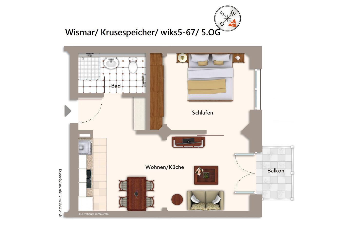 Das Nichtraucher-Apartment in West-Lage befindet sich im 5. Obergeschoss des denkmalgeschützten Krusespeichers. Der Alte Hafen von Wismar, einer der attraktivsten Orte der weltoffenen Hansestadt, liegt euch zu Füßen. Von hier aus lässt sich die Stadt und das wunderschöne Umland ideal erkunden. Der Alte Hafen ist übrigens überaus beliebter Veranstaltungsort für Events und Feste und überdies Original-Drehort für SOKO Wismar, die bekannte ZDF-Serie!