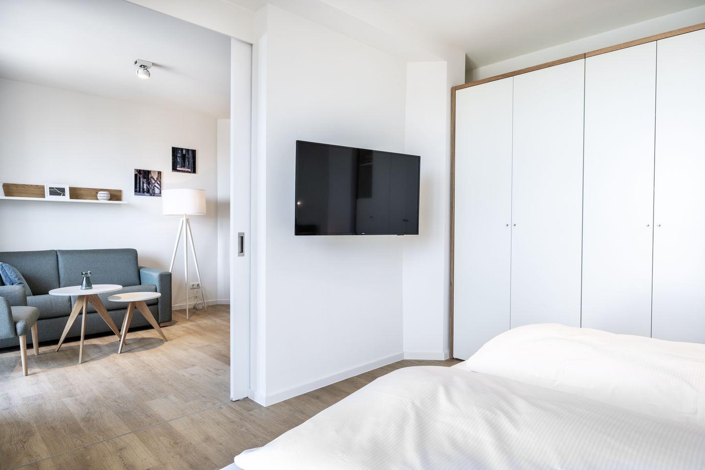 Das helle Apartment verfügt über bodentiefe Fenster, Fußbodenheizung, kostenfreies WLAN und eine voll ausgestattete offene Küche mit Geschirrspüler, Kühlschrank mit Tiefkühlfach, Herd mit 4 Glaskeramikkochfeldern und Backofen, Kaffeemaschine, Toaster, Wasserkocher und Mixstab. Im kombinierten Wohn-Essbereich befinden sich eine Doppelschlafcouch (1,40 x 2,00 m), ein Flatscreen-TV (42 Zoll), eine HiFi-Anlage sowie Gesellschaftsspiele. Das Schlafzimmer beinhaltet ein komfortables Boxspring-Doppelbett (1,80 x 2,00 m) und einen Flatscreen-TV (42 Zoll). Im geschmackvollen Badezimmer stehen euch eine ebenerdige Regendusche, ein Waschtisch, WC, ein Handtuchwärmer sowie ein Föhn zur Verfügung. Das Apartment verfügt über einen Safe für eine Laptopgröße bis ca. 17 Zoll. Vom Balkon aus habt ihr einen grandiosen Ausblick über das Hafenpanorama von Wismar!