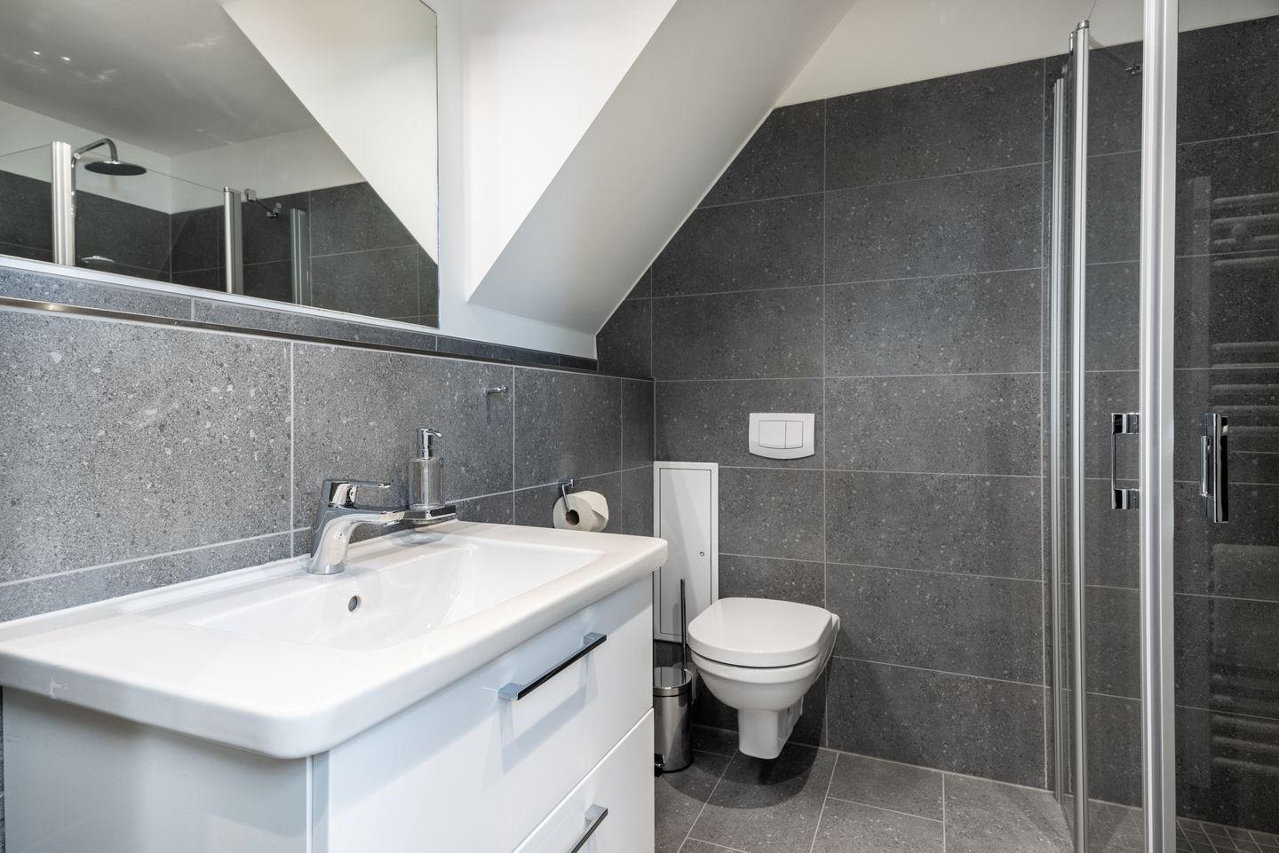 Auf der ersten Wohnebene befindet sich die voll ausgestattete offene Küche mit Geschirrspüler, Mikrowelle, Kühlschrank mit Tiefkühlfach, Herd mit 2 Glaskeramikkochfeldern und Backofen, Kaffeemaschine, Toaster, Wasserkocher und Mixstab sowie der kombinierte Wohn-Essbereich mit Einzelschlafcouch (1,20 x 2,00 m), Flatscreen-TV (42 Zoll), HiFi-Anlage und Gesellschaftsspielen. Hier befindet sich auch das geschmackvolle Badezimmer mit ebenerdiger Regendusche, Waschtisch, WC, Handtuchwärmer und Föhn.