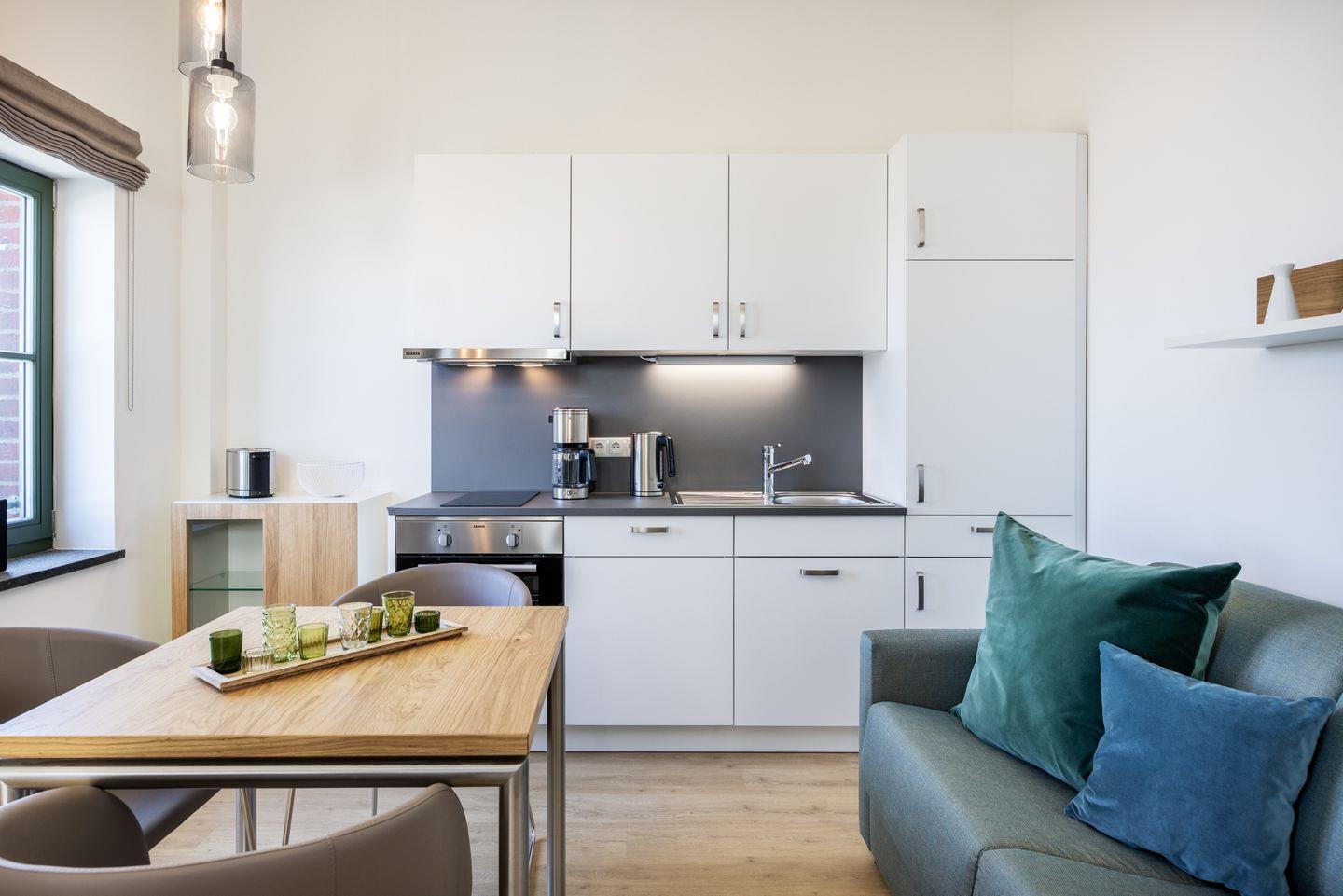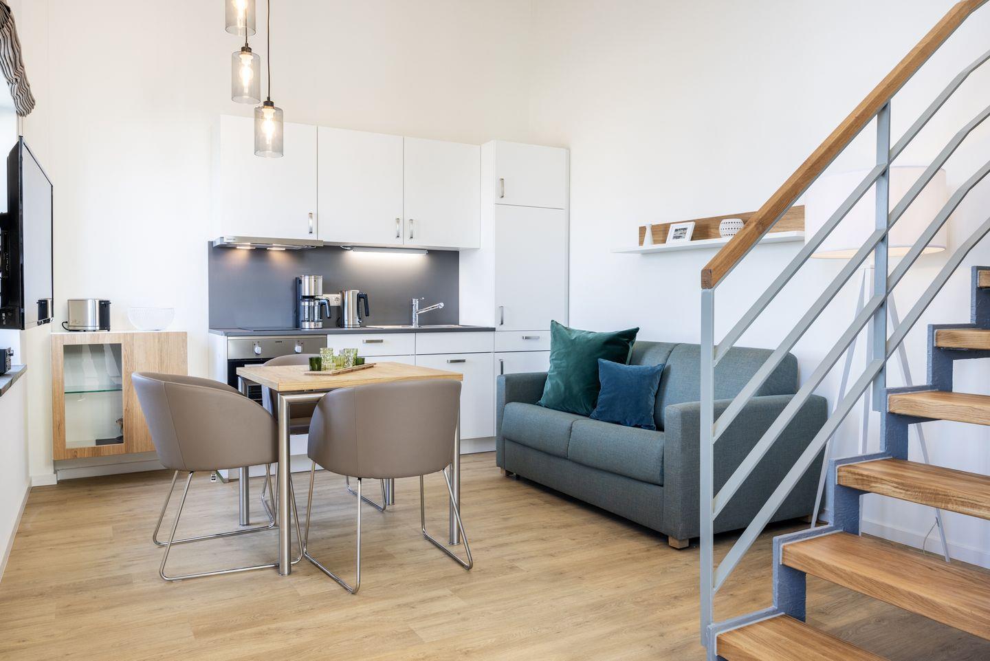 Das 43 m² große 2-Zimmer Maisonette-Apartment, wiks6-68, befindet sich im Upstalsboom Krusespeicher und ist für bis zu 3 Personen geeignet. Das moderne Apartment besticht durch seine Dachterrasse und den einmalig-schönen Ausblick auf den Hafen.