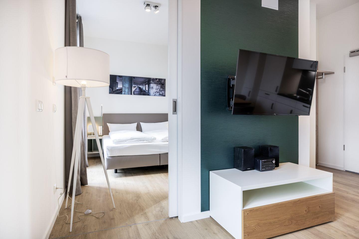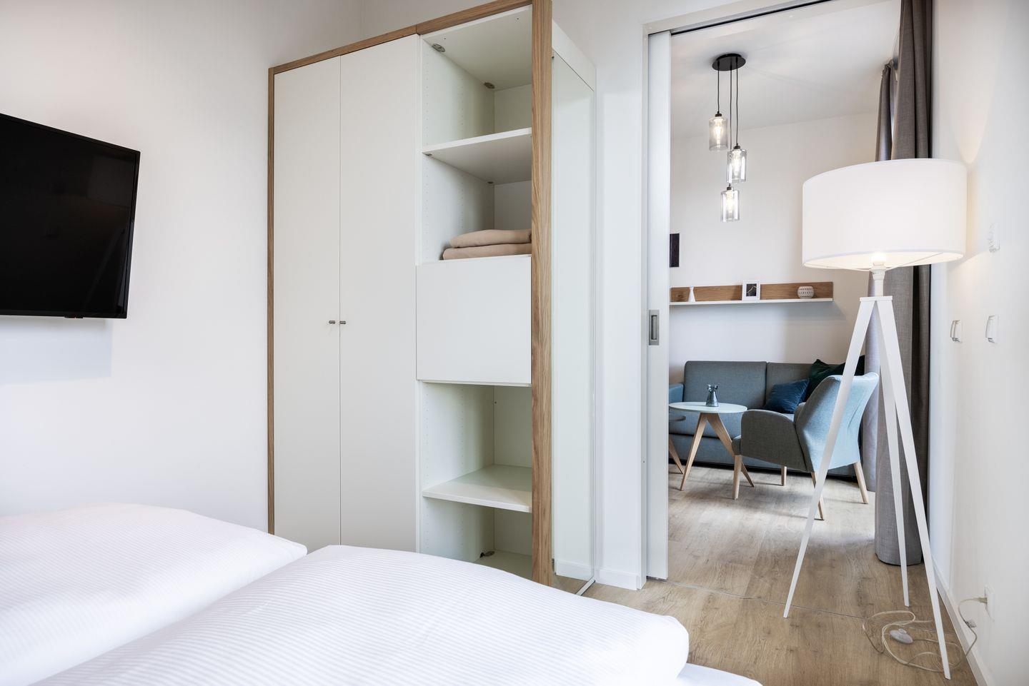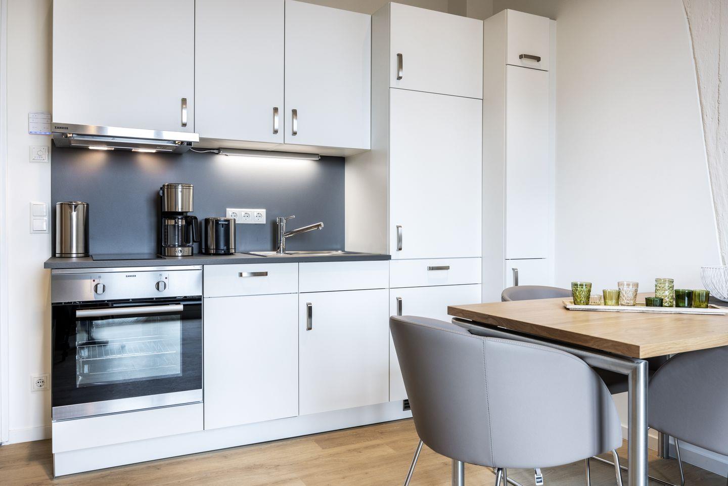 Das helle Apartment verfügt über bodentiefe Fenster, Fußbodenheizung, kostenfreies WLAN und eine voll ausgestattete offene Küche mit Geschirrspüler, Kühlschrank mit Tiefkühlfach, Herd mit 2 Glaskeramikkochfeldern und Backofen, Kaffeemaschine, Toaster, Wasserkocher und Mixstab. Im kombinierten Wohn-Essbereich befinden sich eine Einzelschlafcouch (1,20 x 2,00 m), ein Flatscreen-TV (42 Zoll), eine HiFi-Anlage sowie Gesellschaftsspiele. Genießt schöne Stunden auf dem Balkon mit Blick zum Hafen. Das Schlafzimmer beinhaltet ein komfortables Boxspring-Doppelbett (1,80 x 2,00 m) und einen Flatscreen-TV (42 Zoll). Im geschmackvollen Badezimmer stehen euch eine ebenerdige Regendusche, ein Waschtisch, WC, ein Handtuchwärmer sowie ein Föhn zur Verfügung. Das Apartment verfügt über einen Safe für eine Laptopgröße bis ca. 17 Zoll.