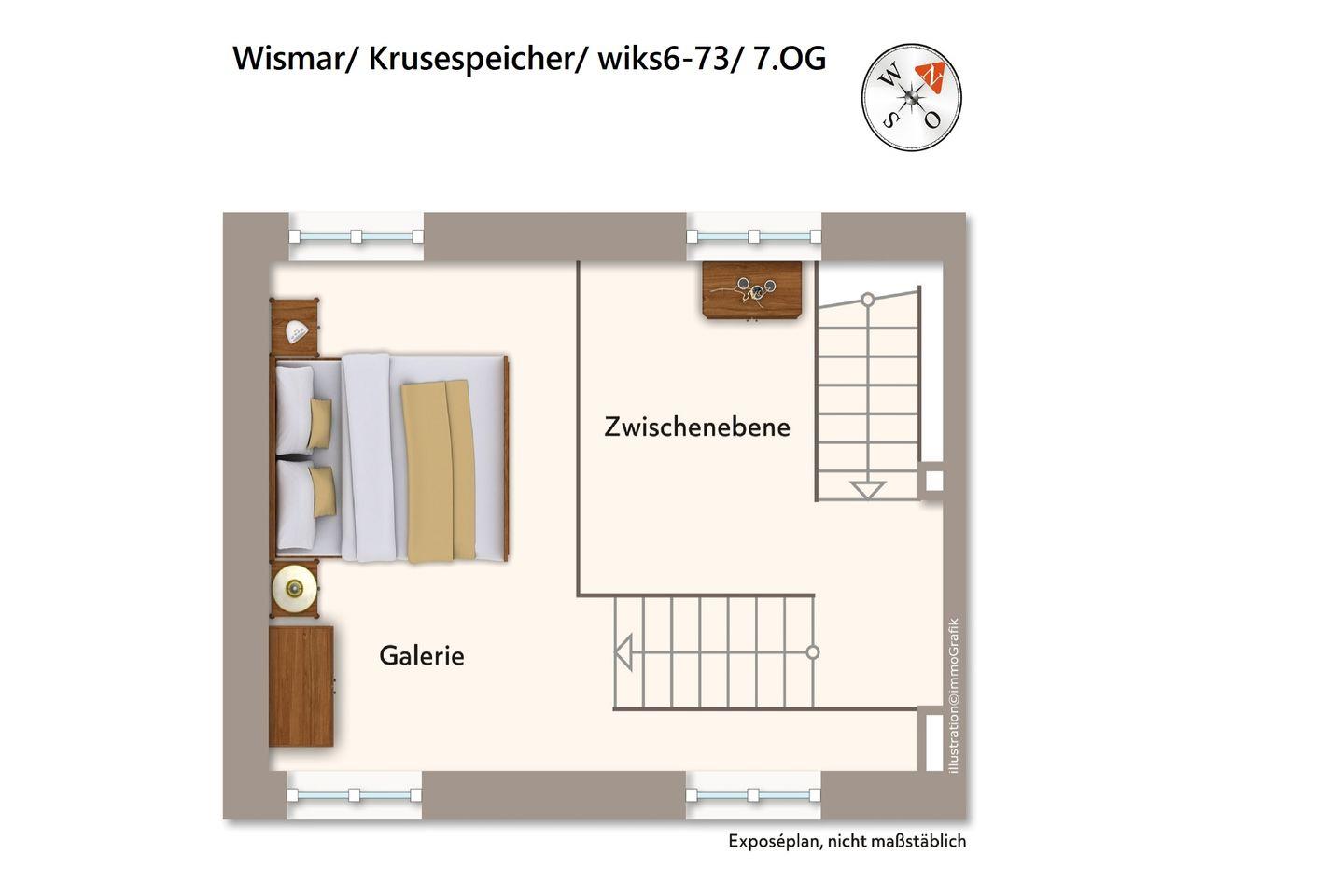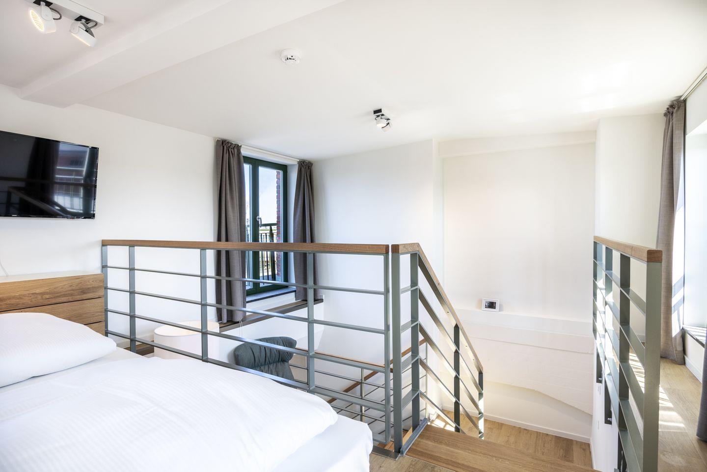 Auf der zweiten Wohnebene des Maisonette-Apartments befindet sich das Galerieschlafzimmer und die angrenzende nach Süd-Westen gelegene großzügige Dachterrasse mit beeindruckendem Blick über den Hafen. Der Schlafbereich verfügt über ein komfortables Boxspring-Doppelbett (1,80 x 2,00 m) und einen Flatscreen-TV (42 Zoll) und bietet durch seine exponierte Lage einen Rundumblick auf den Hafen, die Altstadt und die Wismarer Bucht.