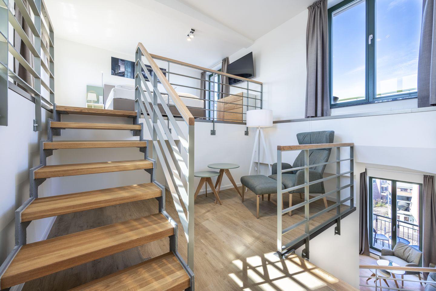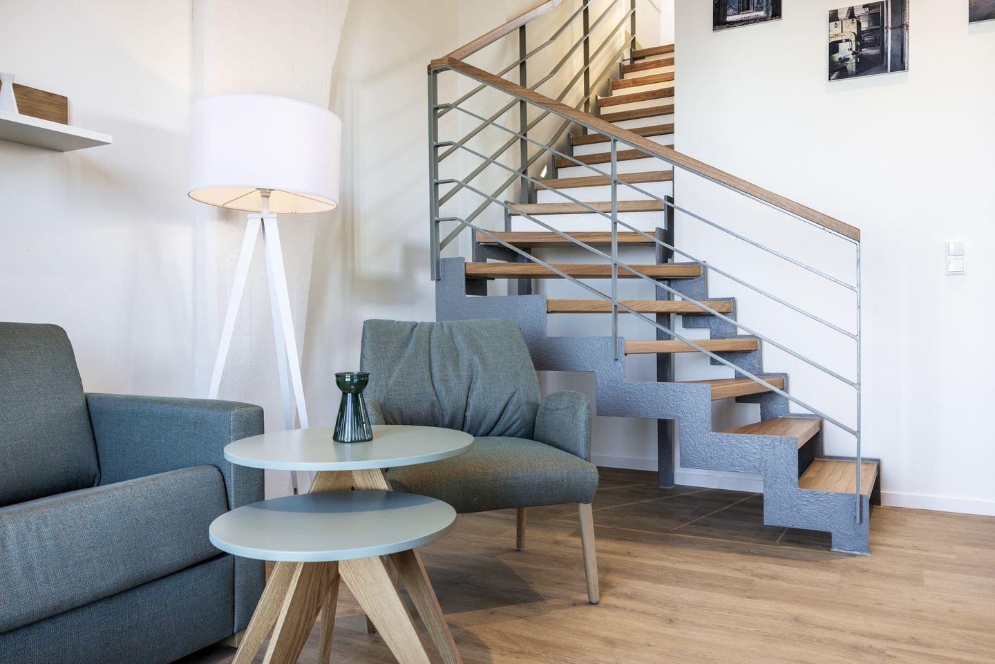 Auf der ersten Wohnebene befindet sich die voll ausgestattete offene Küche mit Essbereich, Geschirrspüler, Kühlschrank mit Tiefkühlfach, Herd mit 4 Glaskeramikkochfeldern und Backofen, Kaffeemaschine, Toaster, Wasserkocher und Mixstab sowie das Wohnzimmer mit Flatscreen-TV (42 Zoll), HiFi-Anlage und Gesellschaftsspielen. Hier befindet sich auch das geschmackvolle Badezimmer mit ebenerdiger Regendusche, Waschtisch, WC, Handtuchwärmer und Föhn. Das Schlafzimmer auf dieser Ebene verfügt über ein komfortables Boxspring-Doppelbett (1,80 x 2,00 m) und einen Flatscreen-TV (42 Zoll). Sowohl vom Schlafzimmer als auch vom Wohnzimmer aus habt ihr Zugang zum sonnigen Balkon in Süd-West-Lage. Hier genießt ihr einen wundervollen Ausblick auf die maritime Hafenkulisse.