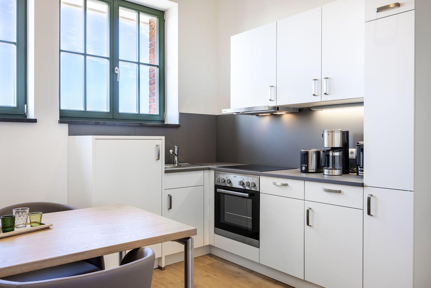 Das helle Apartment verfügt über bodentiefe Fenster, Fußbodenheizung, kostenfreies WLAN und eine voll ausgestattete offene Küche mit Geschirrspüler, Kühlschrank mit Tiefkühlfach, Herd mit 4 Glaskeramikkochfeldern und Backofen, Kaffeemaschine, Toaster, Wasserkocher und Mixstab. Im kombinierten Wohn-Essbereich befinden sich ein Flatscreen-TV (42 Zoll), eine HiFi-Anlage sowie Gesellschaftsspiele. Genießt schöne Stunden auf der Dachterrasse mit direktem Blick zum Hafen. Beide Schlafzimmer beinhalten jeweils ein komfortables Boxspring-Doppelbett (1,80 x 2,00 m) und einen Flatscreen-TV (42 Zoll). Im geschmackvollen Badezimmer stehen euch eine ebenerdige Regendusche, ein Waschtisch, WC, ein Handtuchwärmer sowie ein Föhn zur Verfügung. Das Apartment verfügt über einen Safe für eine Laptopgröße bis ca. 17 Zoll.