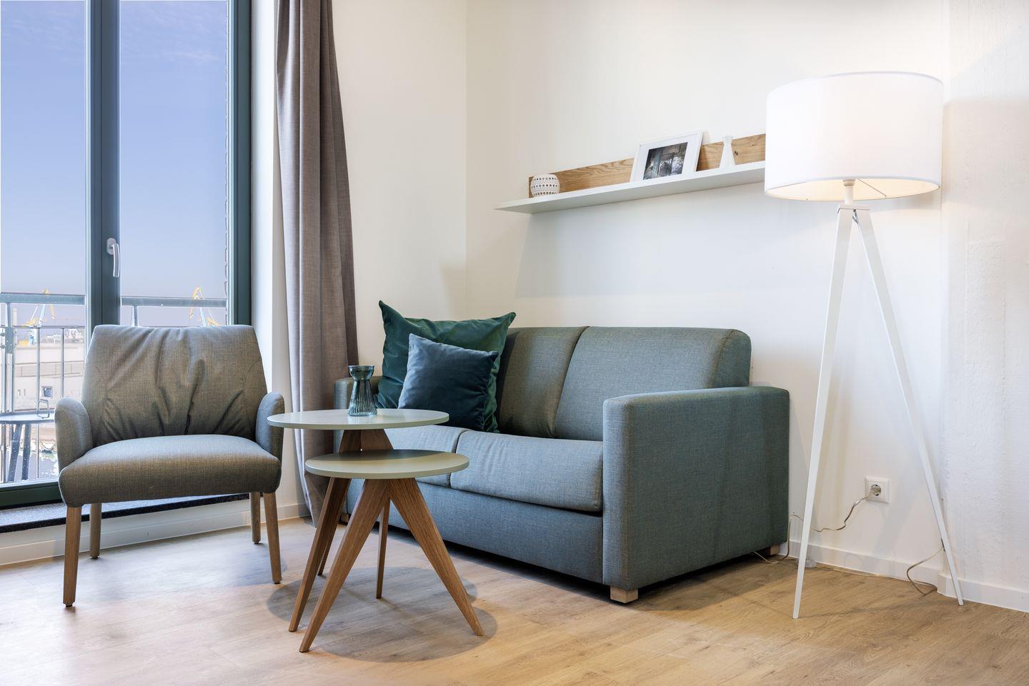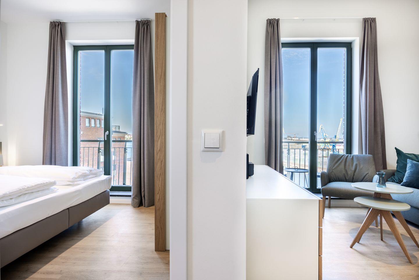 Das helle Apartment verfügt über bodentiefe Fenster, Fußbodenheizung, kostenfreies WLAN und einen Safe für eine Laptopgröße bis ca. 17 Zoll.