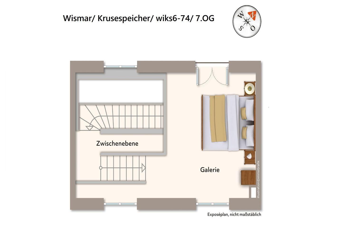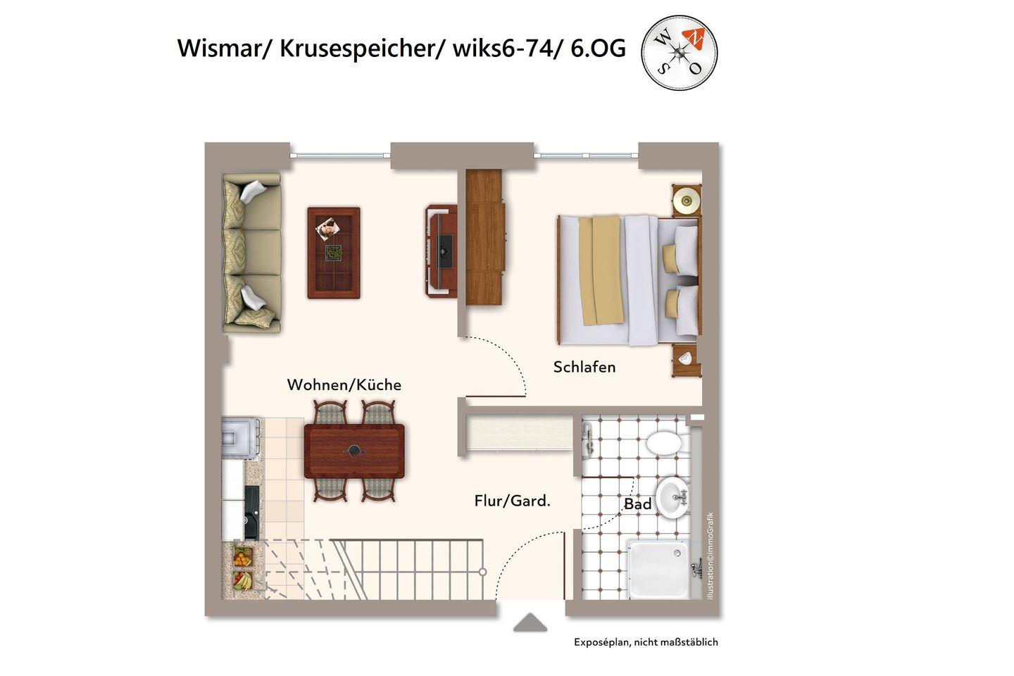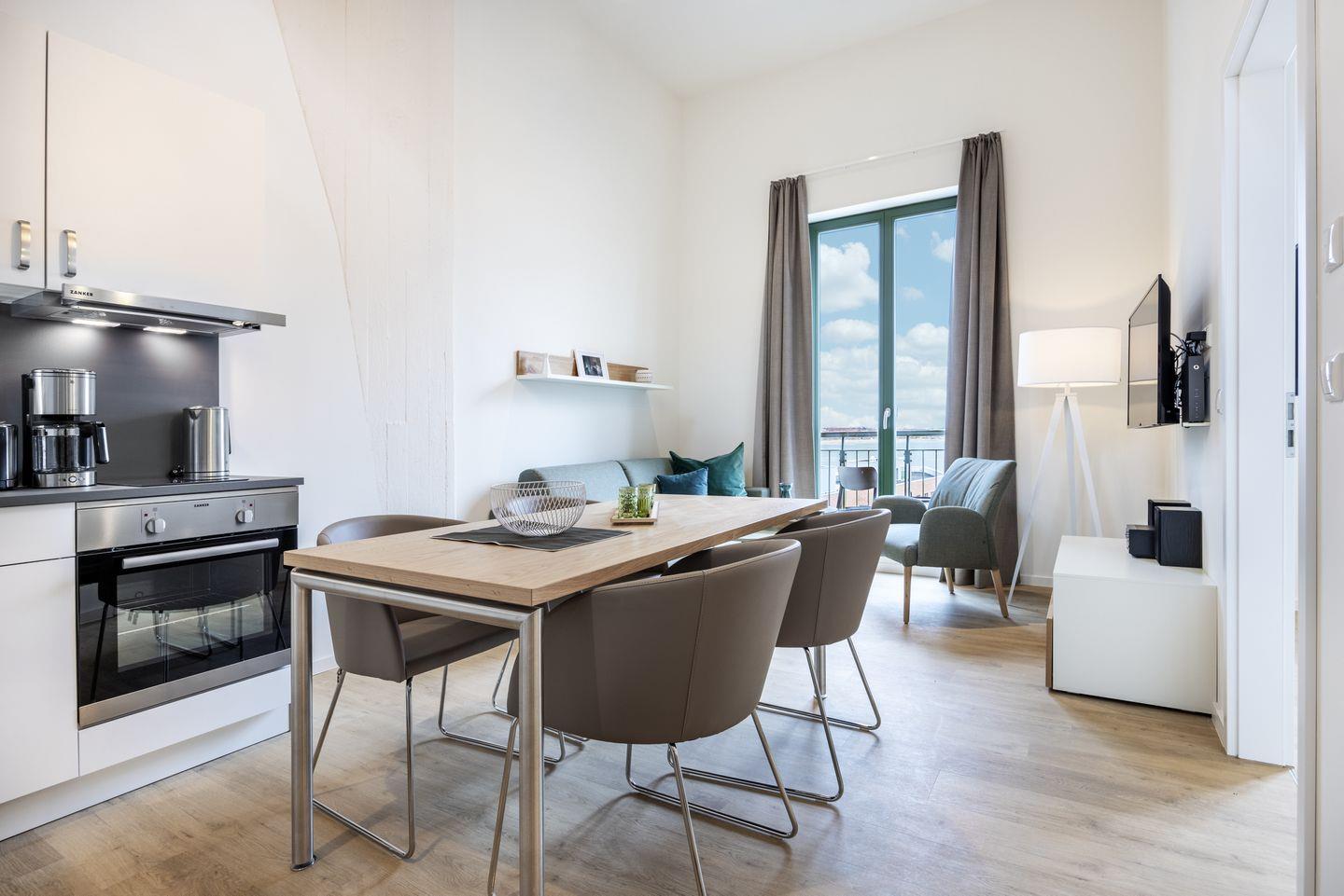 Das 73 m² große 3-Zimmer Maisonette-Apartment, wiks6-74, befindet sich im Upstalsboom Krusespeicher und ist für bis zu 4 Personen geeignet. Das lichtdurchflutete Apartment verfügt über zwei Wohnebenen, einen Balkon und eine Dachterrasse mit einzigartigem Panoramablick über den Hafen von Wismar.