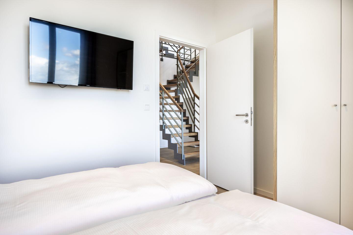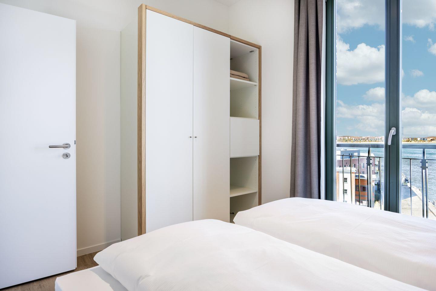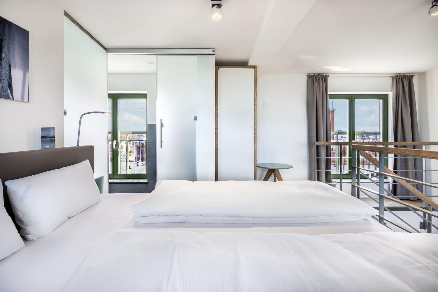 Auf der zweiten Wohnebene des Maisonette-Apartments befindet sich das Galerieschlafzimmer und die Dachterrasse mit beeindruckendem Blick über den Hafen. Der Schlafbereich verfügt über ein komfortables Boxspring-Doppelbett (1,80 x 2,00 m) und einen Flatscreen-TV (42 Zoll). Auf dieser Ebene befindet sich ein zweites, offen gestaltetes Bad mit Badewanne, WC, Waschbecken und Handtuchwärmer. Ein Kinderbett kann gegen Entgelt im Wohnbereich aufgestellt werden. Haustiere sind in diesem Apartment herzlich willkommen.