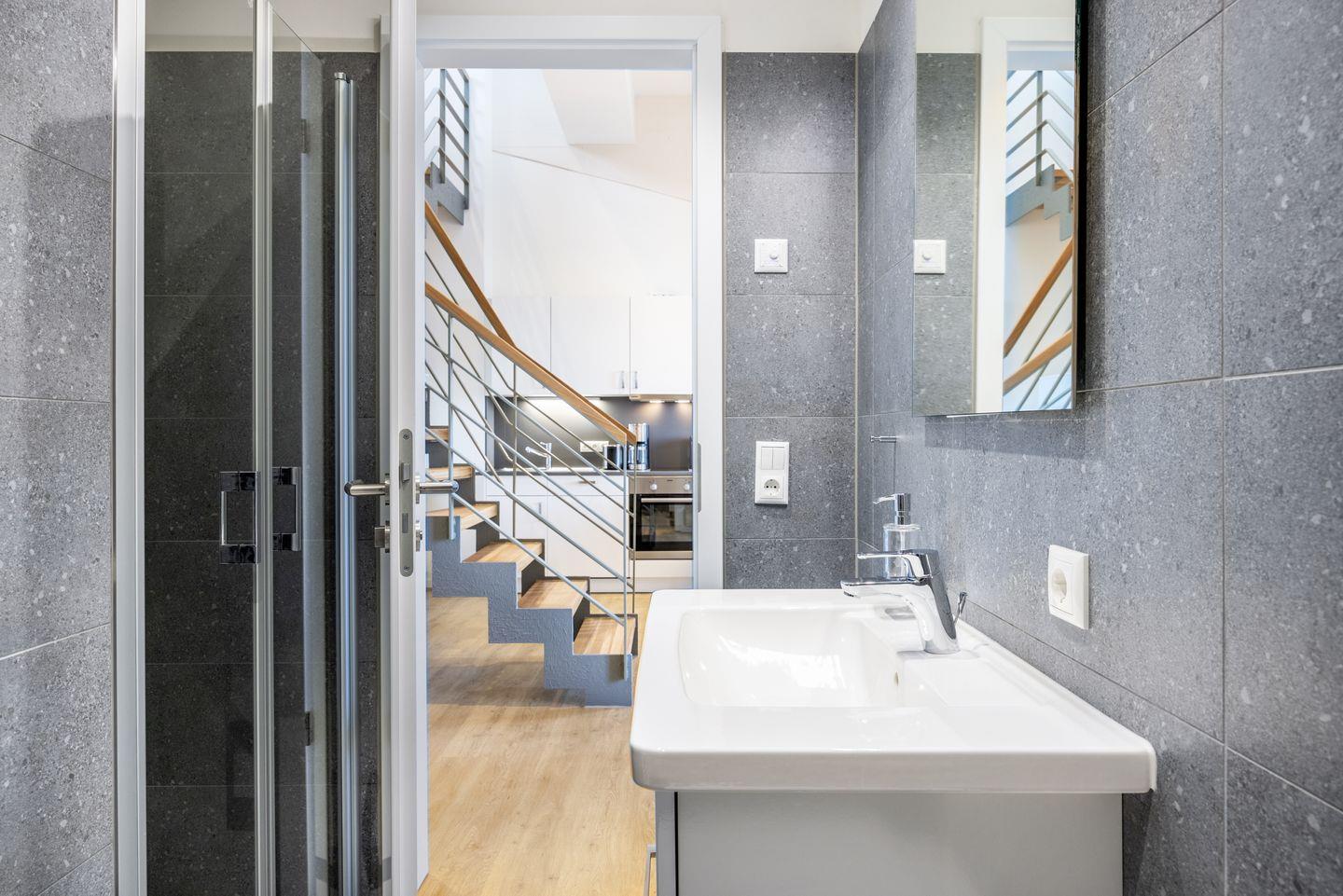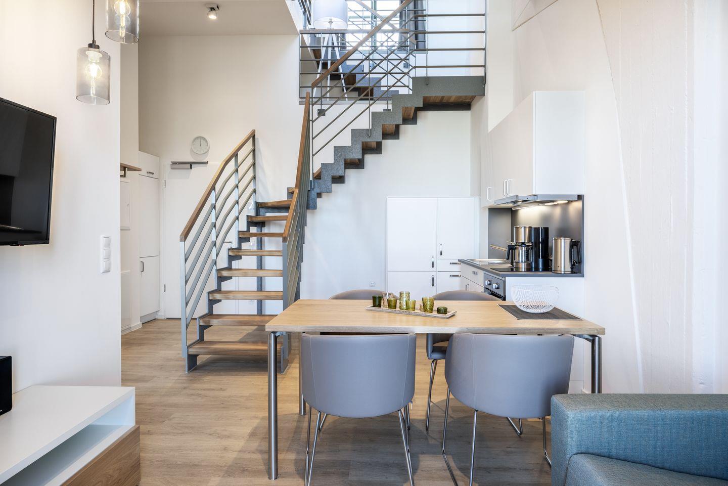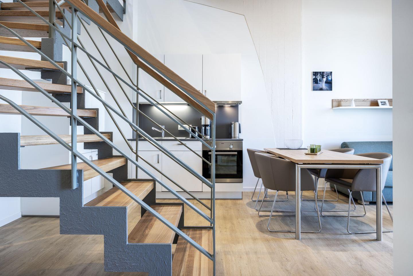 Auf der ersten Wohnebene befindet sich die voll ausgestattete offene Küche mit Geschirrspüler, Kühlschrank mit Tiefkühlfach, Herd mit 2 Glaskeramikkochfeldern und Backofen, Kaffeemaschine, Toaster, Wasserkocher und Mixstab sowie der kombinierte Wohn-Essbereich mit Flatscreen-TV (42 Zoll), HiFi-Anlage und Gesellschaftsspielen. Hier befindet sich auch ein geschmackvolles Badezimmer mit ebenerdiger Regendusche, Waschtisch, WC, Handtuchwärmer und Föhn. Das Schlafzimmer auf dieser Ebene verfügt über ein komfortables Boxspring-Doppelbett (1,80 x 2,00 m) und einen Flatscreen-TV (42 Zoll). Sowohl vom Schlafzimmer als auch vom Wohnbereich aus habt ihr Zugang zum sonnigen Balkon in West-Lage. Hier genießt ihr einen wundervollen Ausblick auf die maritime Hafenkulisse.