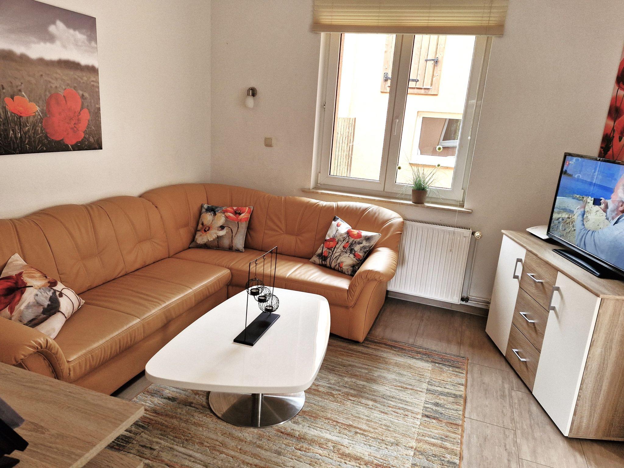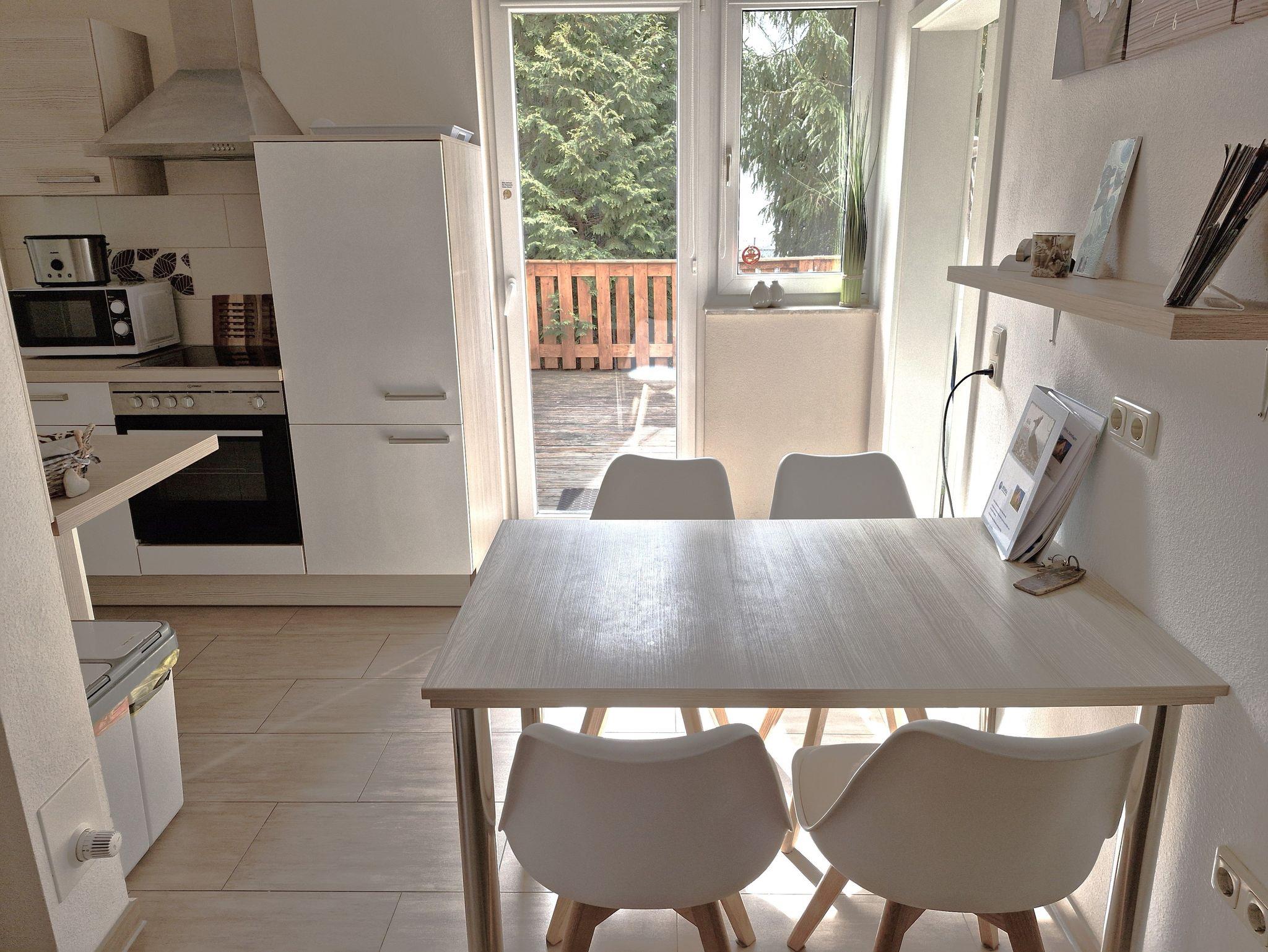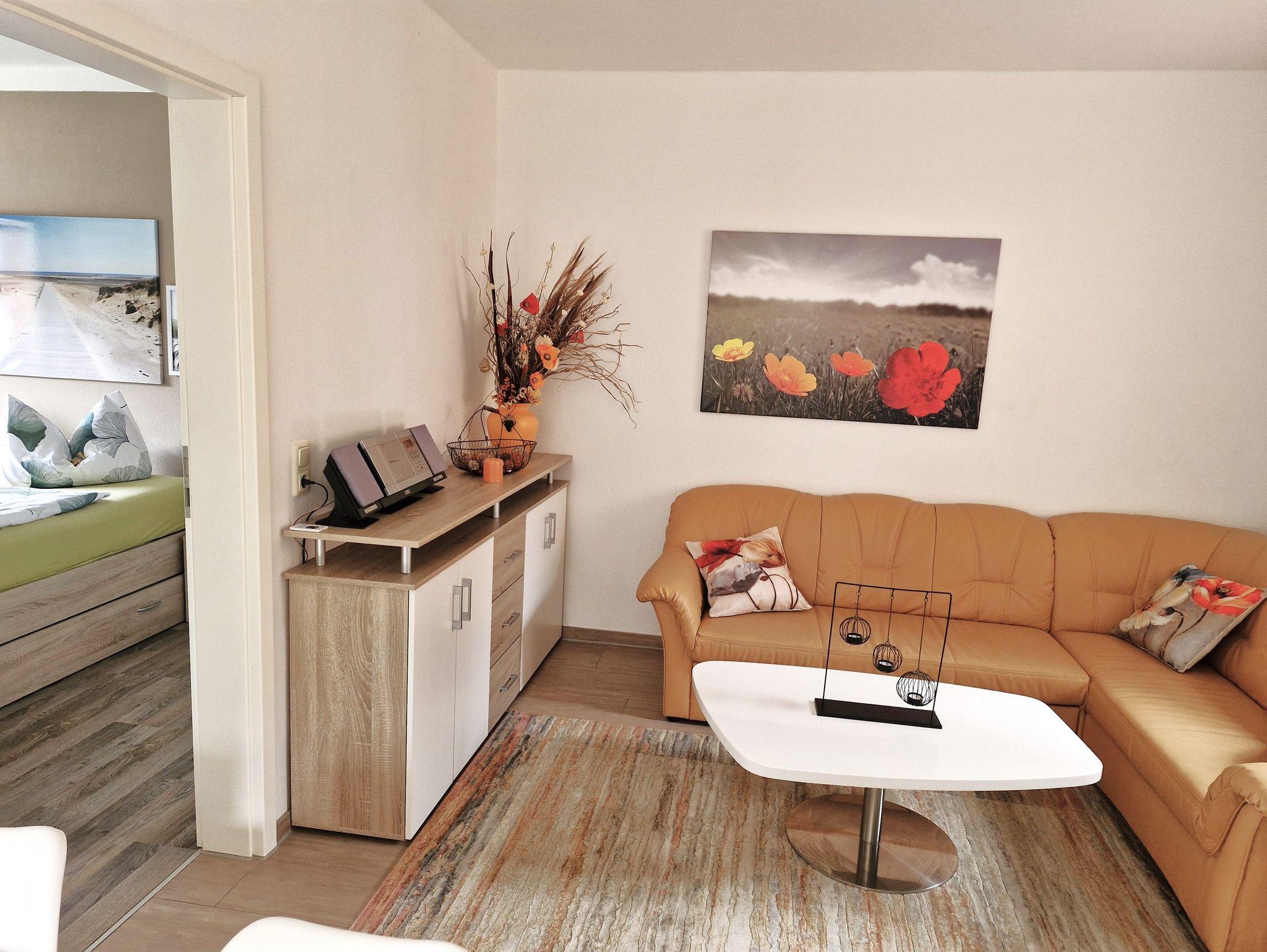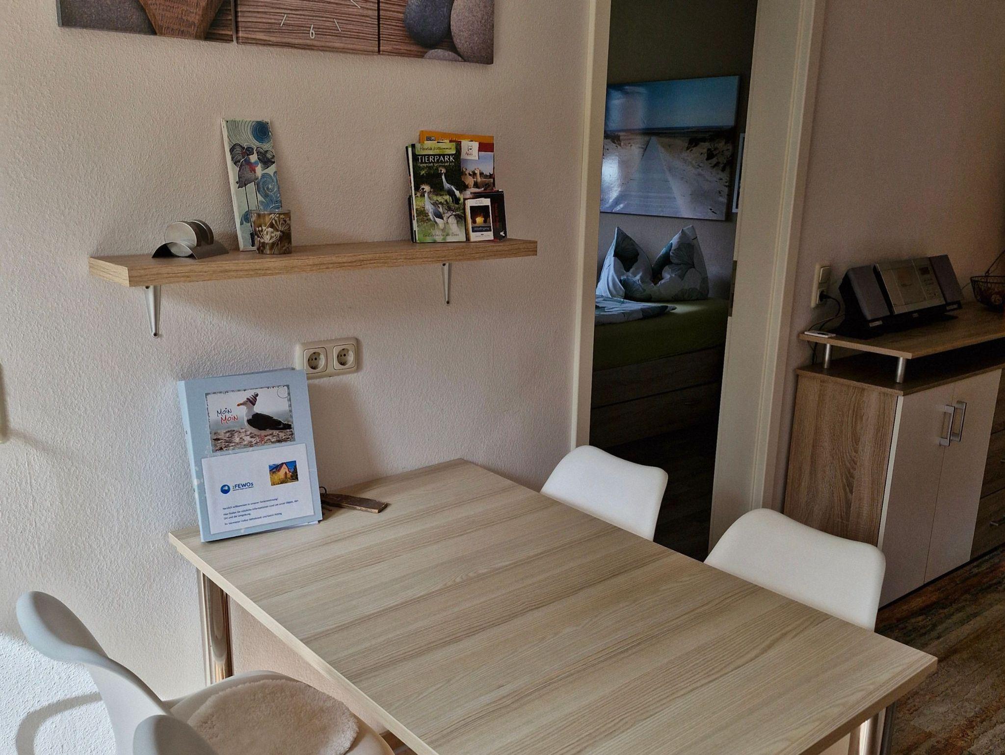 Genießen Sie Ihren Aufenthalt in dieser modernen Ferienwohnung im Erdgeschoss des Ferienhauses „Möwe“, mit separatem Eingang und direktem Zugang zur großzügigen, möblierten Terrasse und dem idyllischen Gartengrundstück. Das helle, gemütliche Wohnzimmer lädt mit ausziehbarer Couchecke, TV und Radio zum Entspannen ein. Vom Essbereich und Wohnzimmer genießen Sie den Blick ins Grüne und auf die Terrasse - perfekt für entspannte Stunden im Freien.