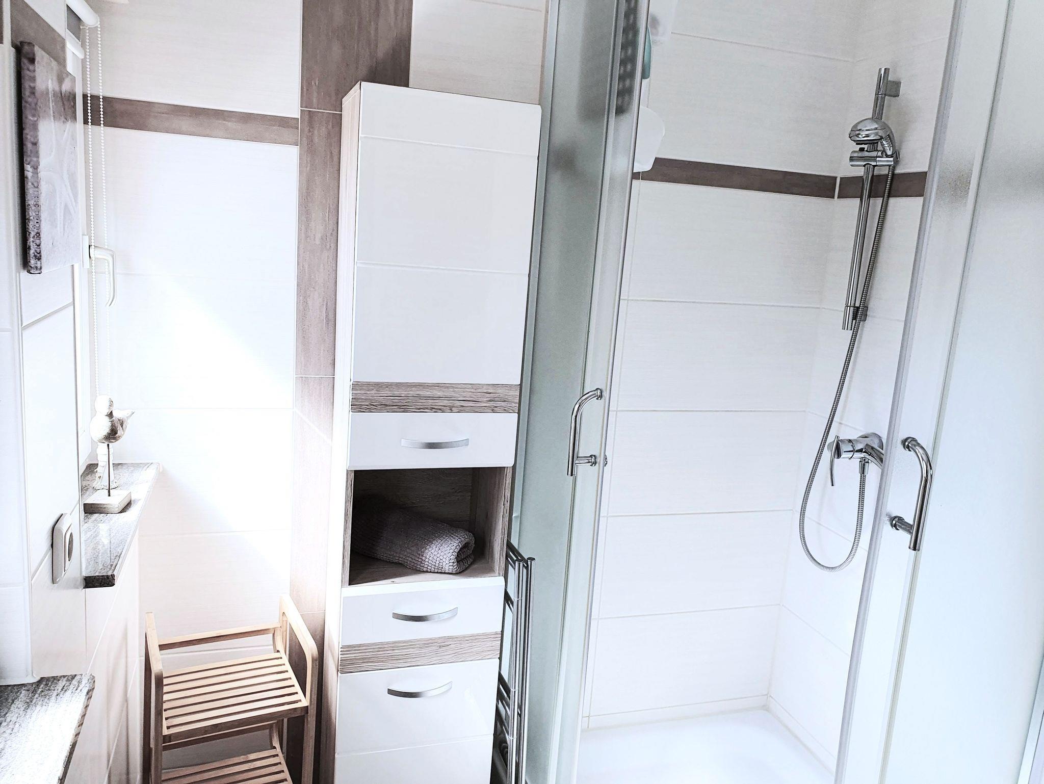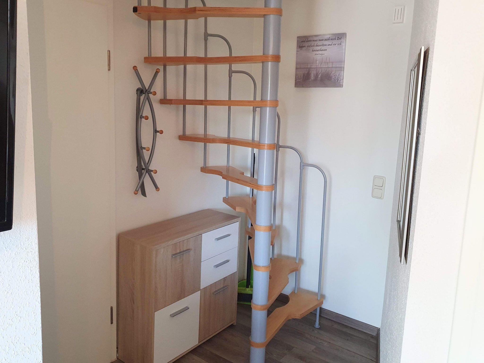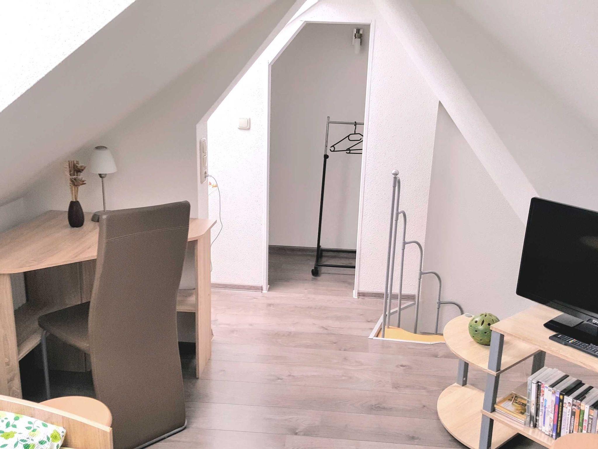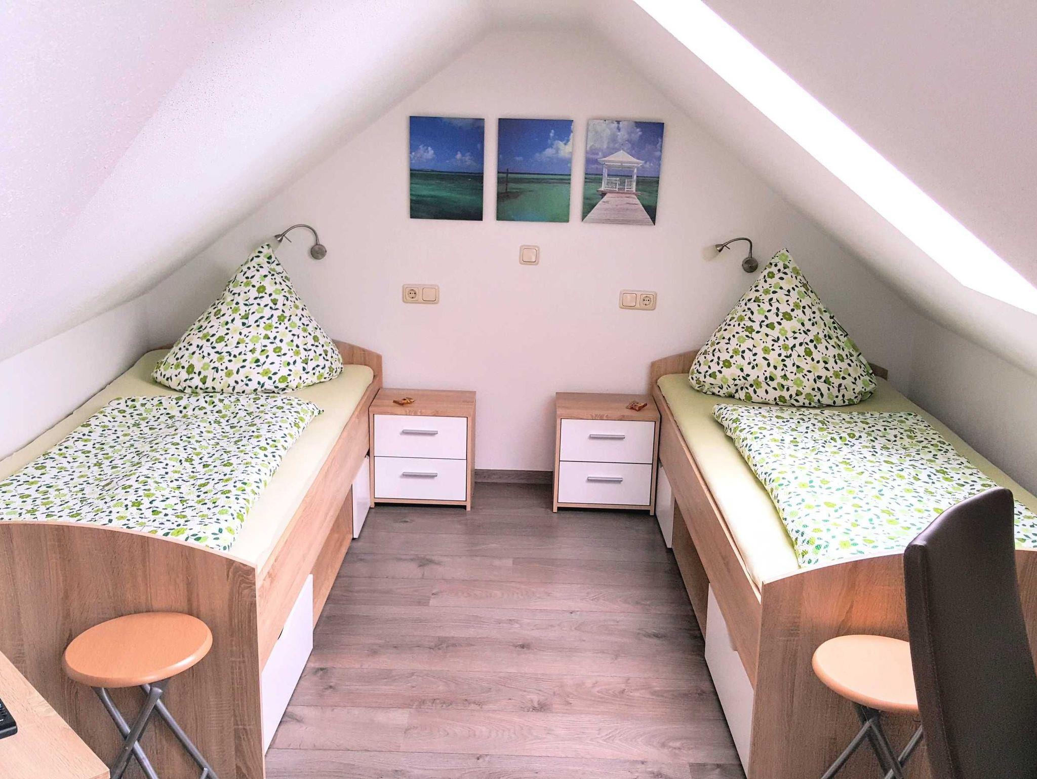 Das kleine Schlafzimmer verfügt über zwei komfortable Betten mit geräumigem Bettkasten, verstellbarem Kopf- und Fußteil sowie einer praktischen Nische. Über eine Raumspartreppe erreichen Sie ein zweites, kuscheliges Schlafzimmer im Dachgeschoss mit zwei Einzelbetten und zusätzlichem Flachbildfernseher samt DVD-Player -bestens geeignet sowohl für Familien mit Kindern als auch für befreundete Paare. Das moderne Bad ist mit Dusche und WC ausgestattet.