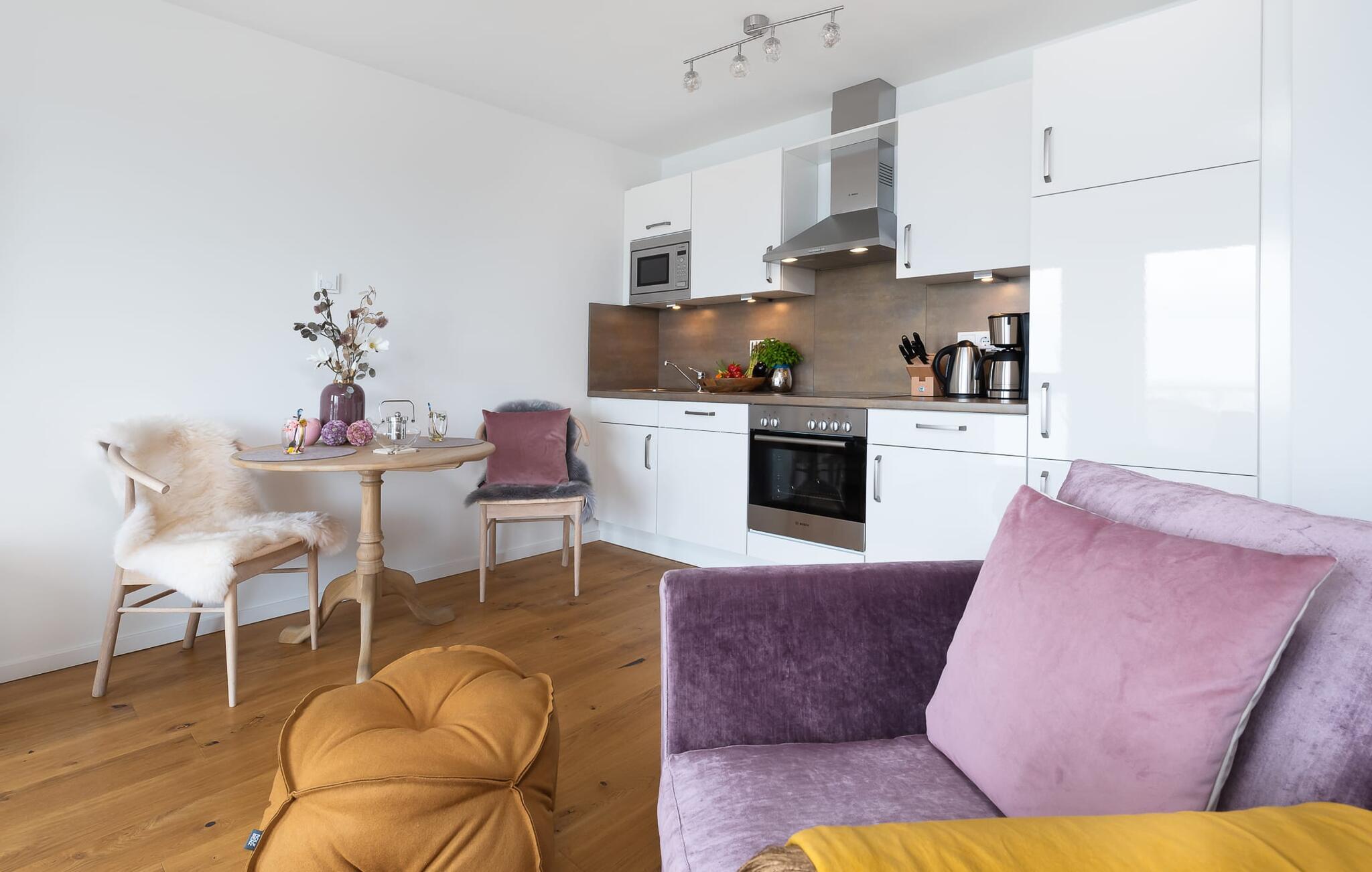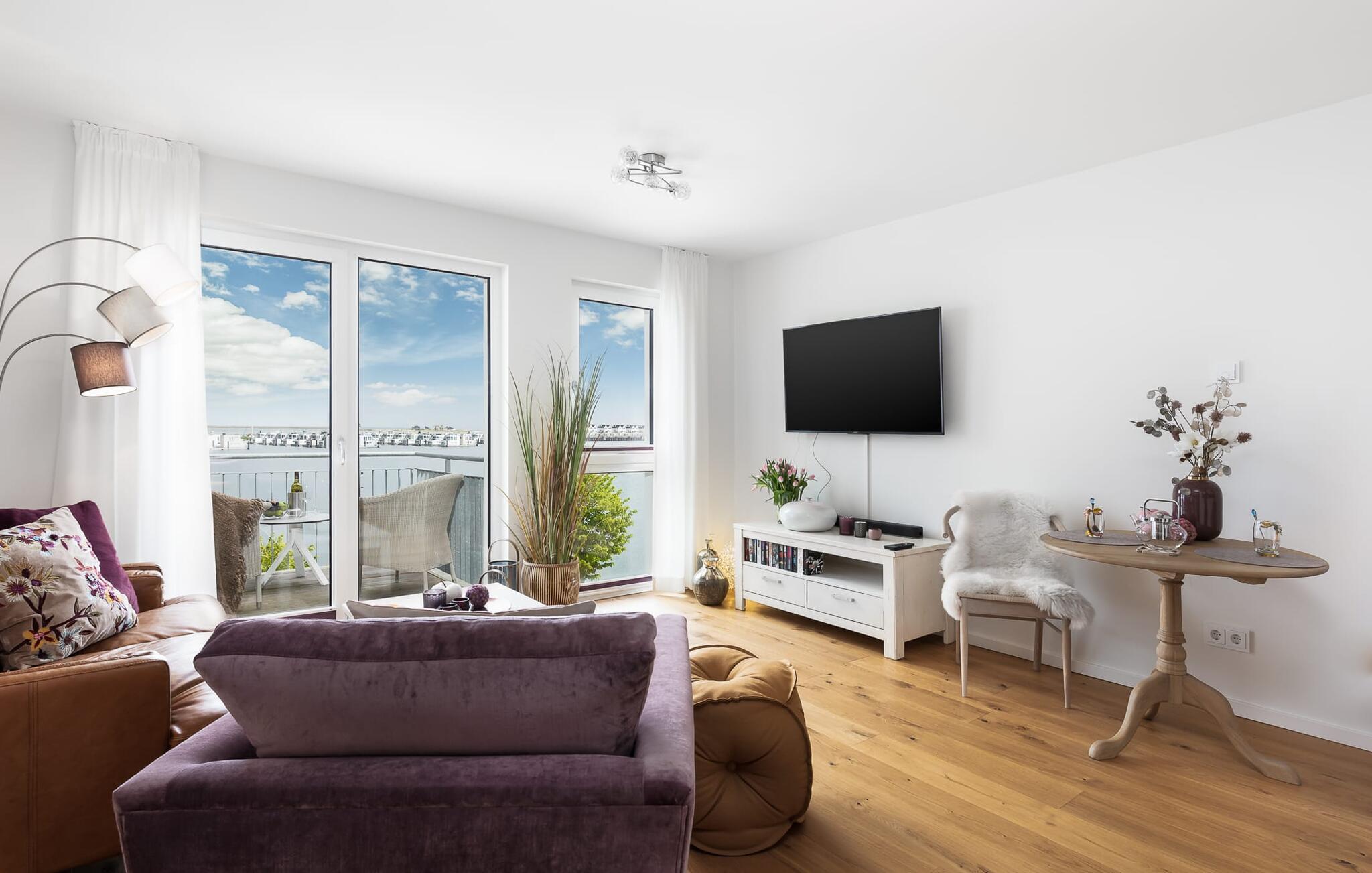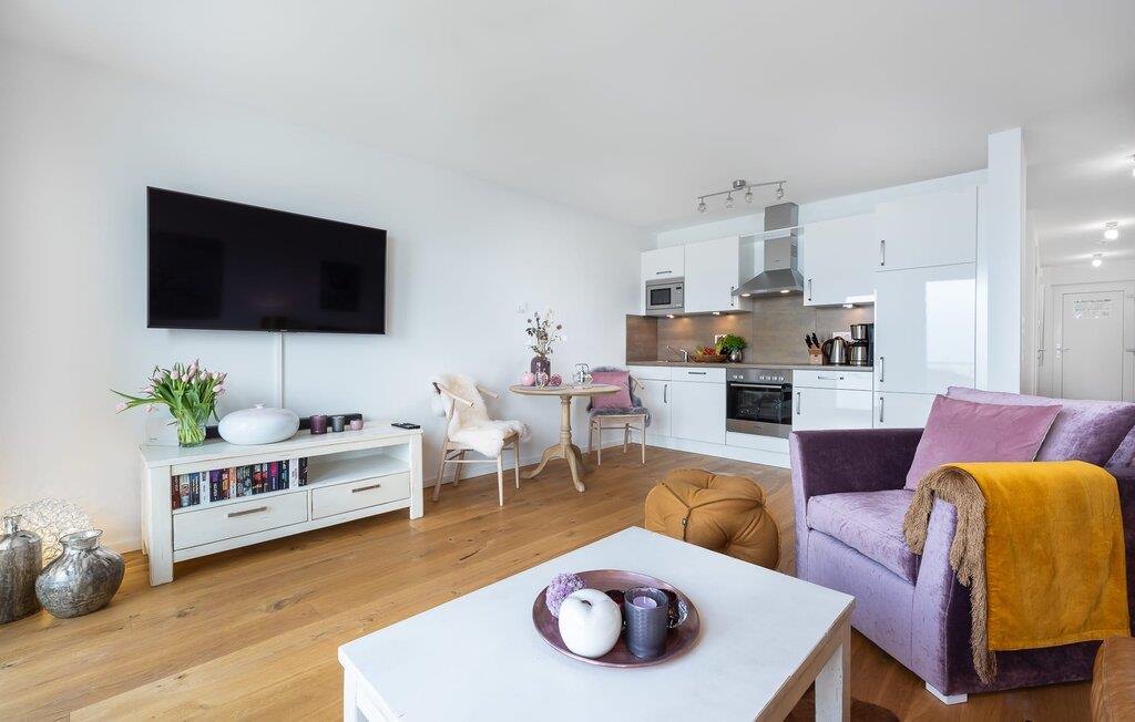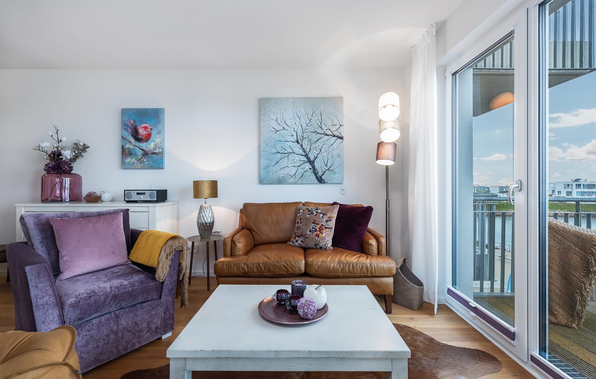 Vom Balkon könnt ihr ebenfalls am Tag das bunte Treiben im Hafen beobachten, aber auch die Hafenpromenade mit ihren Geschäften habt ihr im Blick, denn sie liegt euch direkt zu Füßen. Da der Wohnraum über bodentiefe Fensterelemente verfügt, kann man das Hafenkino zu jeder Jahreszeit vom Sofa aus sehr genießen.