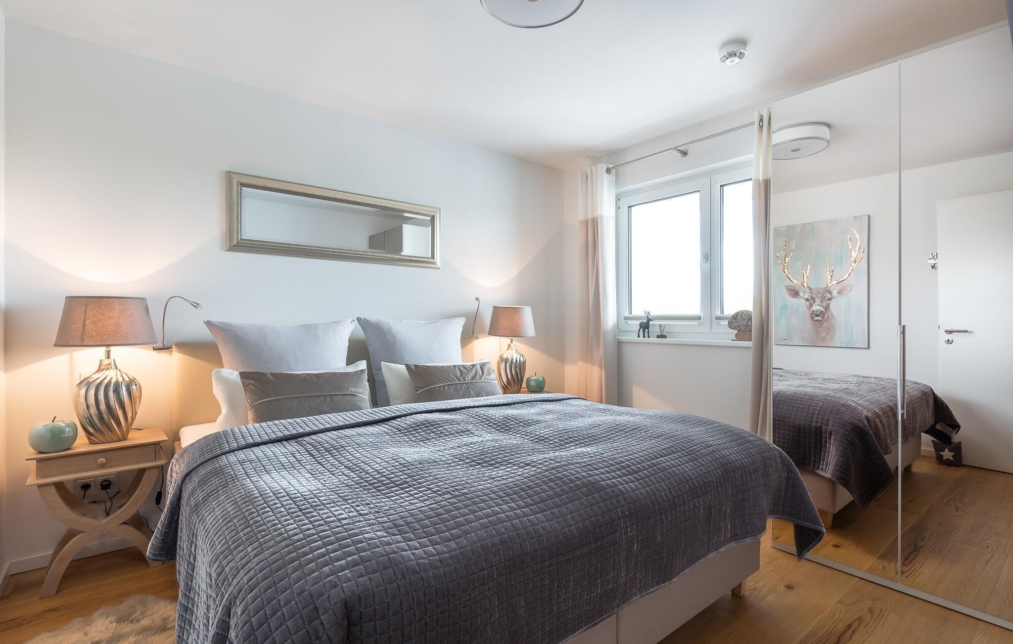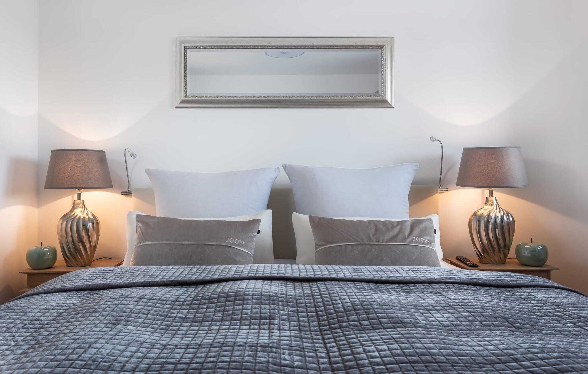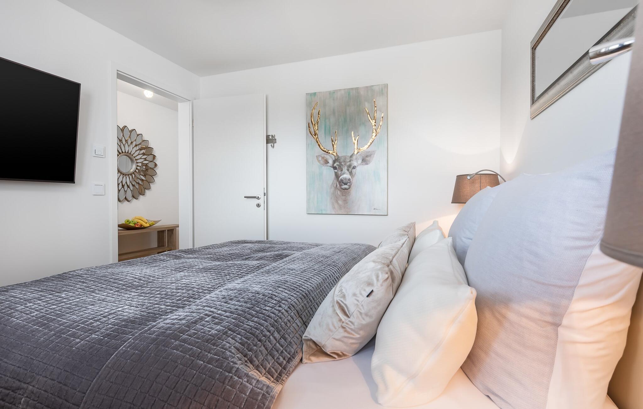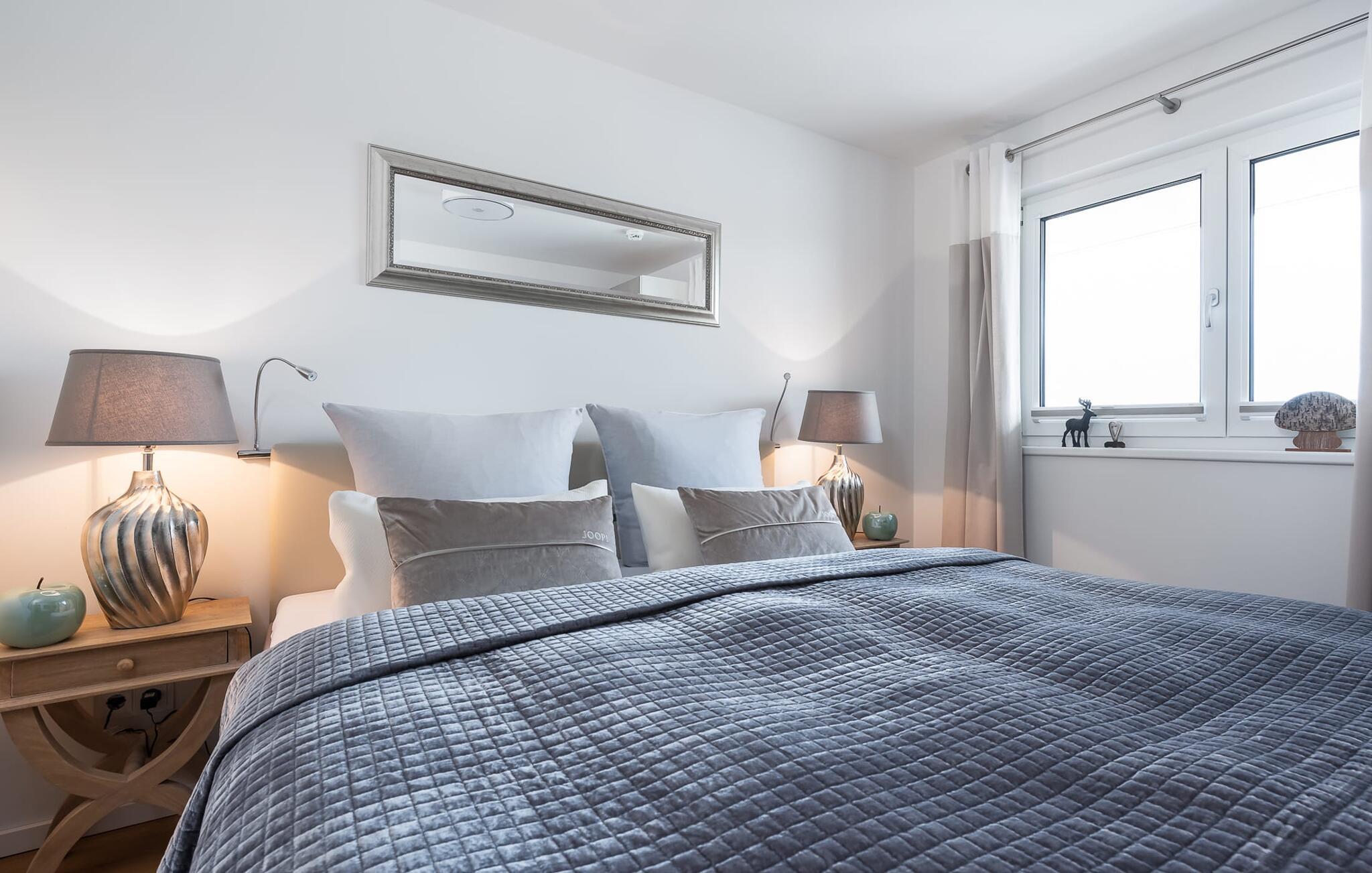Das gleichermaßen luxuriös eingerichtete Schlafzimmer bietet neben einem großen Boxspringbett einen zweiten 55-Zoll Fernsehervielleicht zur Abwechslung mal ein anderes Programm?