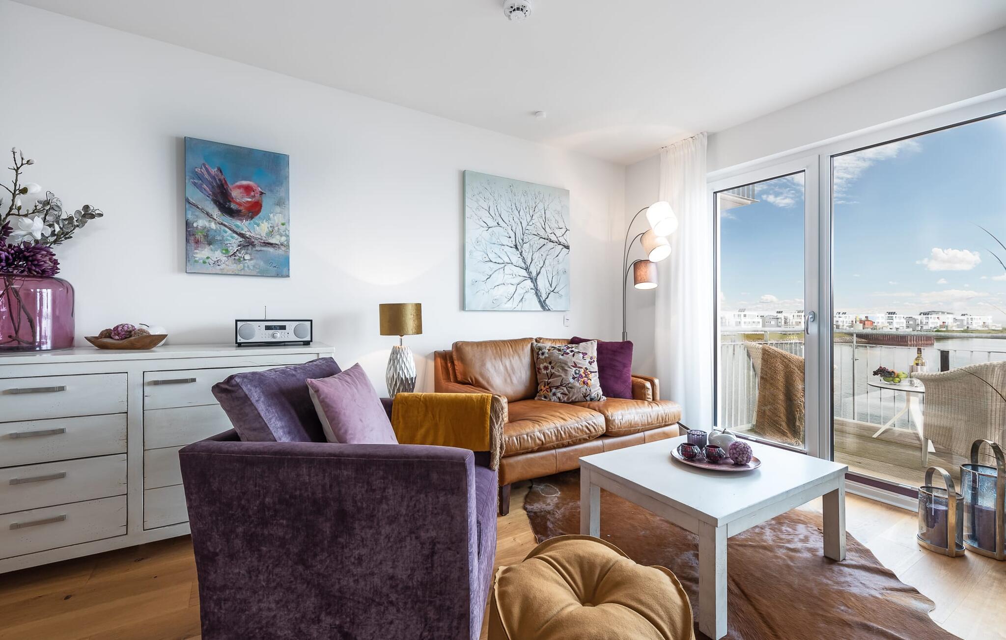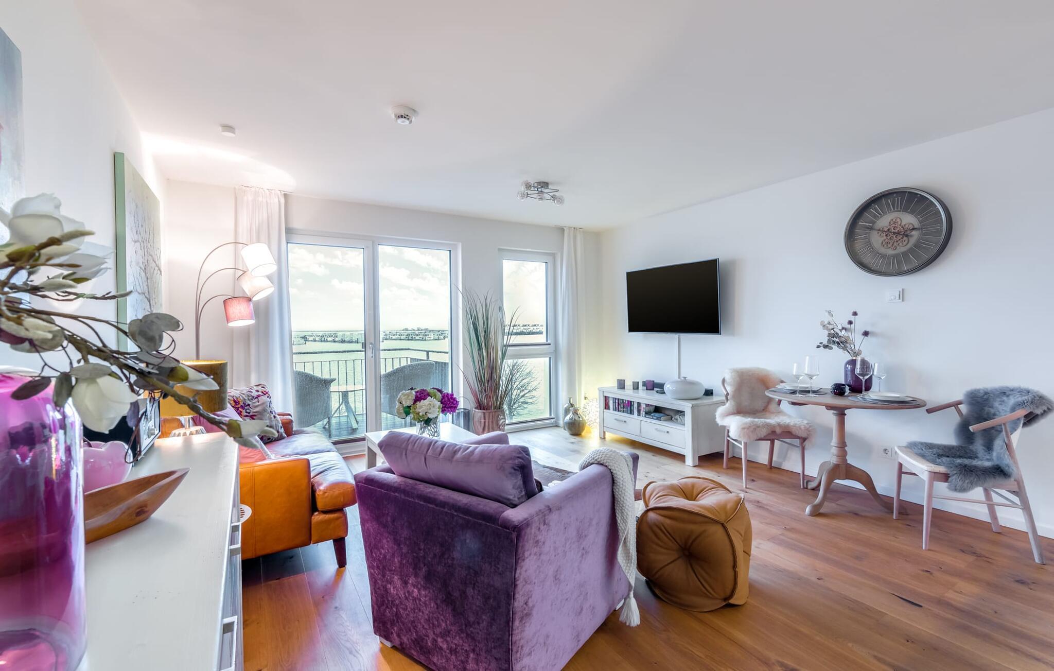 Moderne Ferienwohnung Harbours Love Side am Sportboothafen mit traumhaftem Blick auf die Schlei und gemütlichem Balkon.