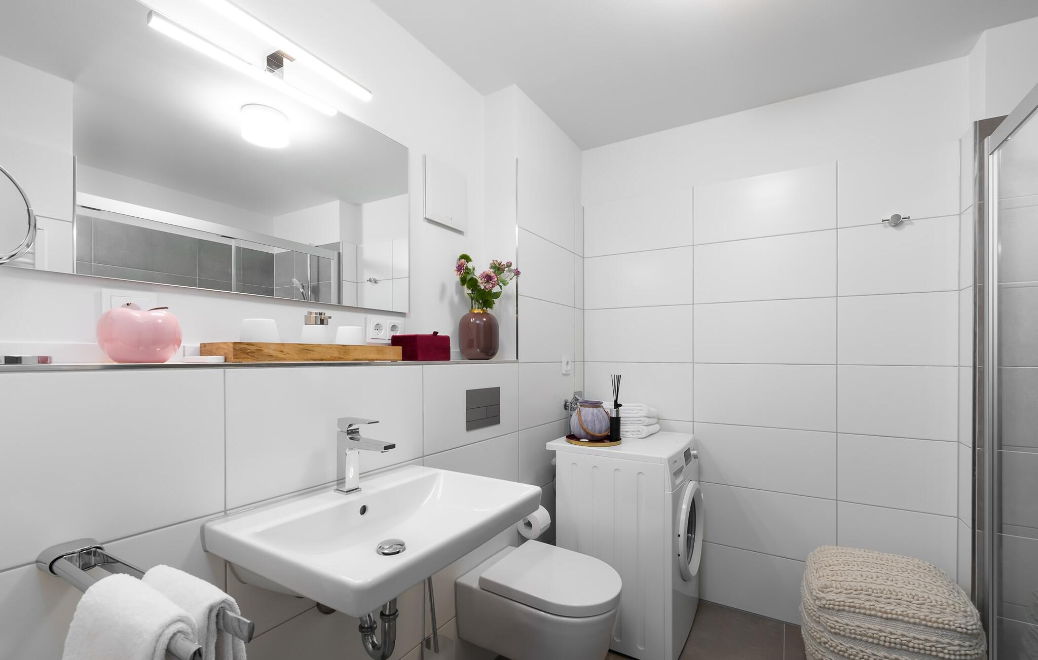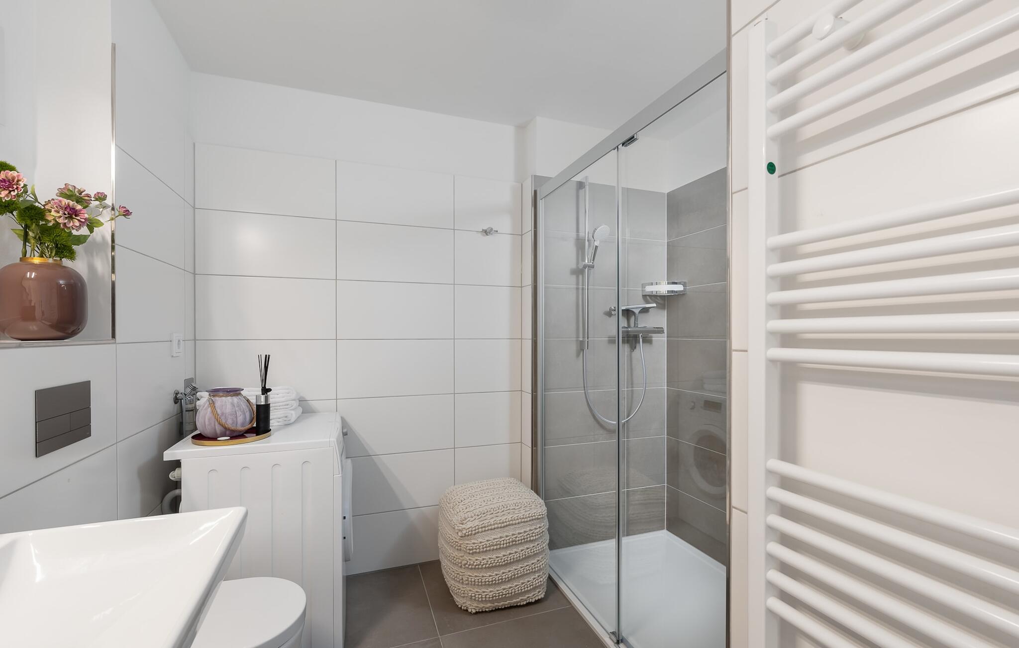 Das geräumige Bad mit seiner bodengleichen großzügigen Dusche ist perfekt ausgestattet für den Start in den Tag.