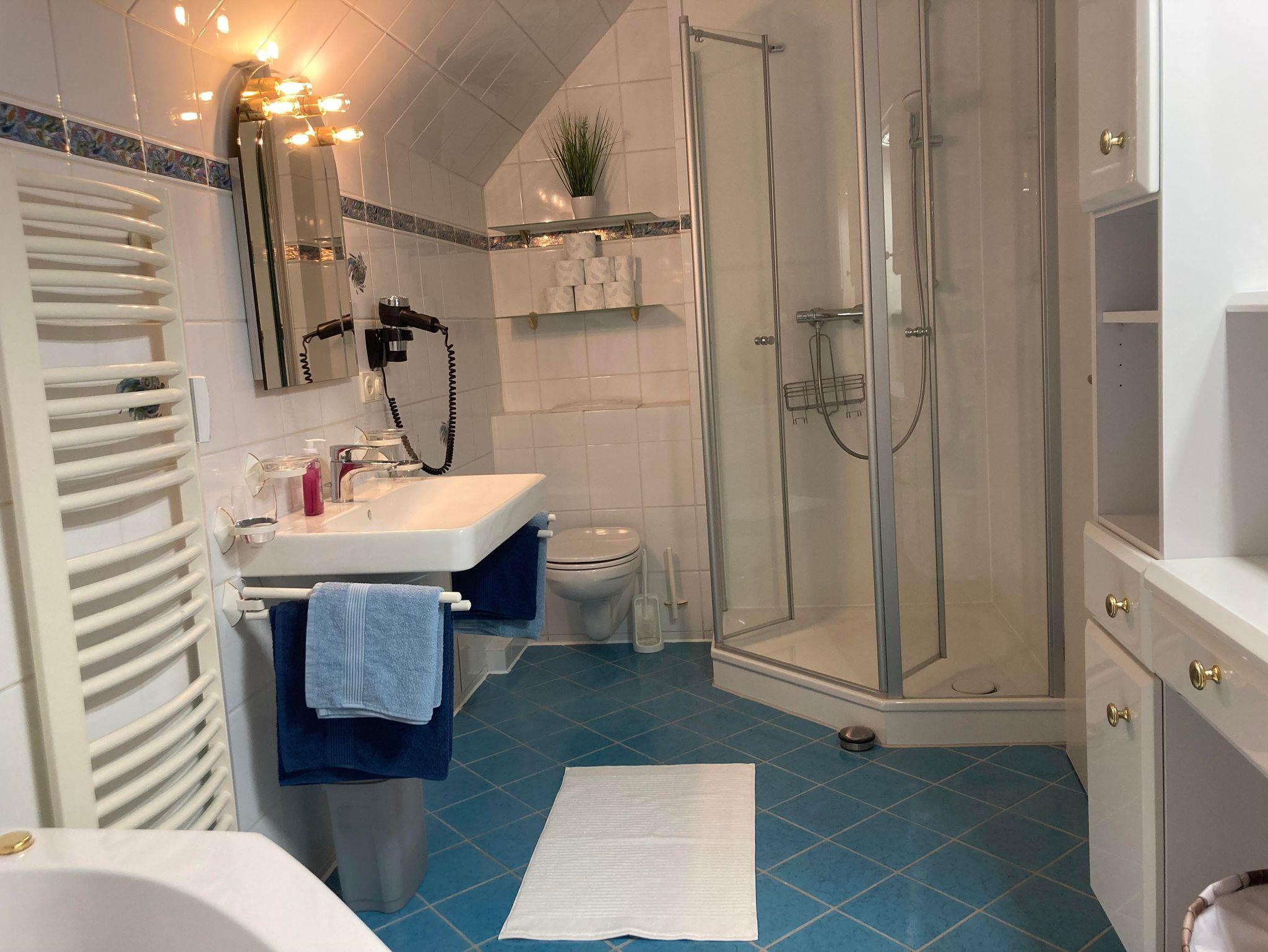 • Bad mit WC, Dusche, Waschbecken, Haartrockner und großer Badewanne