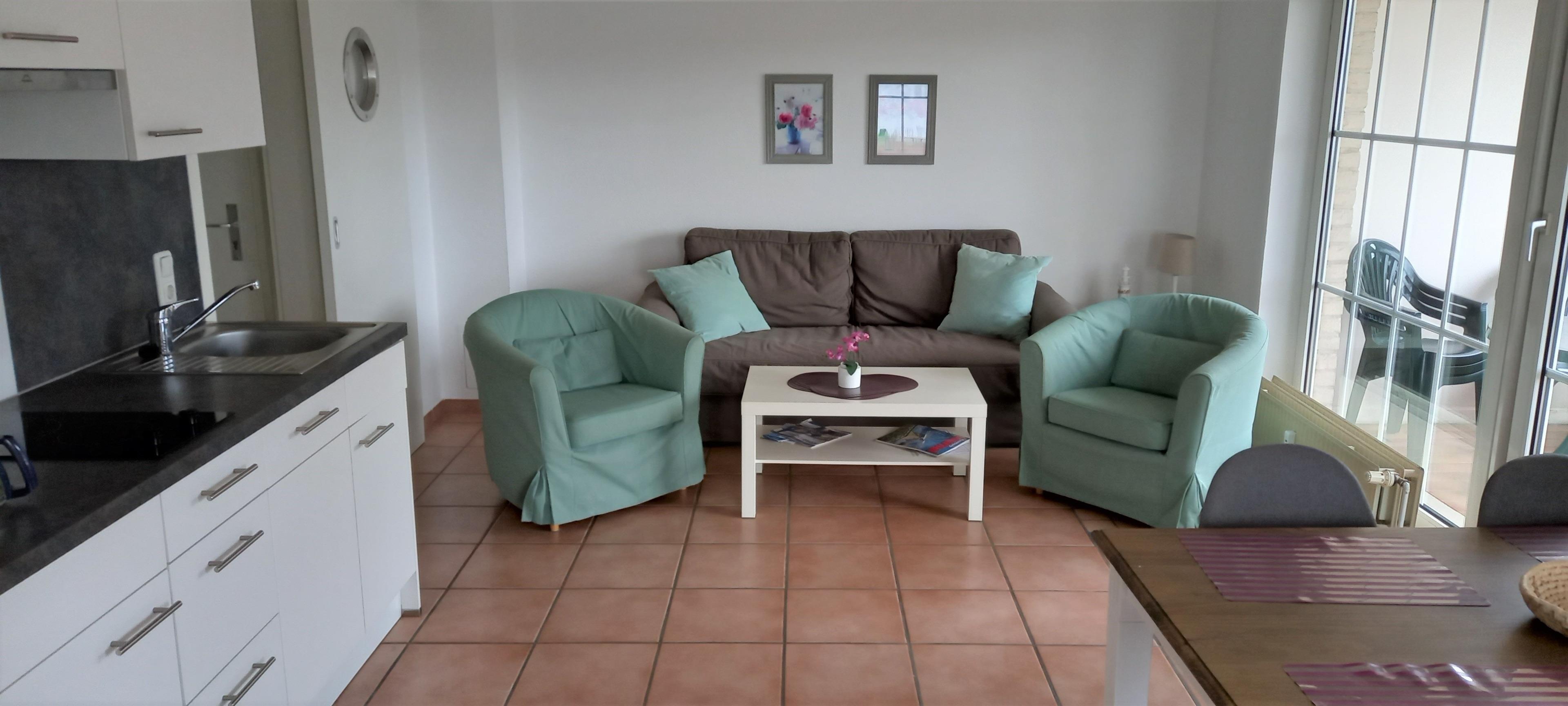 Durch eine große Fensterfront dringt viel Tagelicht in den großzügigen Wohn- und Essbereich mit offener Küche.? Der WOHNBEREICH lädt mit einem Schlafsofa (180x200 cm), zwei Cocktailsesseln und einem Sofatisch zu gemütlichen Abenden in familiärer Gemeinschaft ein. Ein Flachbild-TV mit Radiofunktion sowie kostenfreies WLAN sorgen für Unterhaltung. Vom Wohnbereich gelangen Sie außerdem auf den Meerblick-Balkon.