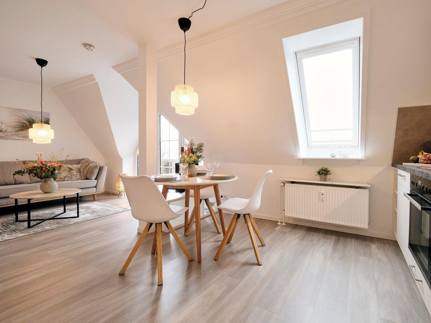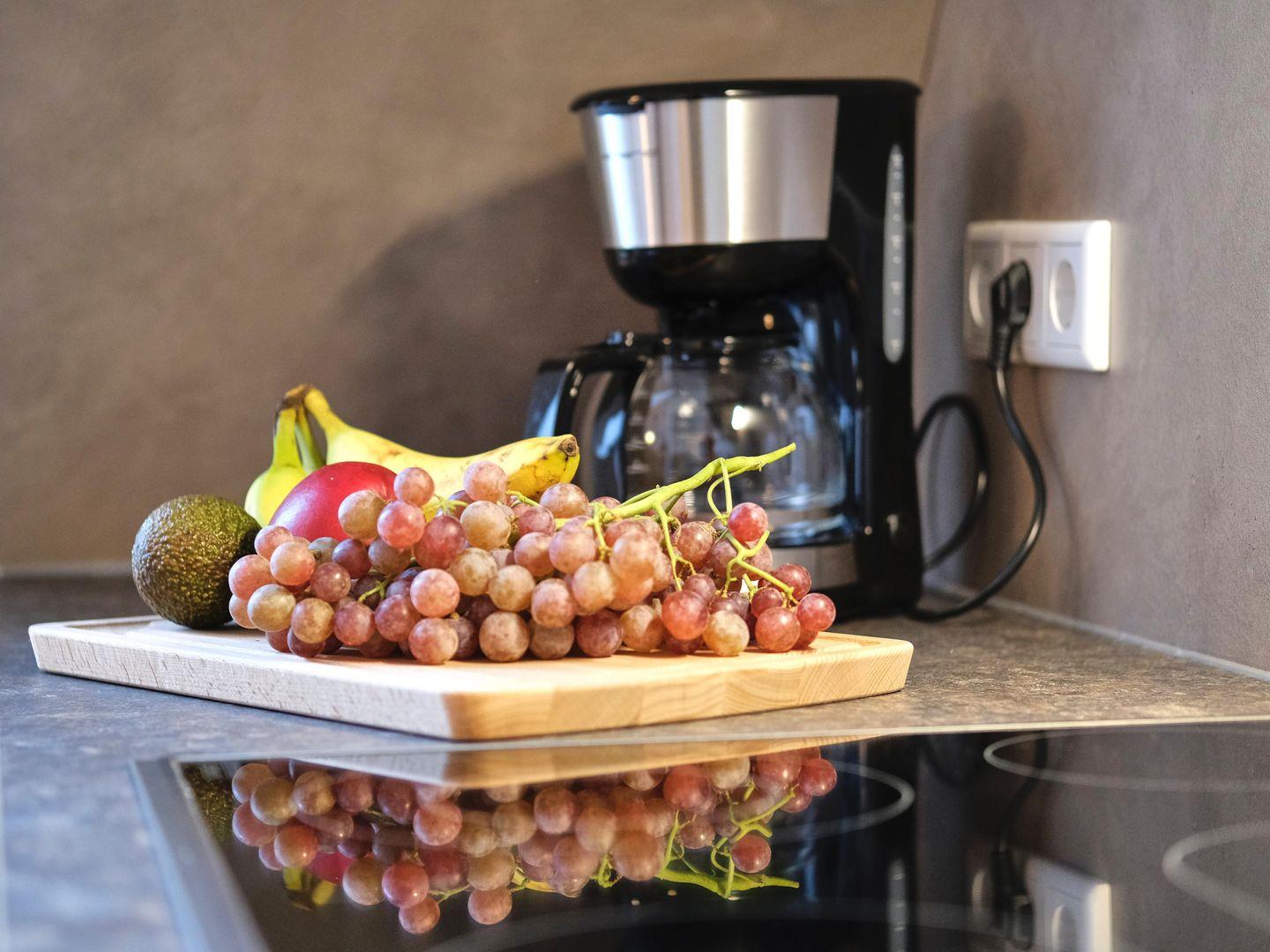 Die neue, moderne und gut ausgestattete Einbauküche eignet sich für Selbstversorger. Es gibt einen runden Esstisch mit 3 Stühlen, eine wunderschöne, bequeme Couch und einen Ohrensessel für gemütliche, entspannende Stunden.