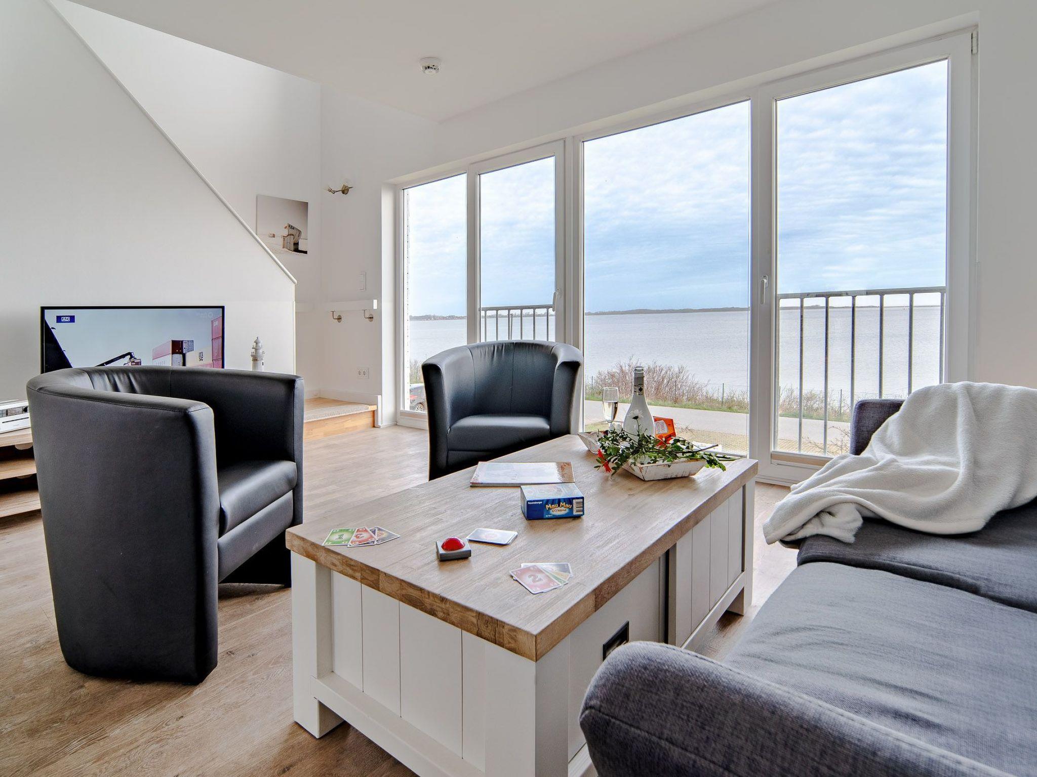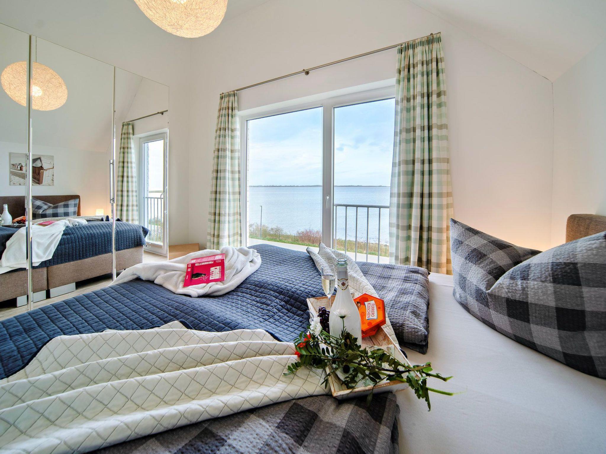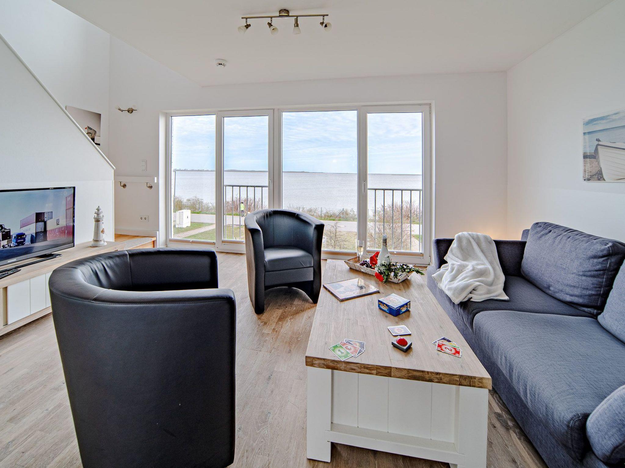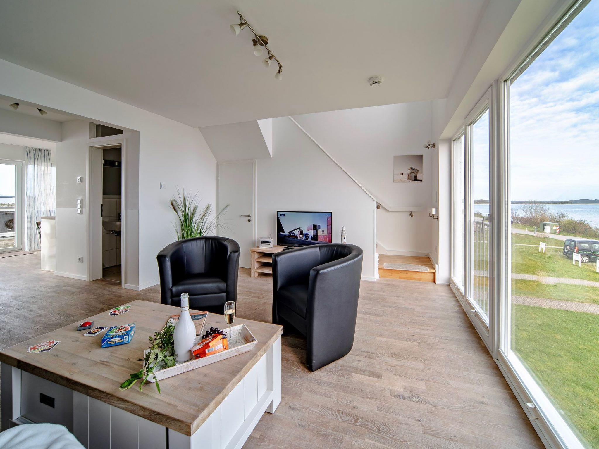 Ferienwohnung Kaptein`s Lounge by Seeblick Ferien ORO für 2-6 Personen auf zwei Ebenen im Obergeschoß + Dachgeschoß mit 180 Grad-Panorama-Blick sowohl auf den Hafen von Port Olpenitz im Süden und auf die Schlei mit den vielen vorbeifahrenden Segelschiffen, Maasholm und Schleimünde im Norden!Die Steigerung von traumhaft??? Kapteins Lounge by Seeblick Ferien Olpenitz!Der Blick dieser Maisonette-Wohnung auf zwei Ebenen im Ober- und Dachgeschoß des Hafenhauses am Kaianleger im OstseeResort Olpenitz mit 93 qm Wohnfläche ist wirklich unbeschreiblich! Durch die großen Fensterflächen gelangt viel Licht in die Wohnung, so daß sie stets hell und einladend wirkt - und man fühlt sich hier fast mehr wie auf der "Kommandobrücke" eines (Kreuz-) Schiffs als in einer Ferienwohnung! Den Lebensmittelpunkt dieses loftartig gestalteten Feriendomizils bietet die Eingangsebene im 1. Obergeschoß, in dem die Räume fast fließend ineinander übergehen. Das geräumige und einladende Wohnzimmer hat einen unbeschreiblichen Ausblick auf die Schlei und ist der ideale Treffpunkt für die ganze Familie, auch bei kühleren Jahreszeiten, wenn der eingebaute Kamin prasselt. Über den angrenzenden Eßbereich mit offener Küche gelangt man zur großen Terrasse in Südausrichtung und einem 180 Grad-Panoramablick über den ganzen Hafen. Abgerundet wird diese Etage mit einem Gäste-WC und Dusche. Über eine bequeme Treppe gelangen Sie vom Wohnbereich ins Dachgeschoß zu den zwei Schlafzimmern und dem großzügigen Wellness-Bad mit Duche, großer Badewanne mit Whirlpoolfunktionen und einer Infrarotsauna. Und auch hier bietet sich überall ein unvergleichbarer Ausblick auf Hafen und Schlei. Direkt an der Ostsee in der Eckernförder Bucht entsteht auf dem Gelände eines ehemaligen Marinestützpunktes bei Kappeln an der Schlei ein neues Ferienresort mit dem Namen „OstseeResort Olpenitz“. Mehr Wasserblick als speziell in diesem außergewöhnlichen Ferienobjekt können Sie fast nirgendwo sonst haben: Nach Norden vom Wohn- und Schlafzimmer aus auf Schlei und die vorbeifahrenden Segelschiffe, die Ostsee sowie den Leuchtturm von Schleimünde, und nach Süden von Eßbereich und großer Panorama-Terrasse aus auf das komplette Hafengebiet von Port Olpenitz!Diese Wohnung stellt wirklich ein ABSOLUTES HIGHLIGHT dar.