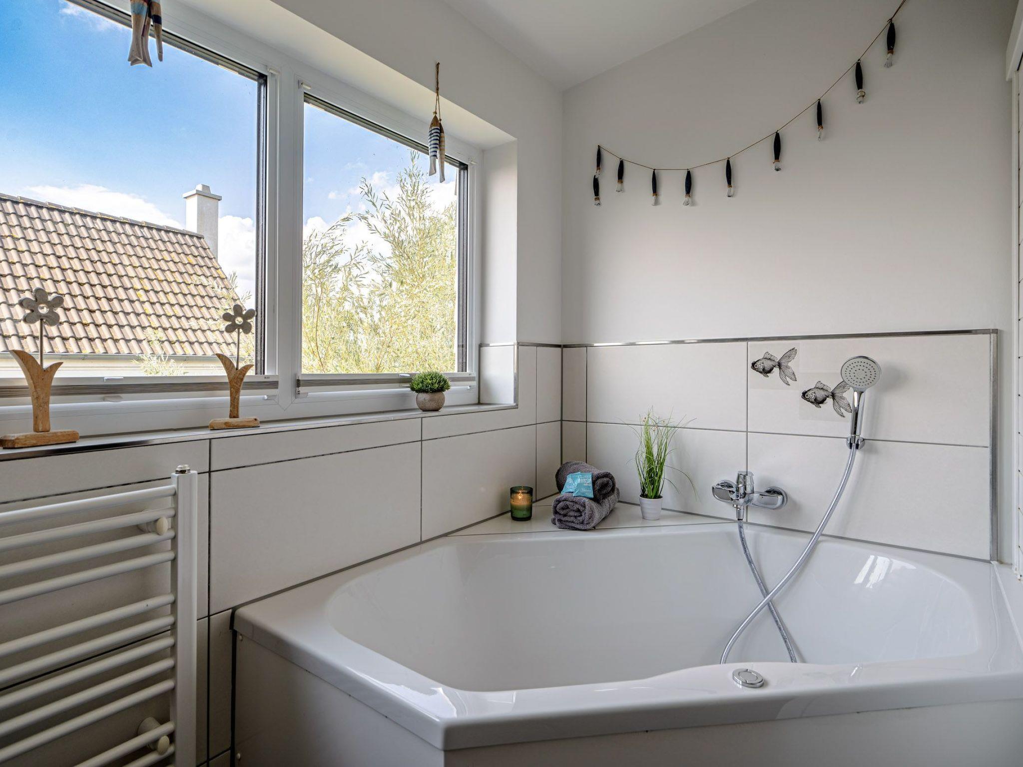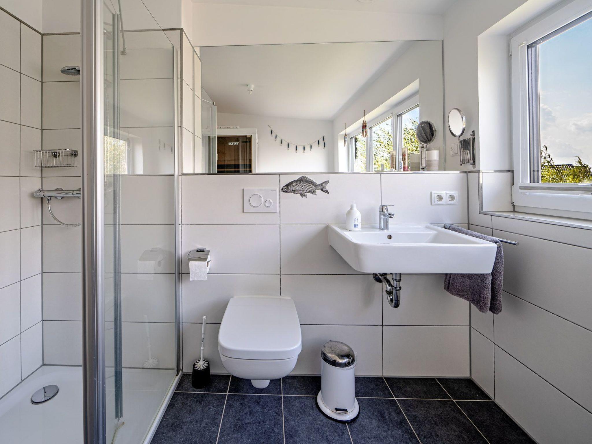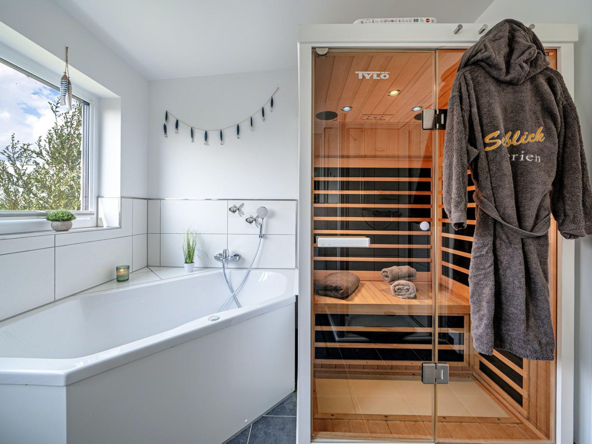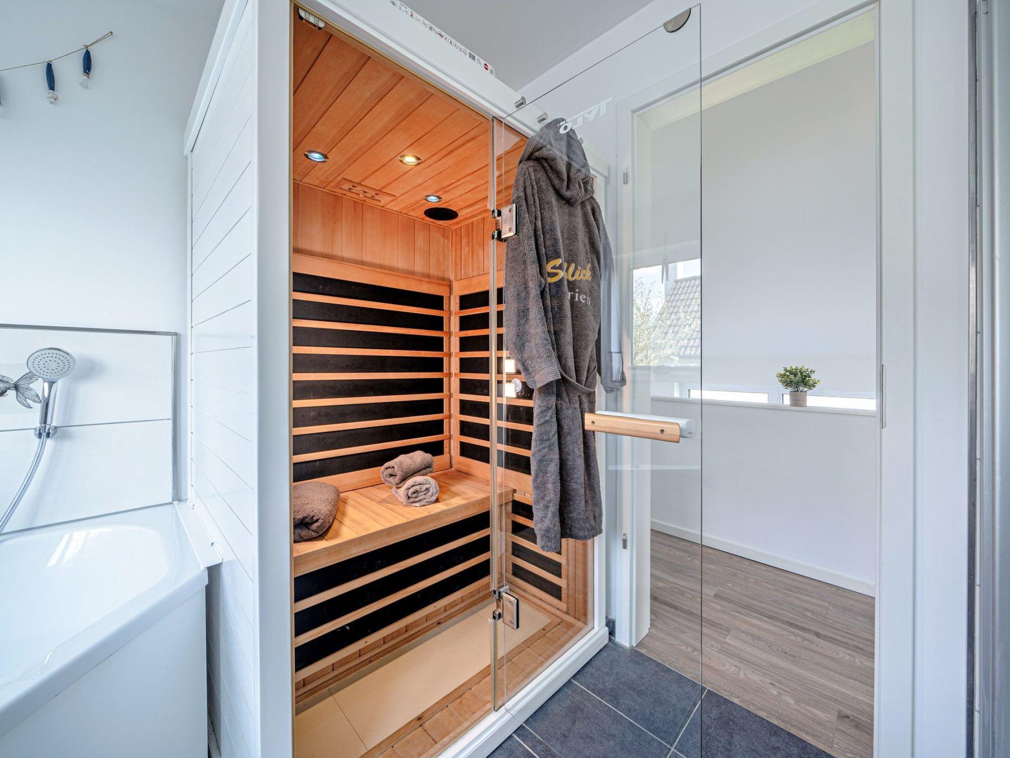 Das Ferienhaus bietet Ihnen den Luxus von zwei Badezimmern, jeweils auf einer Wohnebene. Entspannen Sie in der Infrarot-Sauna oder der großzügigen Badewanne mit Whirlpoolfunktionen und genießen Sie dabei den Blick auf das Wasser im ersten Obergeschoss.