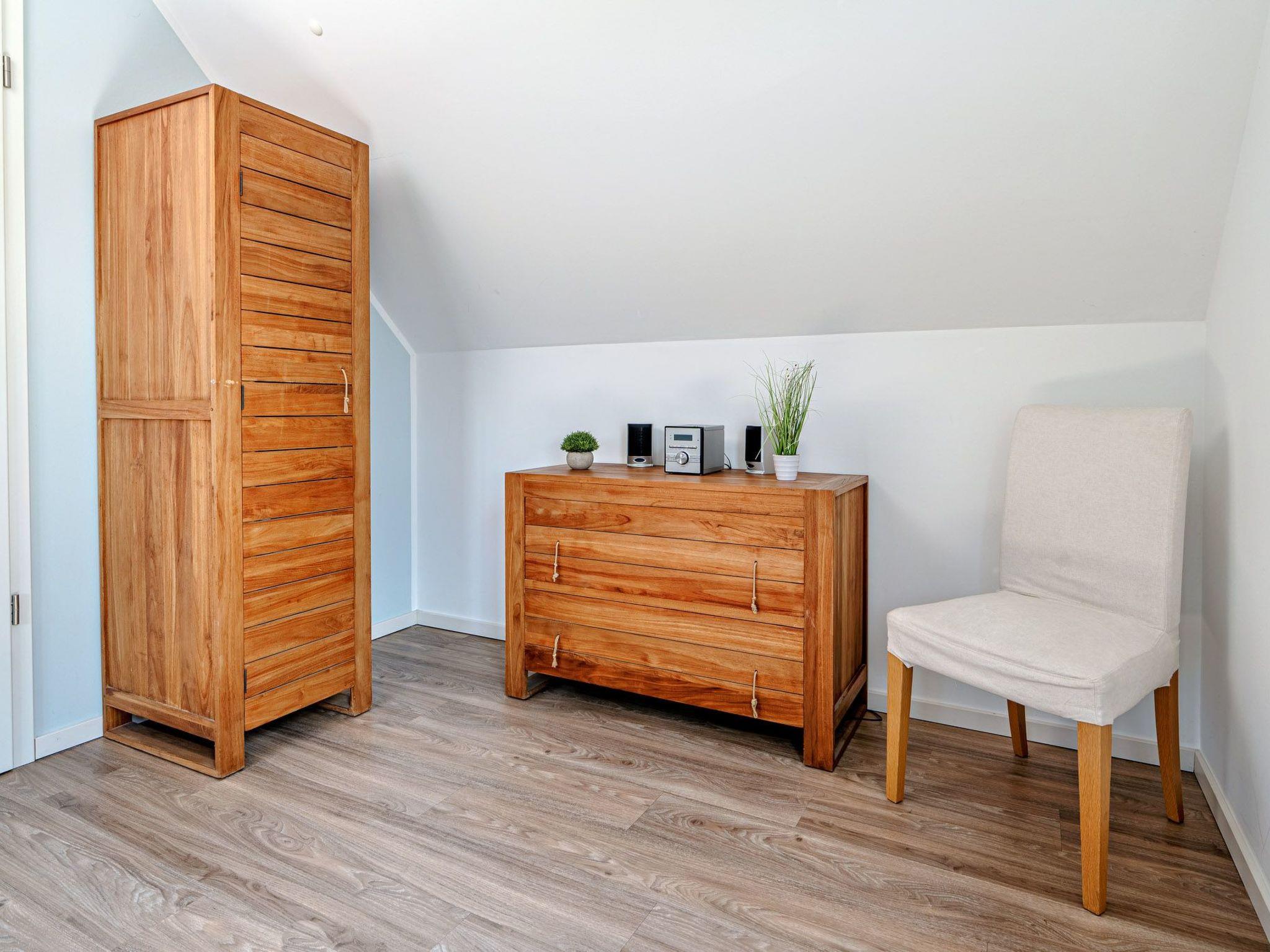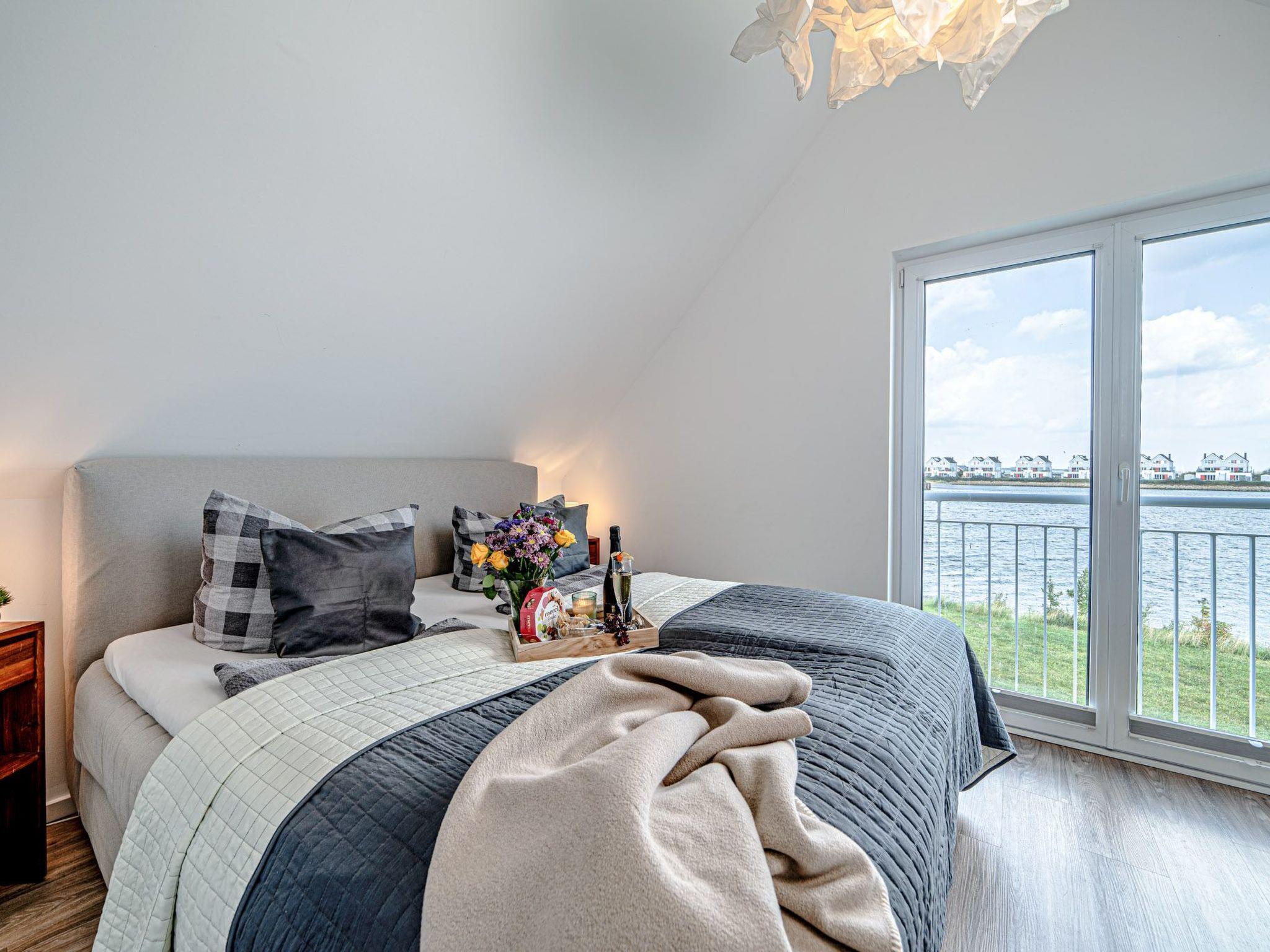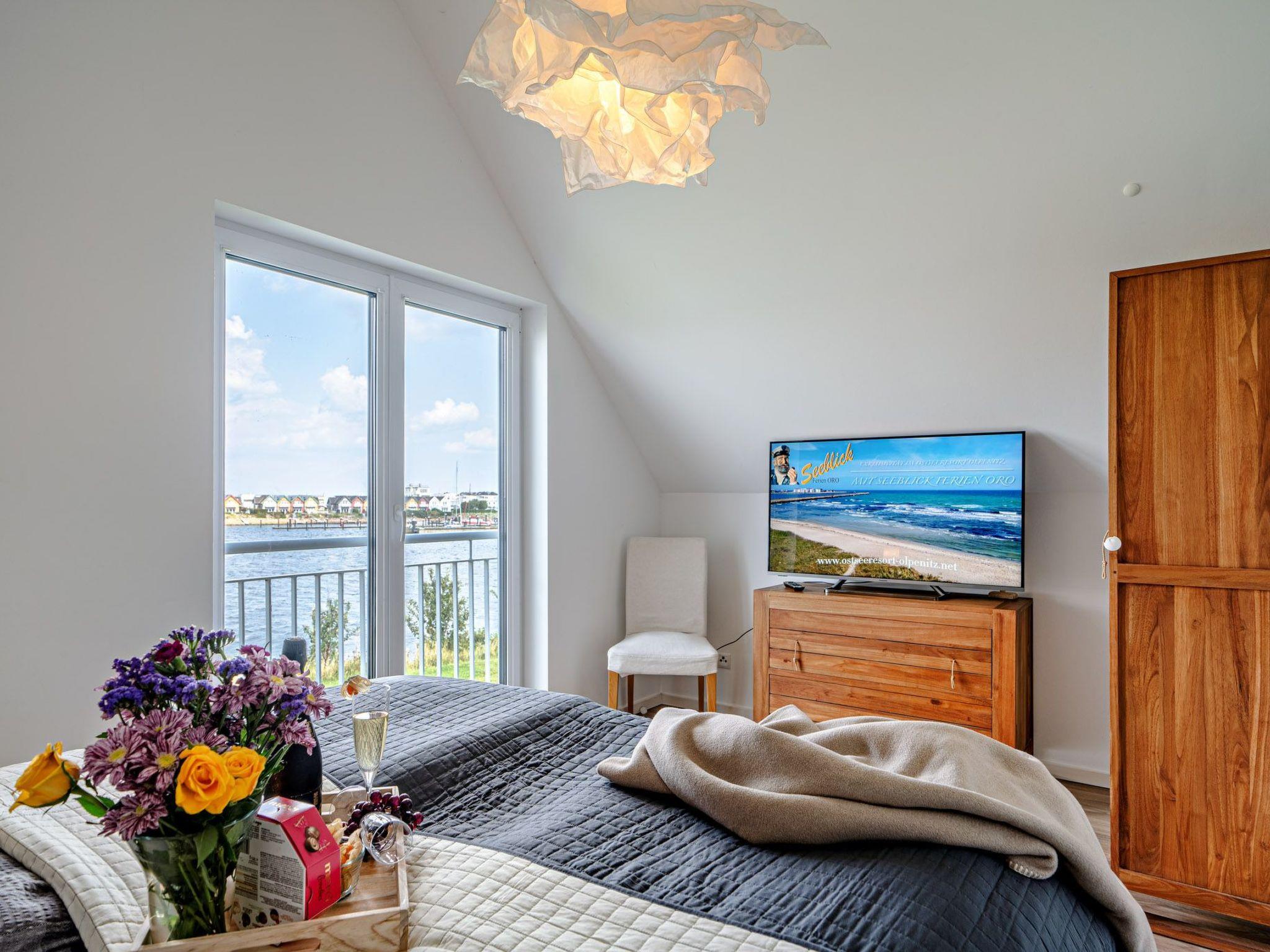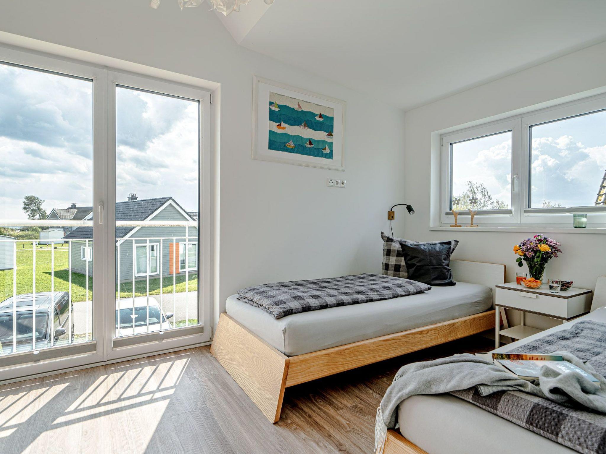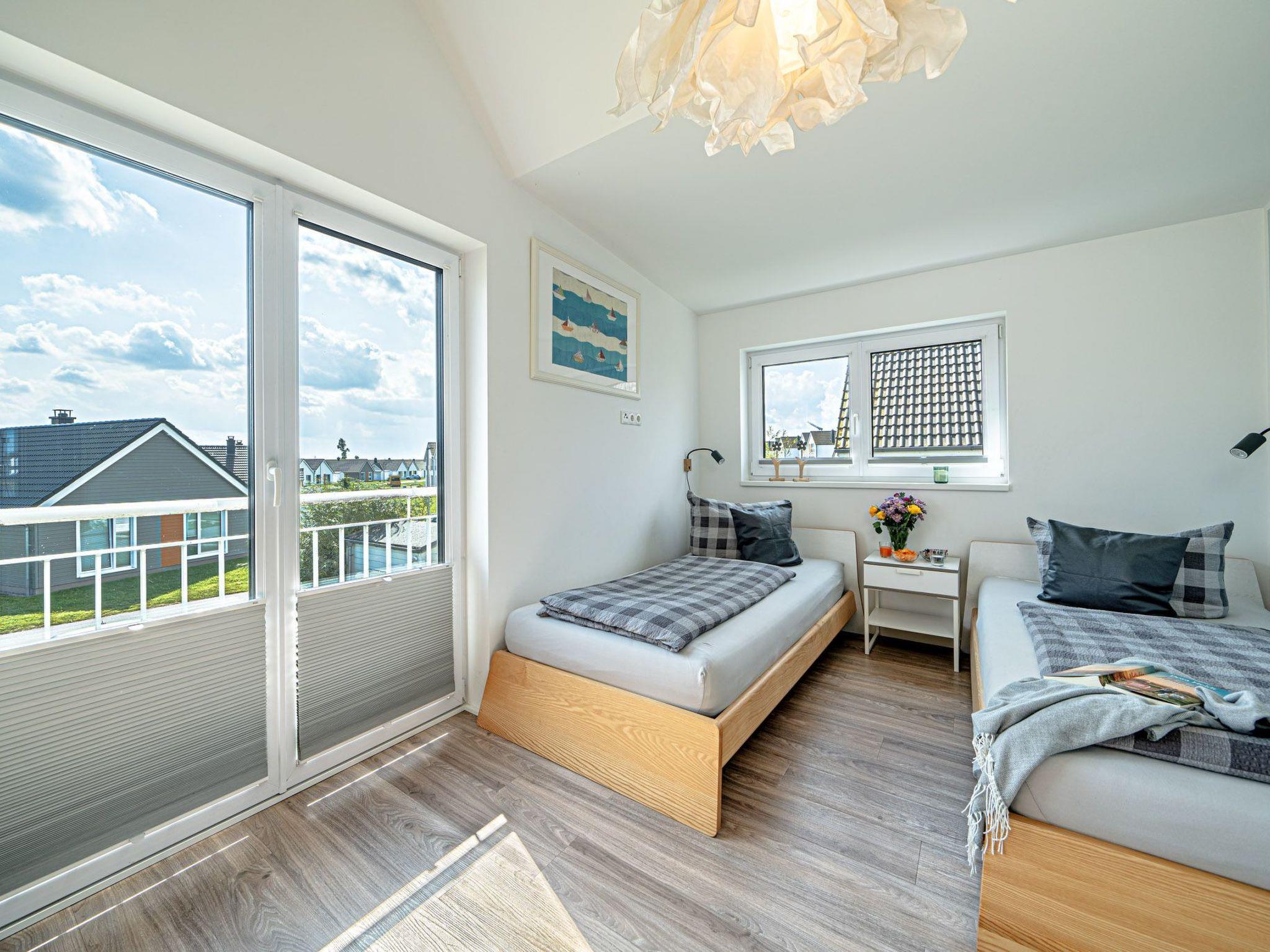Im ersten Obergeschoss erwartet Sie ein stilvoller Ruhebereich mit atemberaubendem Blick über das weite Meer. Das Hauptschlafzimmer mit Smart TV und einem komfortablen Boxspringbett und das zweite Schlafzimmer mit zwei Einzelbetten bieten erholsamen Schlaf. Ein Babybett steht ebenfalls bereit.