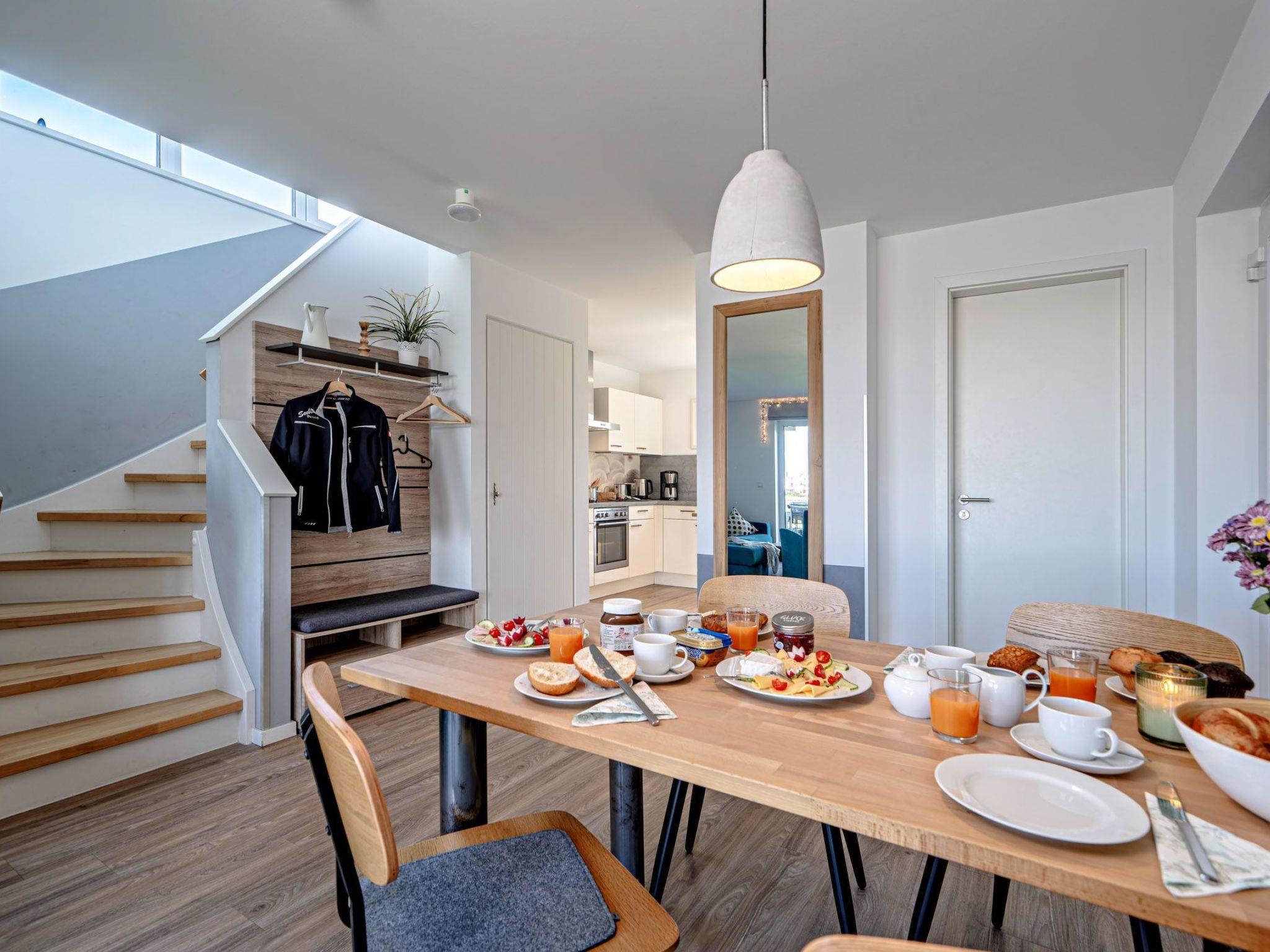 Der Einrichtungsstil des Hauses vereint moderne Eleganz mit maritimem Flair. Natürliche Materialien und harmonische Farbakzente schaffen eine einladende Atmosphäre.