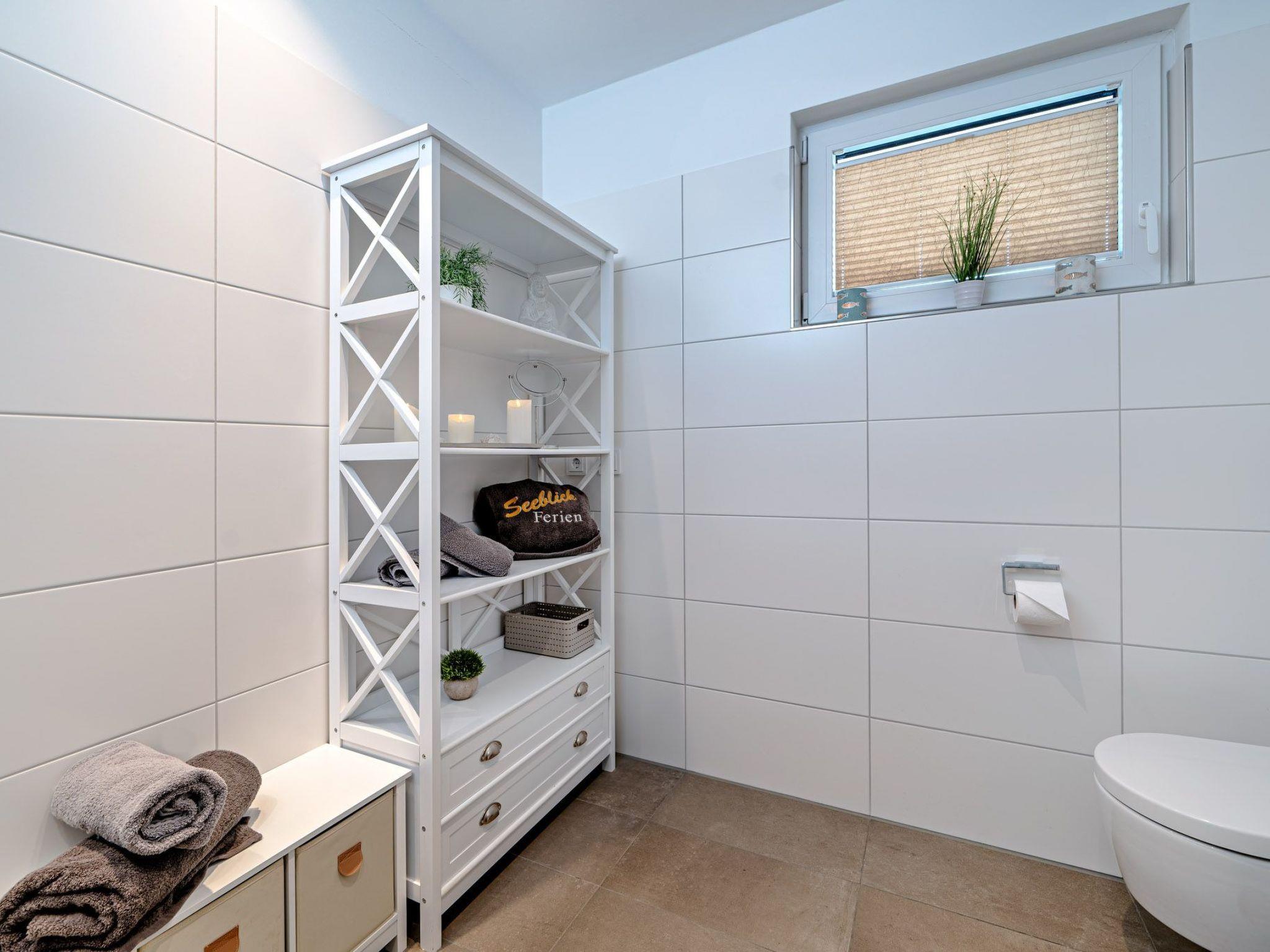 Das großzügige Badezimmer mit einer bodengleichen, großen Dusche ist ein weiteres Highlight der Kleinen Auszeit by Seeblick Ferien ORO und macht das Duschen zum Vergnügen. Für beste Unterhaltung sorgen smarte Fernseher mit Magenta TV im Wohnzimmer 49 Zoll und in beiden Schlafzimmern 43 Zoll sowie eine Spielesammlung.
