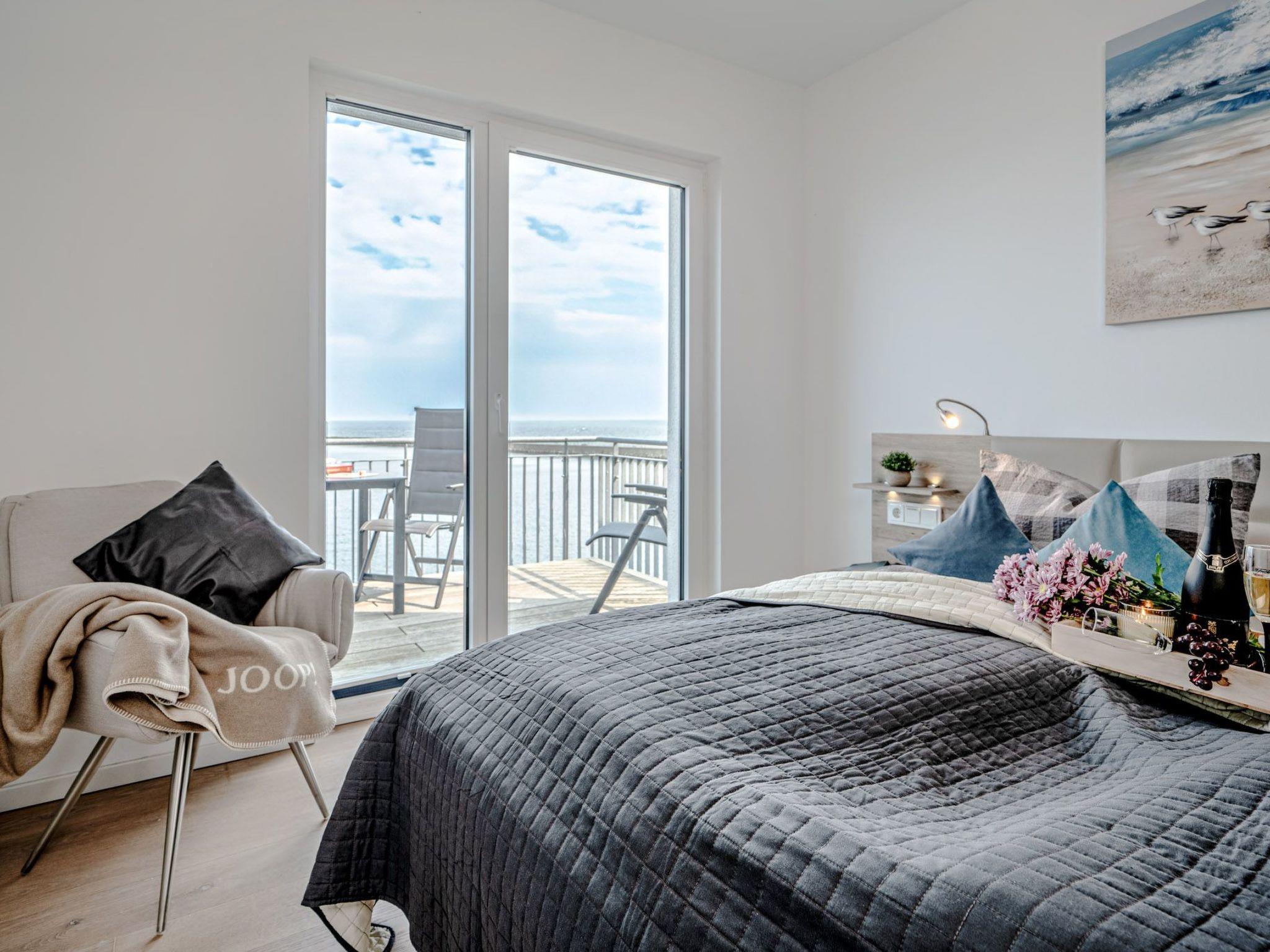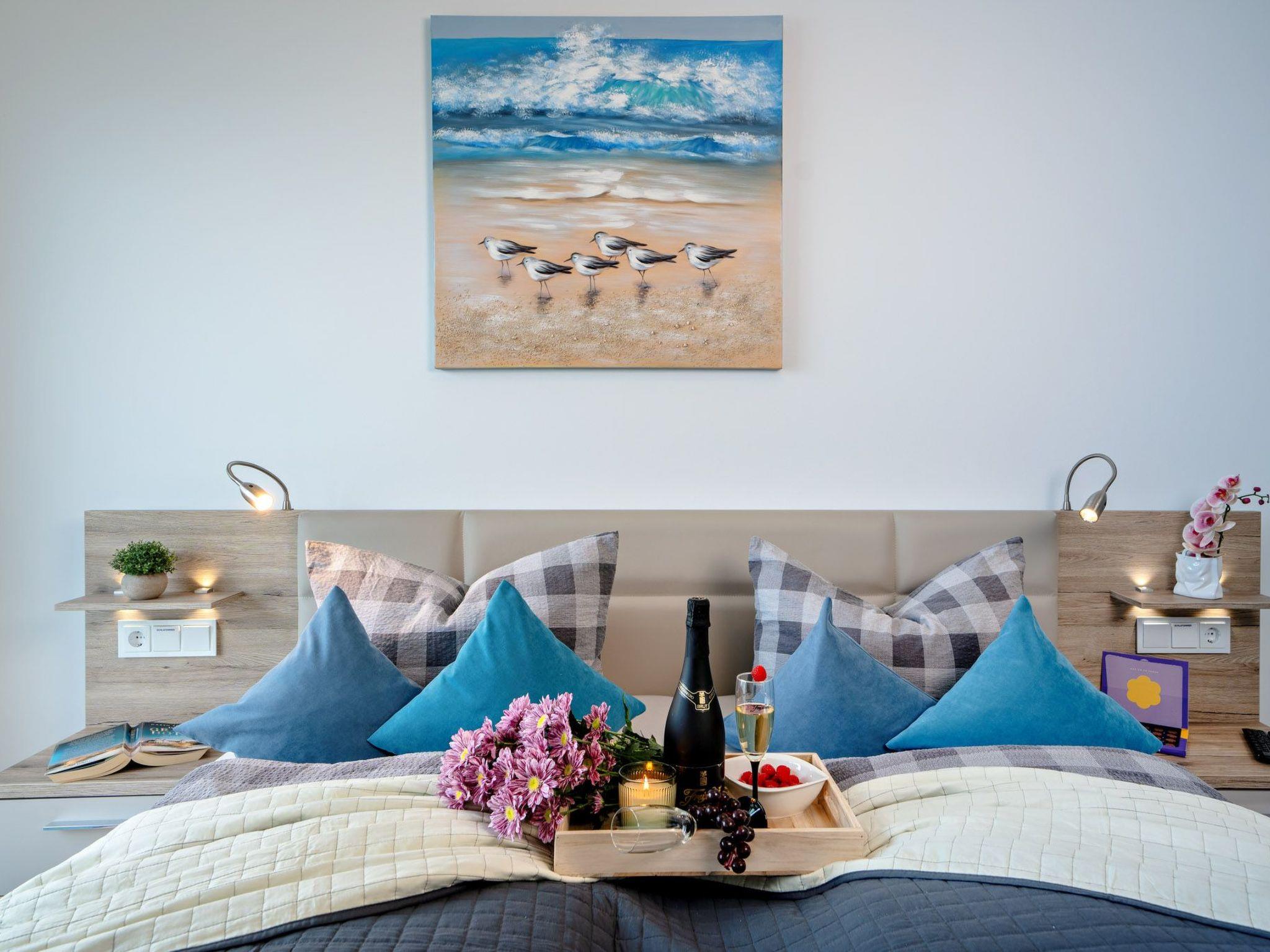 Beide Schlafzimmer bieten dank bodentiefer Fenster einen grandiosen Meerblick und haben direkten Zugang zu Balkonen. Das eine Schlafzimmer führt auf den Hauptbalkon, während das größere Schlafzimmer einen eigenen separaten Balkon besitzt. Hochwertige Doppelbetten mit individuell verstellbaren Lattenrosten garantieren erholsamen Schlafkomfort.