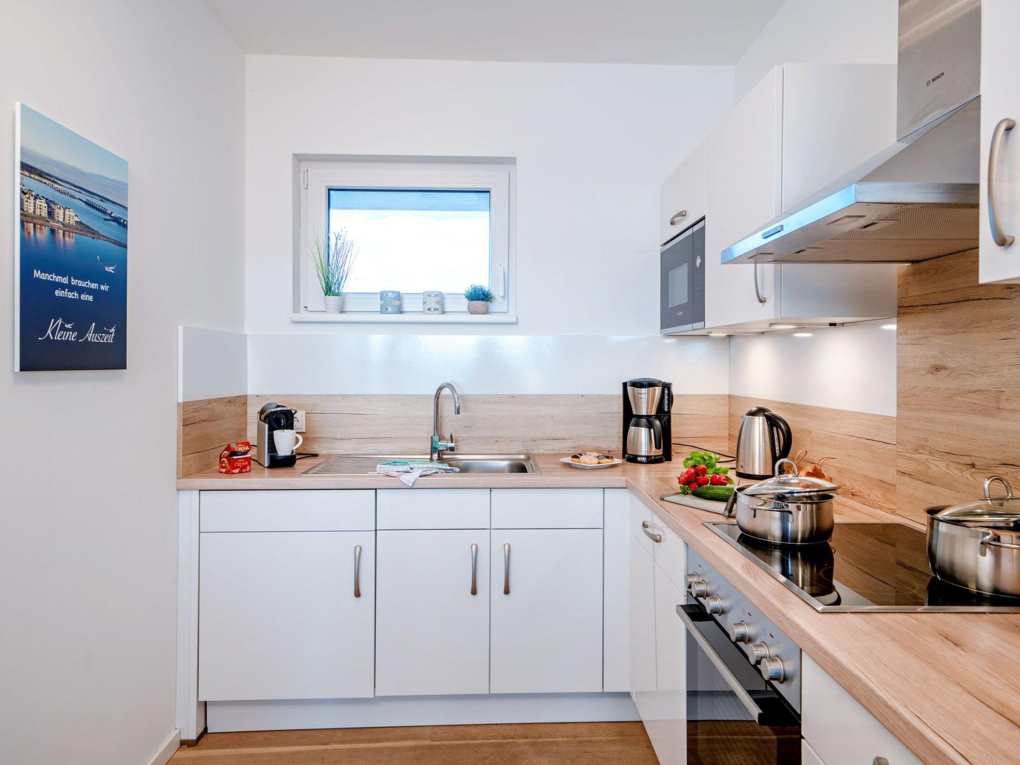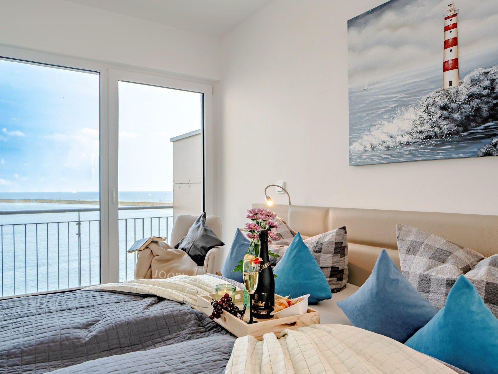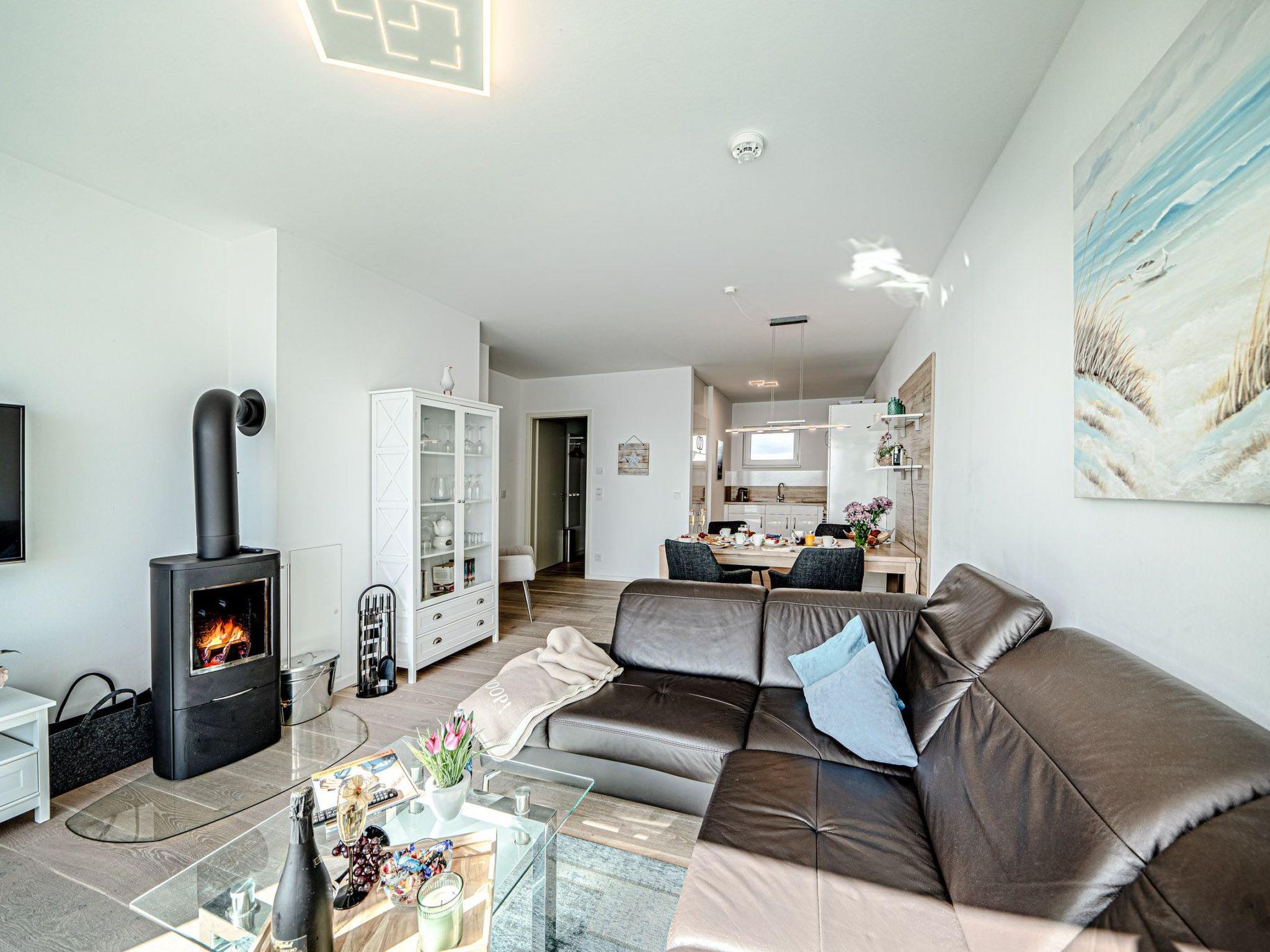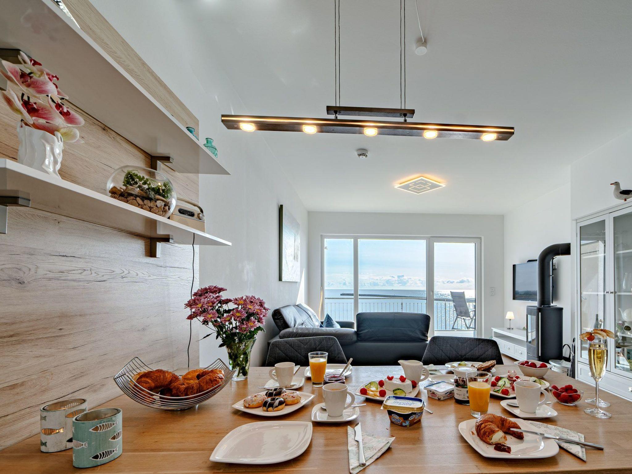 Die elegante Wohnung ist im modernen maritimen Landhausstil gehalten und verspricht zu jeder Jahreszeit Gemütlichkeit und Wohlfühlatmosphäre. Der offene Wohn-Essbereich ist lichtdurchflutet durch große bodentiefe Fenster, die das helle Echtholzparkett perfekt zur Geltung bringen. An kühlen Tagen sorgt die Fußbodenheizung in allen Räumen für wohlige Wärme. Bei stürmischem Wetter können Sie es sich auf der allergikerfreundlichen, aus Textilleder bestehenden, gemütlichen Wohnlandschaft bequem machen und dem Wellentreiben an der Hafeneinfahrt zuschauen, während im Kamin ein gemütliches Feuer knistert.