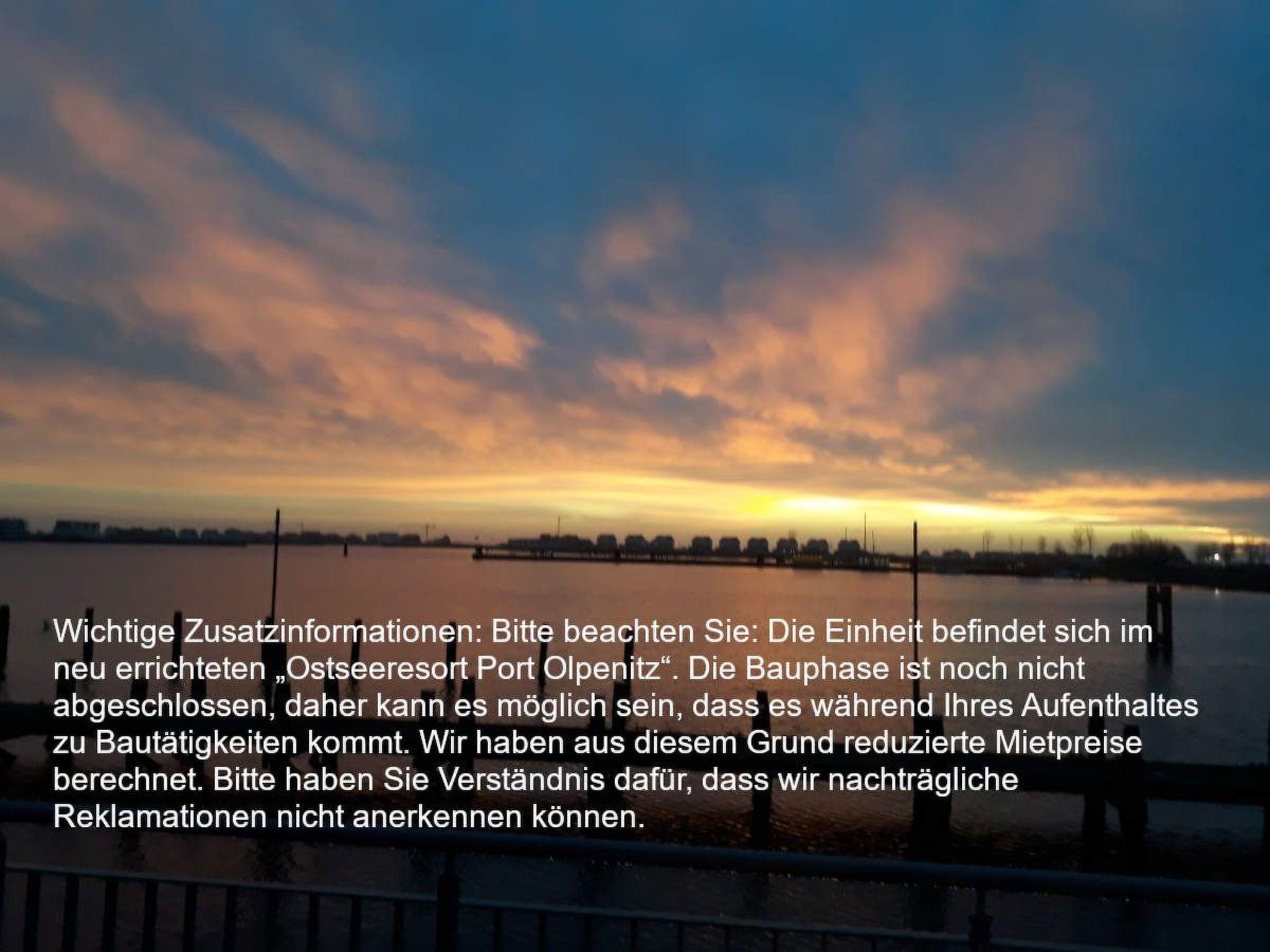 Wichtige Zusatzinformationen: Bitte beachten Sie: Die Einheit befindet sich im neu errichteten „Ostseeresort Port Olpenitz“. Die Bauphase ist noch nicht abgeschlossen, daher kann es möglich sein, dass es während Ihres Aufenthaltes zu Bautätigkeiten kommt. Wir haben aus diesem Grund reduzierte Mietpreise berechnet. Bitte haben Sie Verständnis dafür, dass wir nachträgliche Reklamationen nicht anerkennen können.