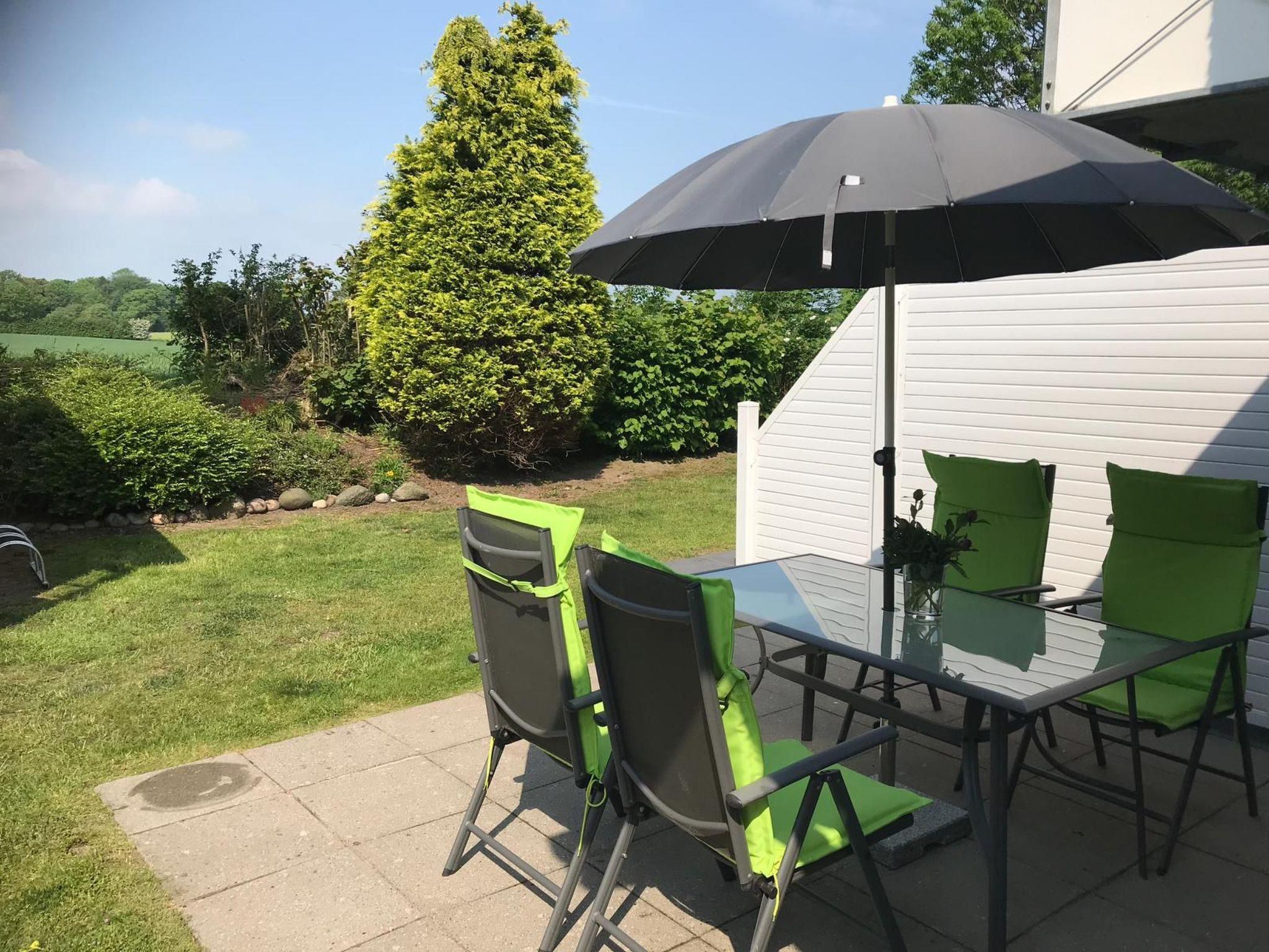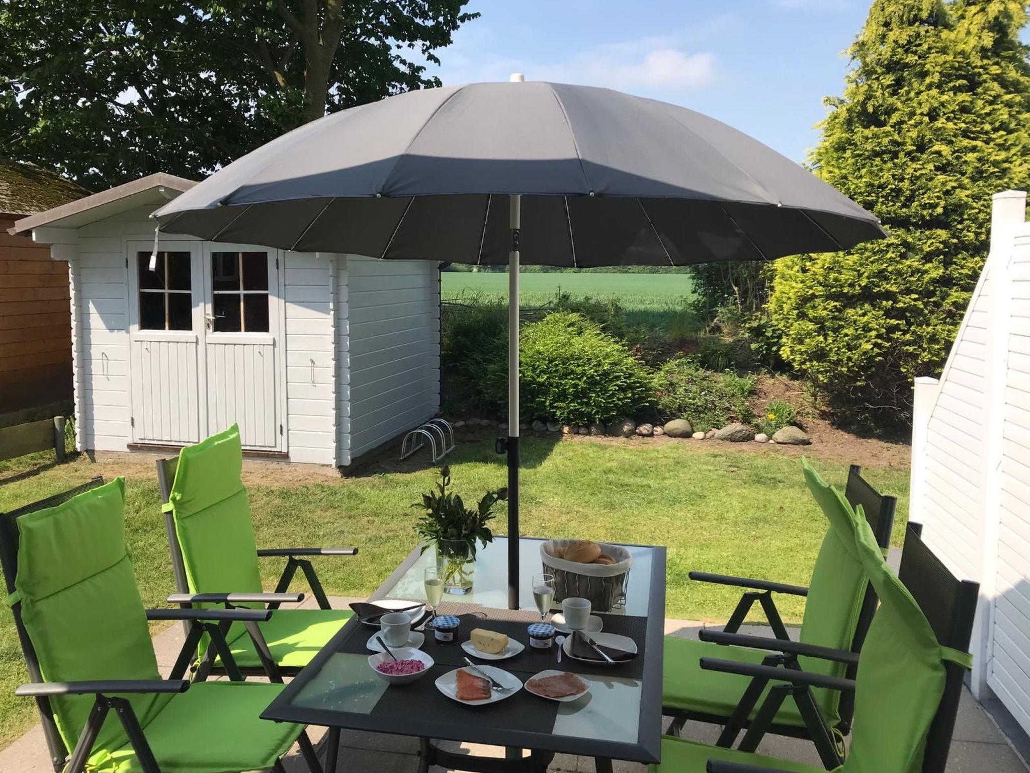 Die wunderschöne Terrasse in Südwestlage mit Blick auf die angrenzenden Felder ist mit Gartenmöbeln, Liegestuhl (inkl. Auflagen) und E-Grill ausgestattet. Mitgebrachte Fahrräder können in einem abschliessbaren Gartenhaus untergebracht werden.