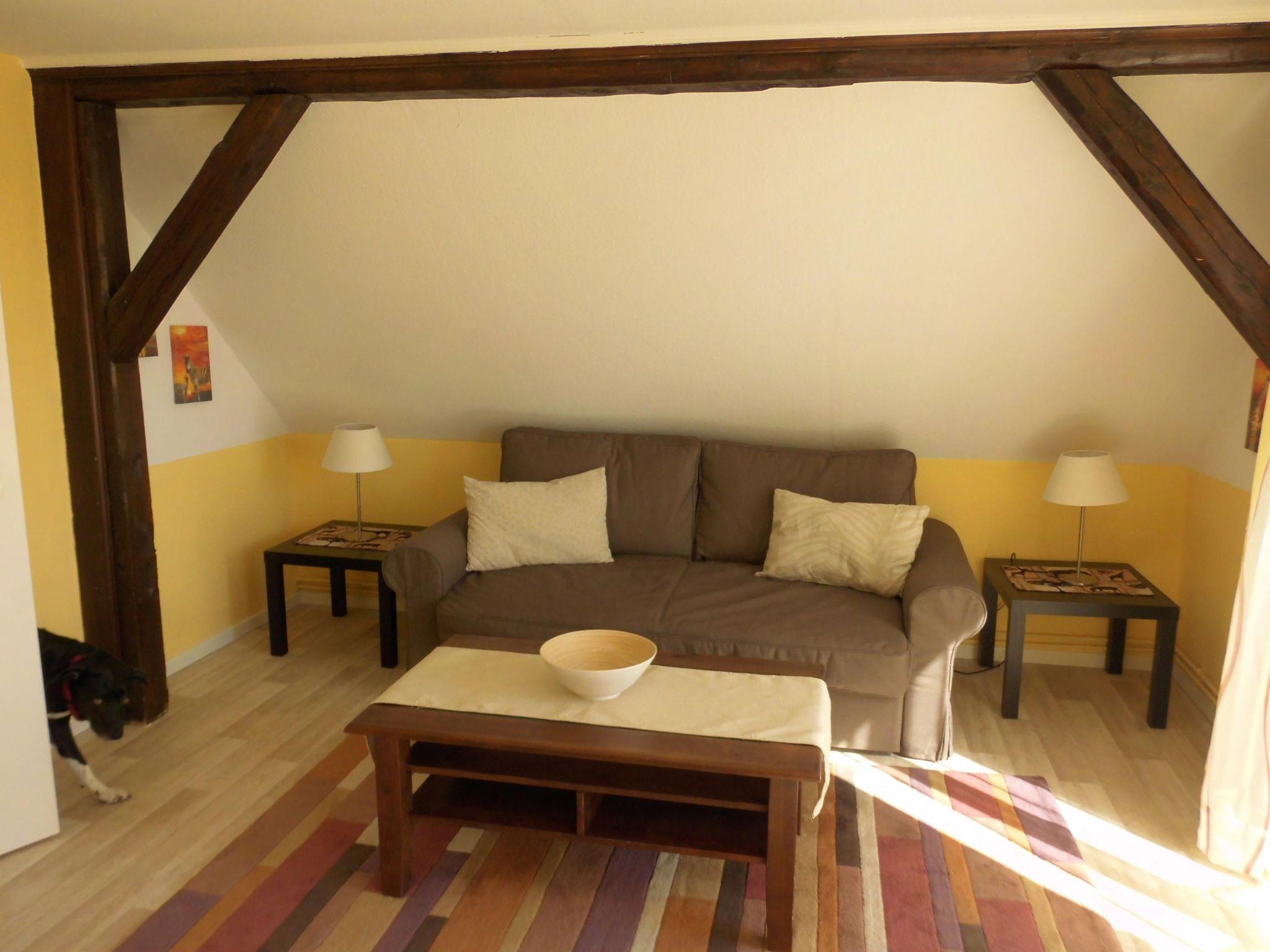 Die Wohnung befindet sich im Dachgeschoss des Hauses und verfügt über ein Schlafzimmer mit einem Doppelbett (180 x 200 cm), sehr guten Kaltschaummatrazen, reichlich Stauraum und TV. Das sehr gemütliche Wohnzimmer ist mit zusätzlicher Schlafcouch, Sesseln, TV und DVD ausgestattet. In der Küche befindet sich der Essbereich, der nicht nur zu Mahlzeiten, sondern auch zum gemütlichen Verweilen und Spielen einlädt. Die Küche ist reichhaltig ausgestattet mit Kühlschrank und Gefrirrfach, E-Herd mit Backofen, Mikrowelle, Kaffeemaschine, Wasserkocher, Toaster sowie reichlich Geschirr, Gläsern, Besteck und Kochutensilien. Das Duschbad ist funktionell eingerichtet u.a. mit Schminkspiegel und Haartrockner.