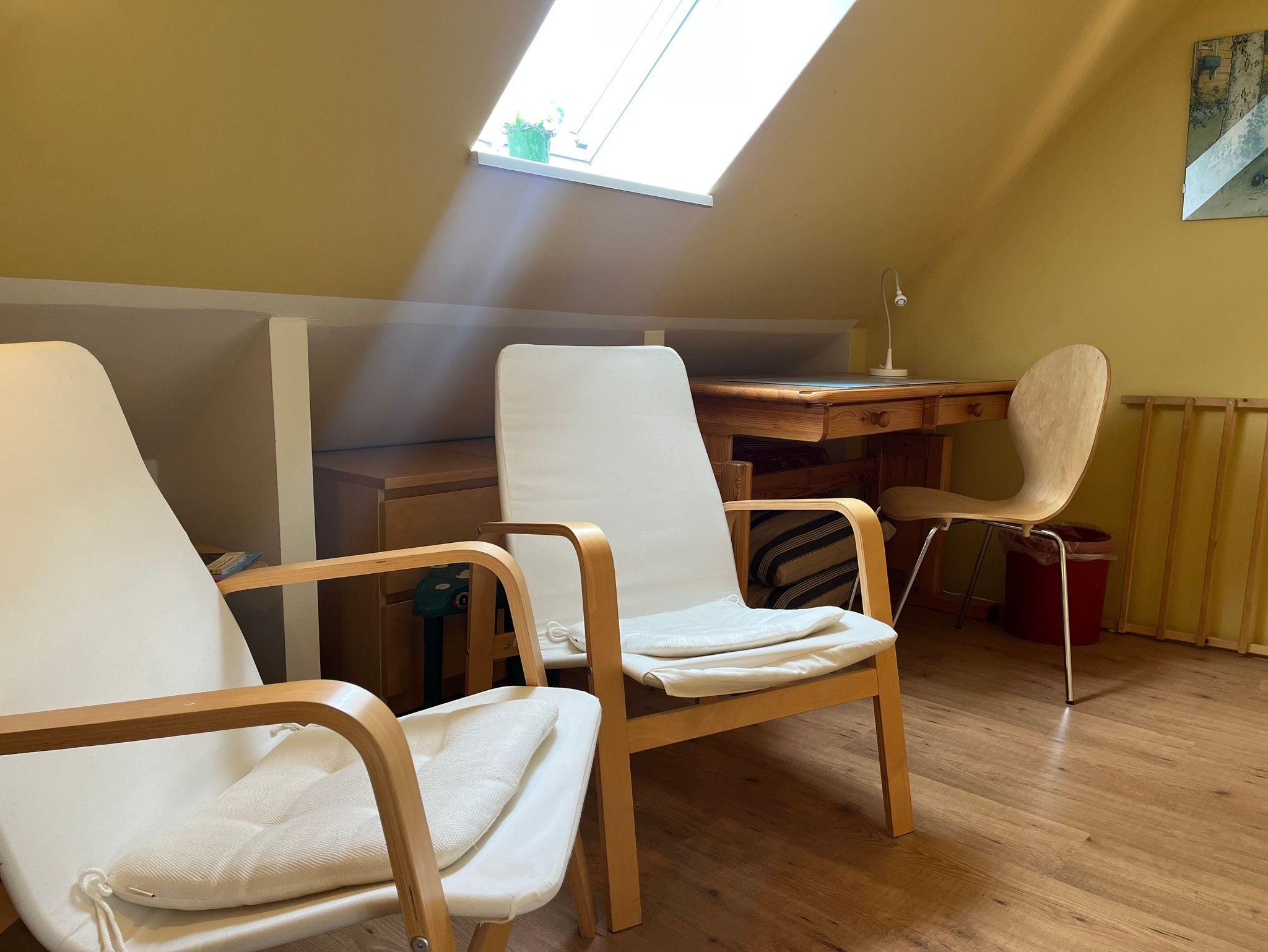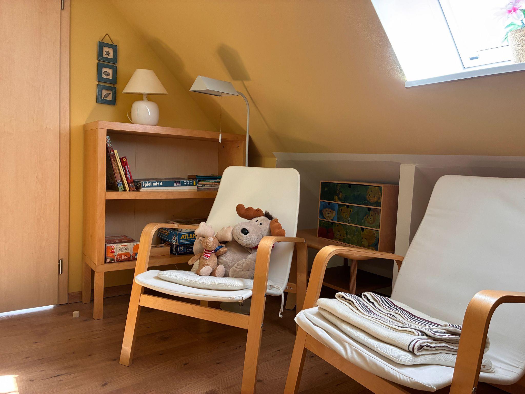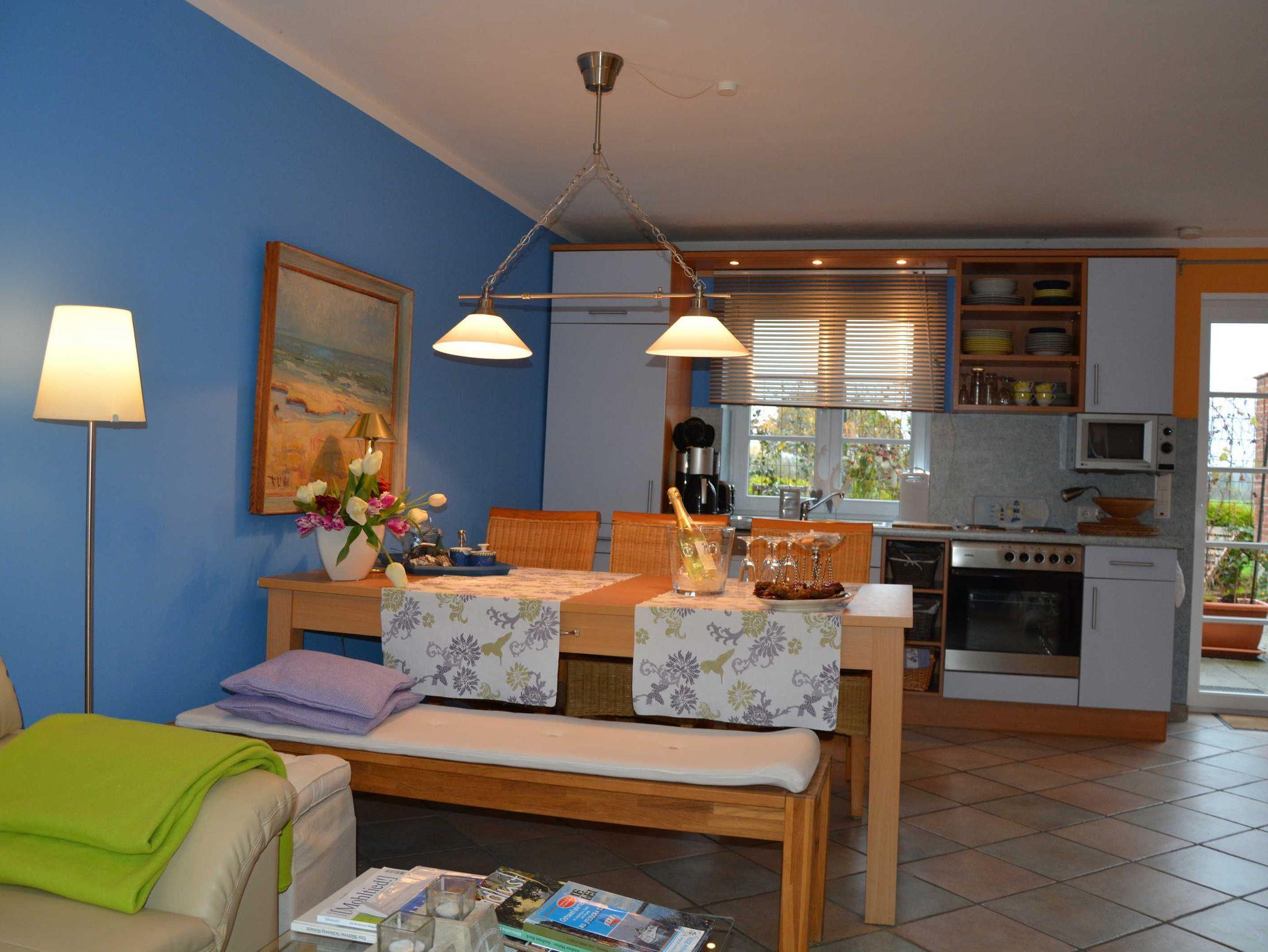 Kommen Sie unsere gemütliche Ferienwohnung besuchen. Bis zu 6 Urlauber finden hier auf ca. 80 m² Platz. Im Erdgeschoss befindet sich ein Wohn/Esszimmer mit offener Küche, ein Doppelschlafzimmer sowie ein Bad. Vom Wohnbereich gehen Sie auf Ihre eigene großzügige Terrasse, mit Gartentisch, Stühle und Sonnenschirm. Im Obergeschoss ist das zweite Doppelzimmer mit Babybett und Sitzecke. Das dritte Schlafzimmer befindet sich ebenfalls im Obergeschoss und ist mit zwei Einzelbetten ausgestattet. Ein weiteres Badezimmer vervollständigt das Obergeschoss. Beide Bäder sind zusätzlich mit Fußbodenheizung ausgestattet. Die Küchenzeile verfügt über einen Kühlschrank, 4-Plattenherd mit Backofen, Mikrowelle, Spülmaschine, Kaffeemaschine und Wasserkocher sowie reichlich Geschirr und Töpfe, so dass Sie selber für Ihr leibliches Wohl sorgen können - wenn Sie es möchten.