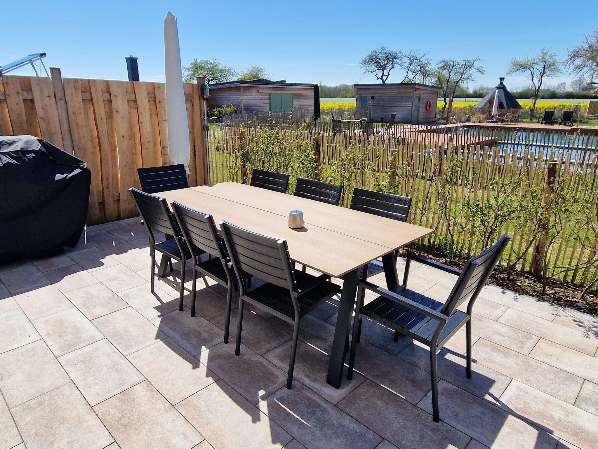 - Terrasse mit Sitzmöbeln, Sonnenschirm, Gasgrill und Blick auf den Schwimmteich; eingezäunter Bereich