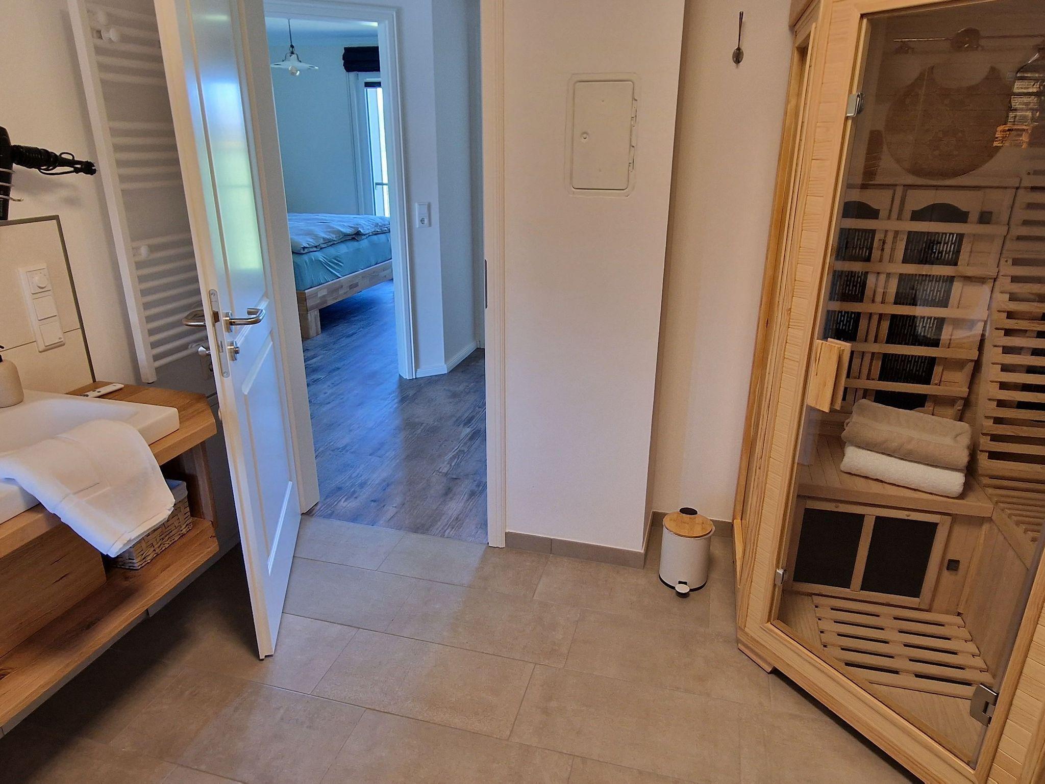- Bad mit Wanne, ebenerdiger Regendusche, Handtuchheizkörper und Infrarotkabine; Handtücher