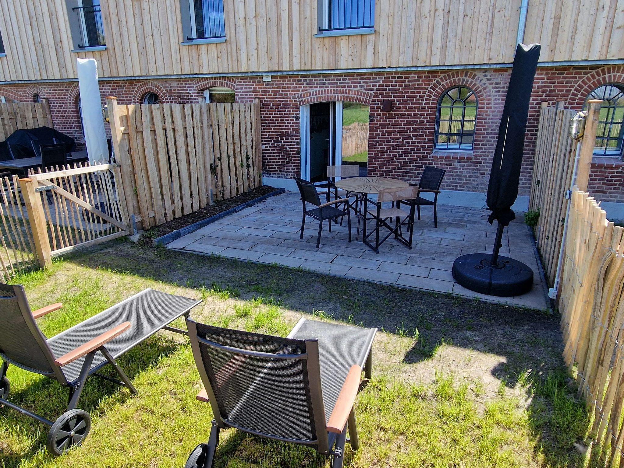 - Terrasse mit Sitzmöbeln und Sonnenschirm; eingezäunter Bereich