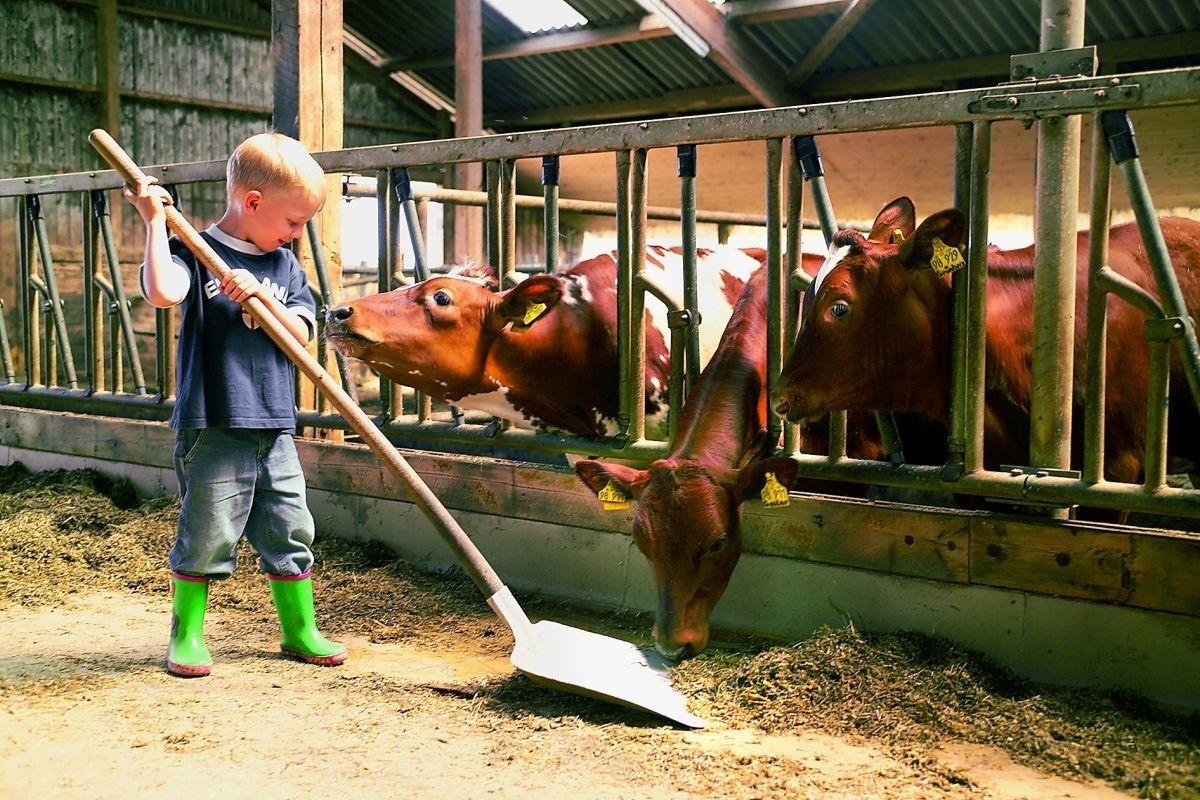 Auf unserem Bauernhof leben Kühe, Kaninchen, Ponys, Katzen und Hühner.