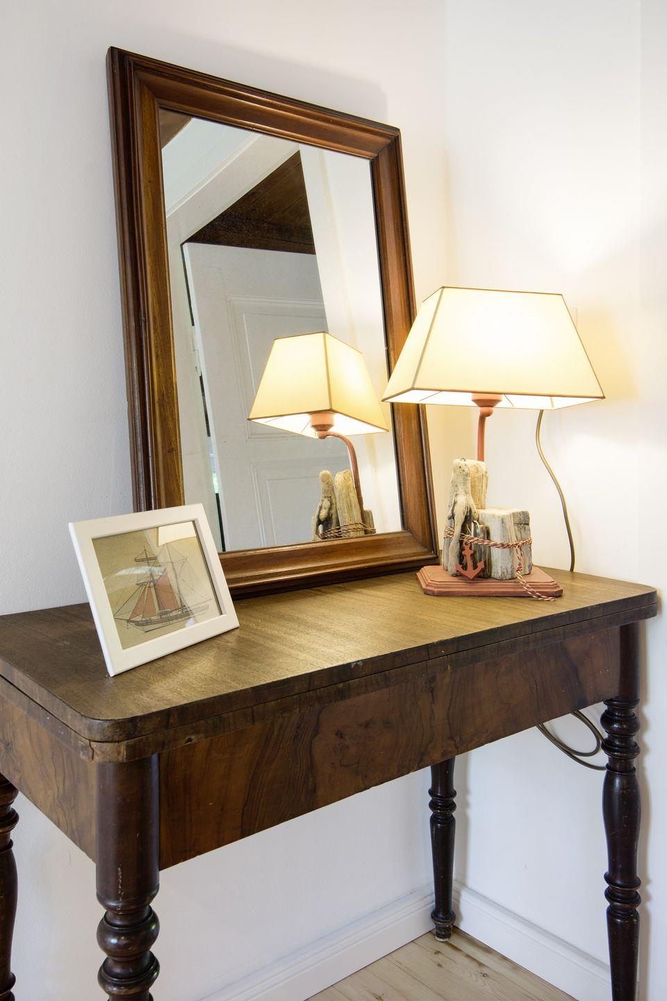 Das Tageslichtbad ist mit einer ebenerdigen Dusche und einem Föhn ausgestattet. Auch ein Schlafzimmer mit einem Doppelbett (180x200cm) und einem Kleiderschrank befindet sich im Erdgeschoss.