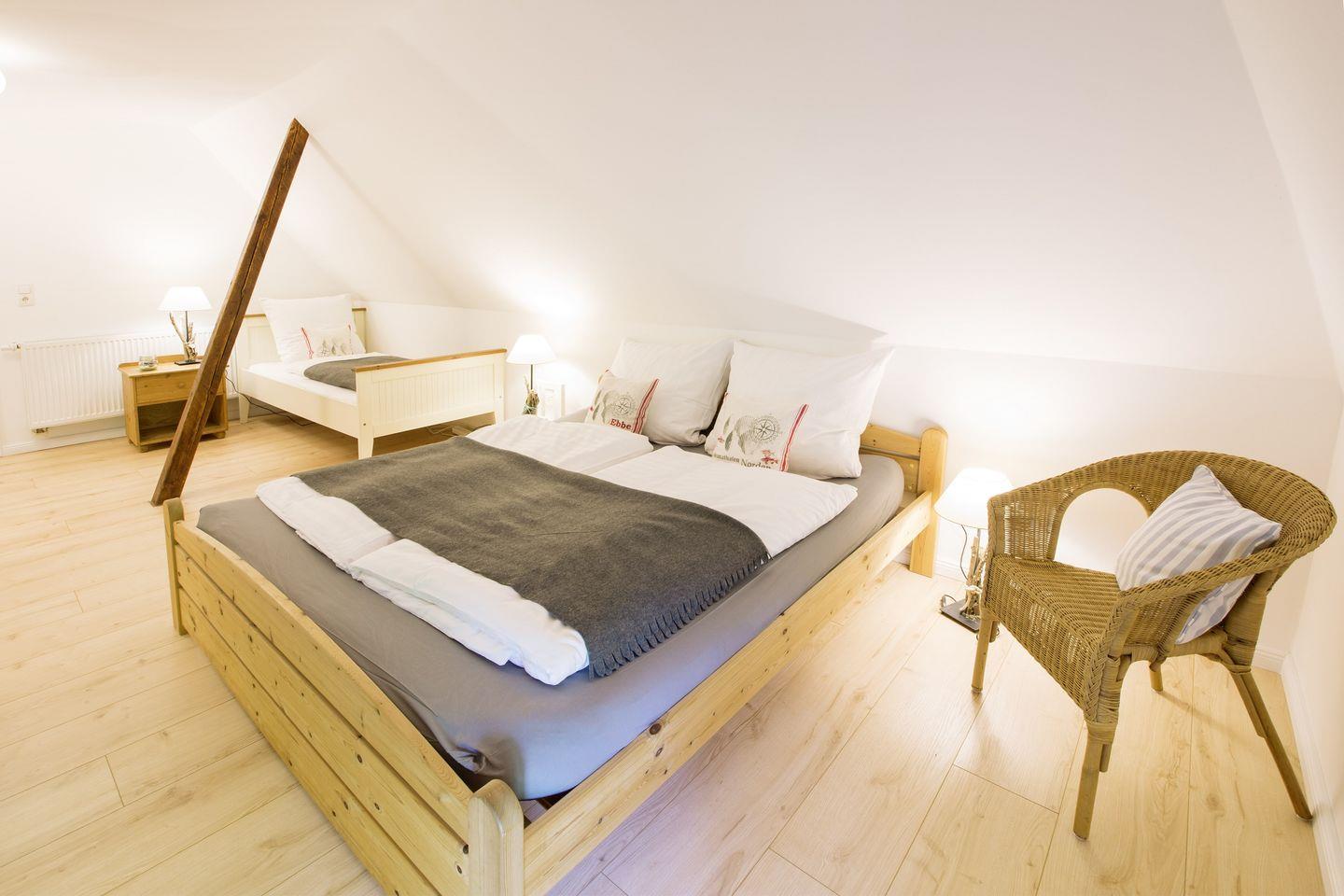 Im Dachgeschoss ist ein offen gestaltetes Schlafzimmer mit einem Doppelbett (180x200cm) und einem Einzelbett (90x200cm) vorhanden. Auch hier bietet ein Kleiderschrank viel Stauraum. Eine Récamiere ist der ideale Platz, um in Ruhe ein Buch zu lesen.