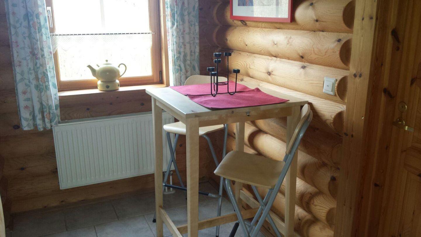 Finnisches Blockbohlenhaus mit Kaminofen und überdachter Terrasse. Für bis zu 6 Personen und 2 Hunden geeignet.
