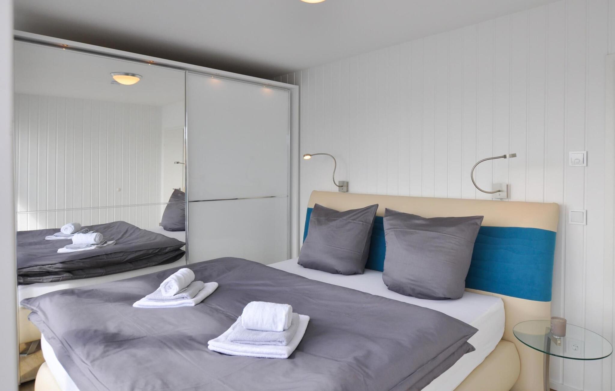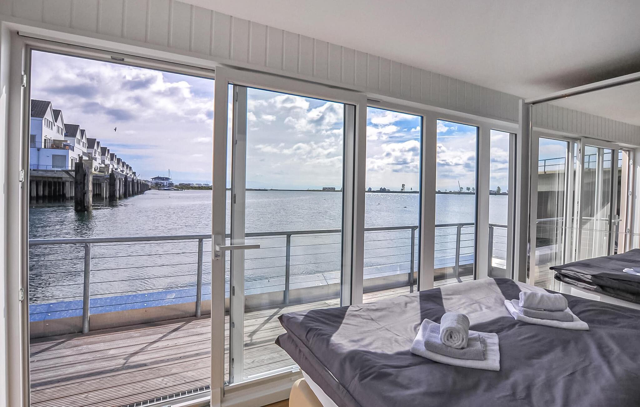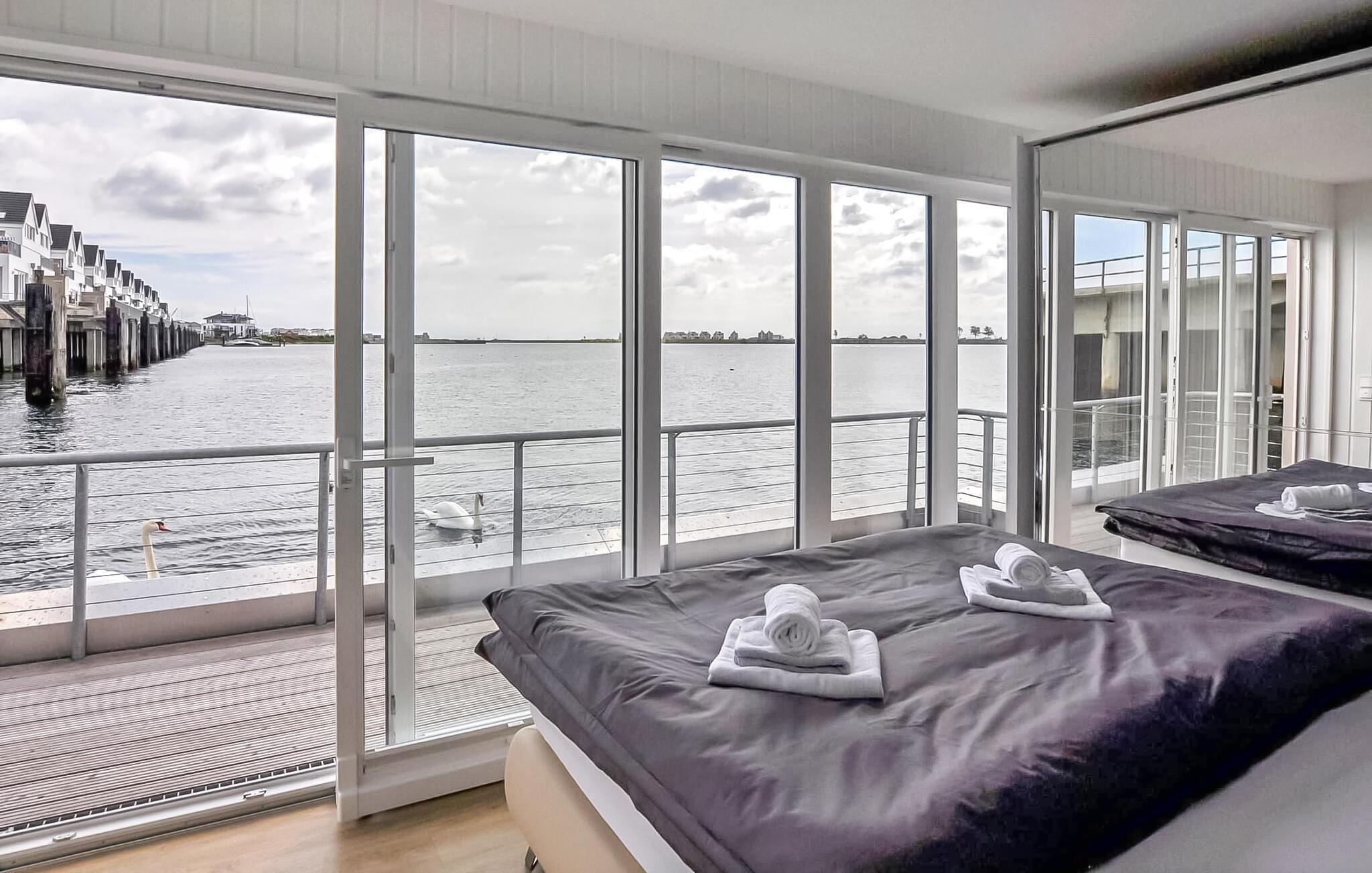 Der Schlafbereich des schwimmenden Ferienhauses befindet sich im Erdgeschoss. Zwei Schlafzimmer verfügen hier über Platz für bis zu vier Erwachsene und je über einen eigenen TV mit Home Entertainment Programm. Im Hauptschlafzimmer eröffnen bodentiefe Fenster vor unmittelbarer Wasserkulisse neue Perspektiven. Über eine Terrassentür ist von hier aus die umläufige Begehung des Hauses möglich, während eine Badeleiter für Erfrischung sorgt. Ein weiteres Schlafzimmer mit zwei Einzelbetten sowie ein Duschbad befinden sich ebenfalls auf dieser Ebene. Einen zusätzlichen Schlafplatz bietet das komfortable Schlafsofa im Wohnbereich.