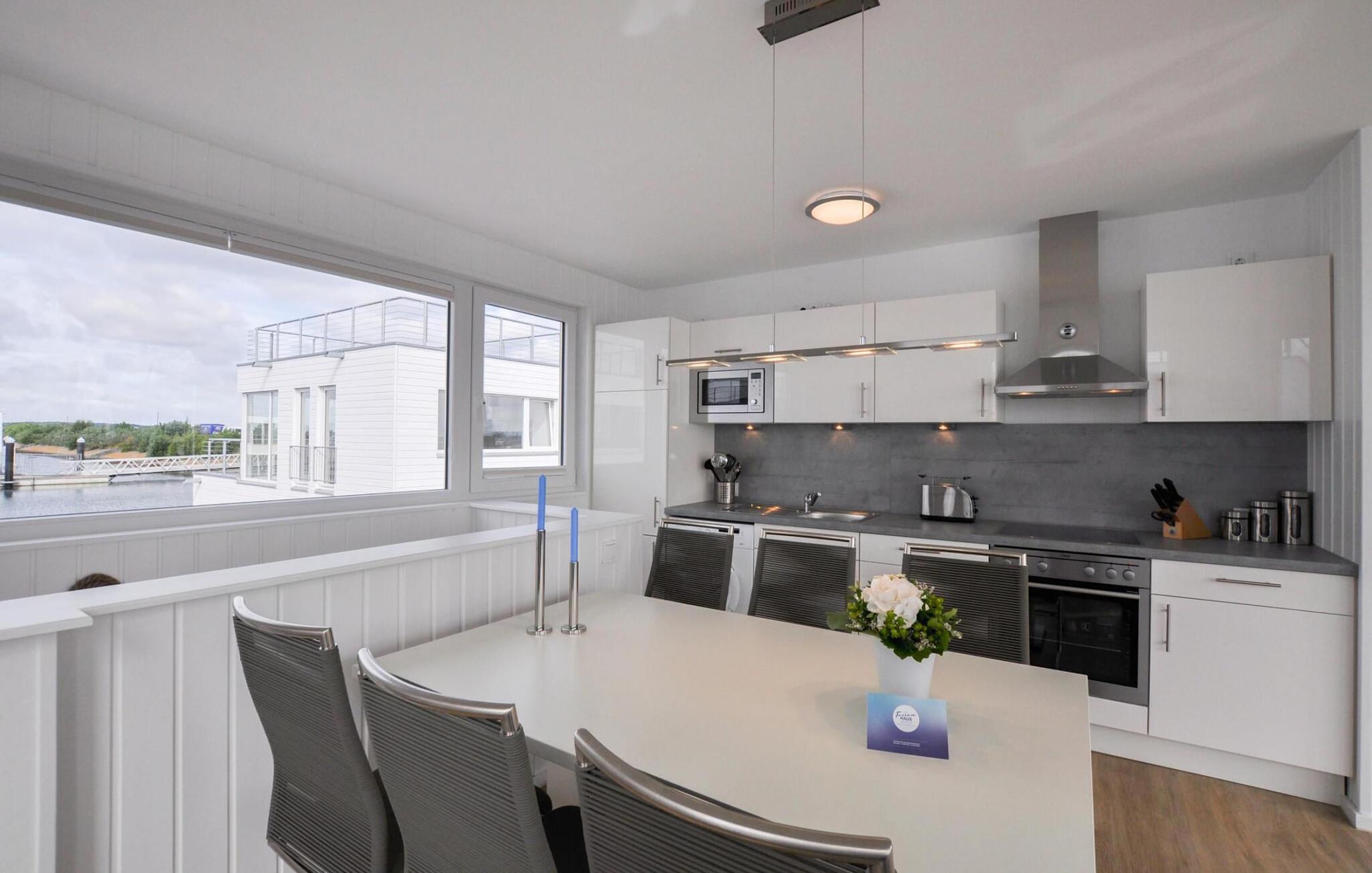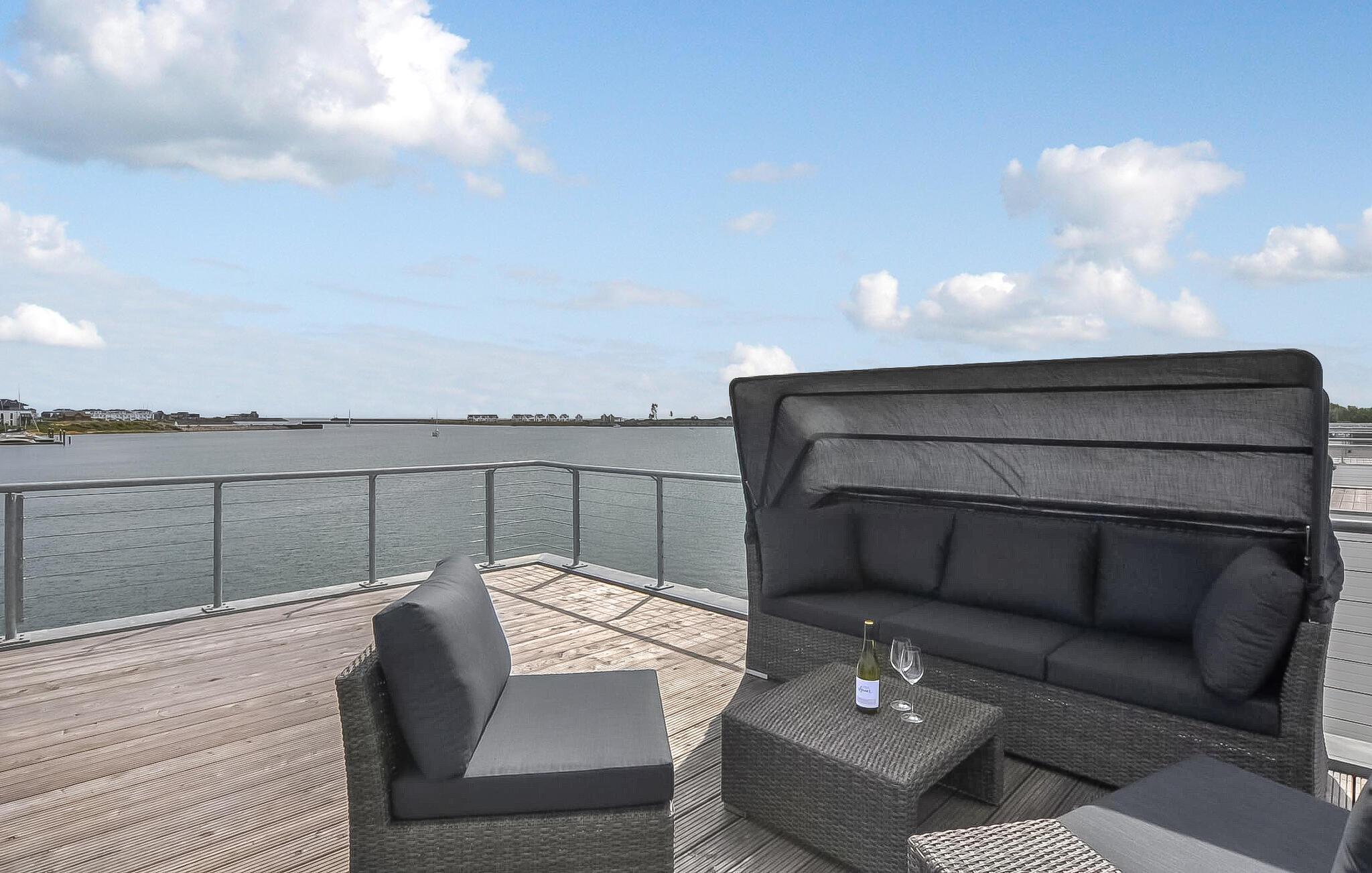 Ein Highlight stellt die große Dachterrasse mit Rundum-Wasserblick und ganztags Sonne dar. Und auch der weiße Sandstrand des Ostseeresorts befindet sich nur einige hundert Meter entfernt. Das schwimmende Ferienhaus Hausboot liegt geschützt ganz am Anfang des ersten Steges und ist daher von Land aus direkt erreichbar. Durch seine Lage in erster Reihe überzeugt das Hausboot mit einem freien Blick über das Wasser und gen Hafeneinfahrt.