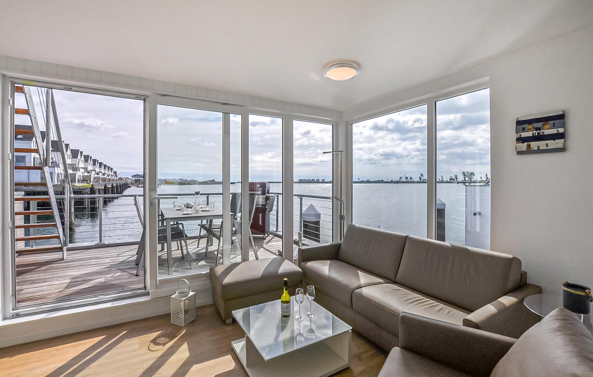 Erleben Sie Luxus und Natur auf diesem schwimmenden Ferienhaus mit Sauna und Rundumblick im OstseeResort Olpenitz.