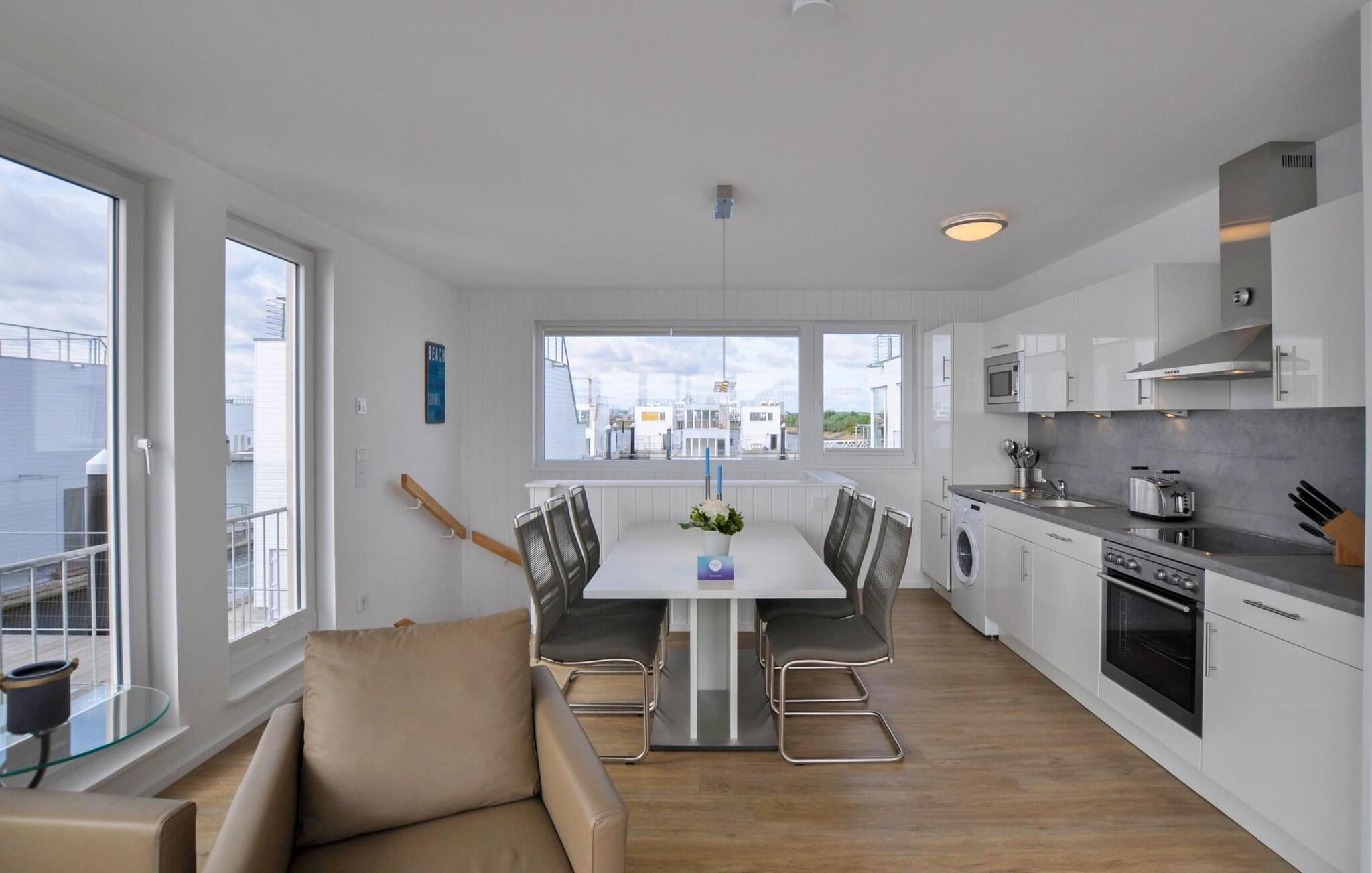 Alle Annehmlichkeiten bietet die an den Wohnbereich angrenzende moderne und hochwertig ausgestattete Wohnküche mit einem Esstisch für bis zu sechs Personen.
