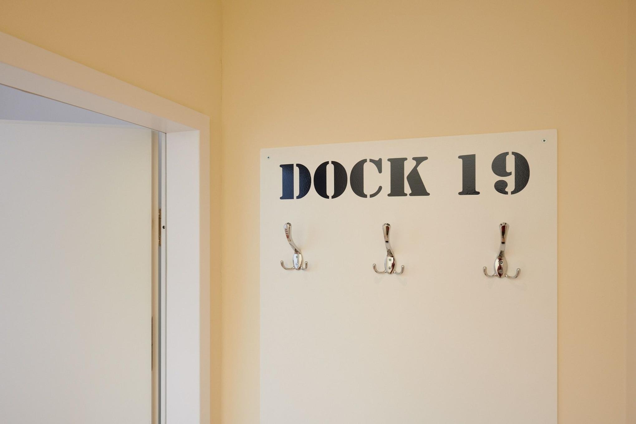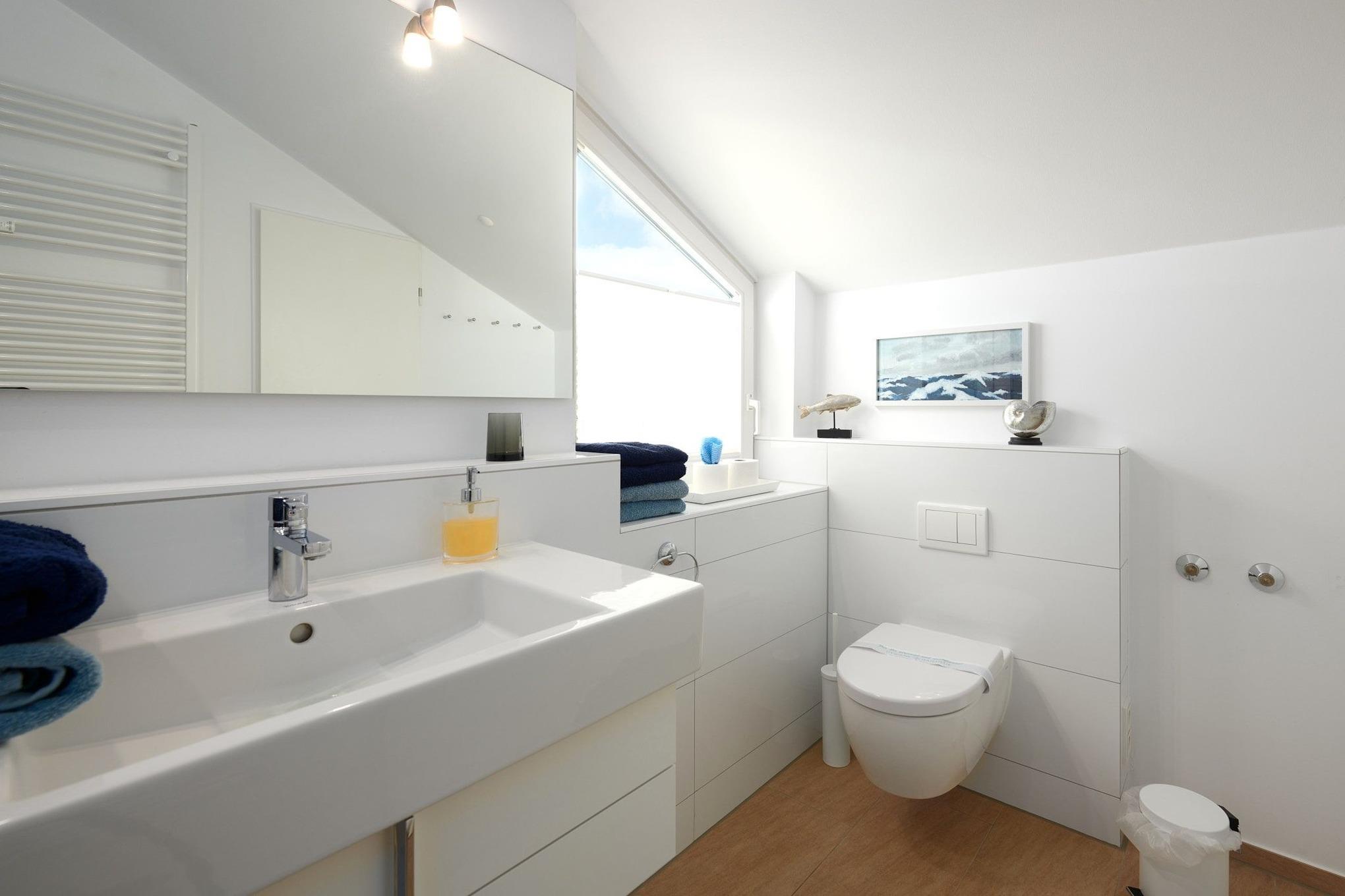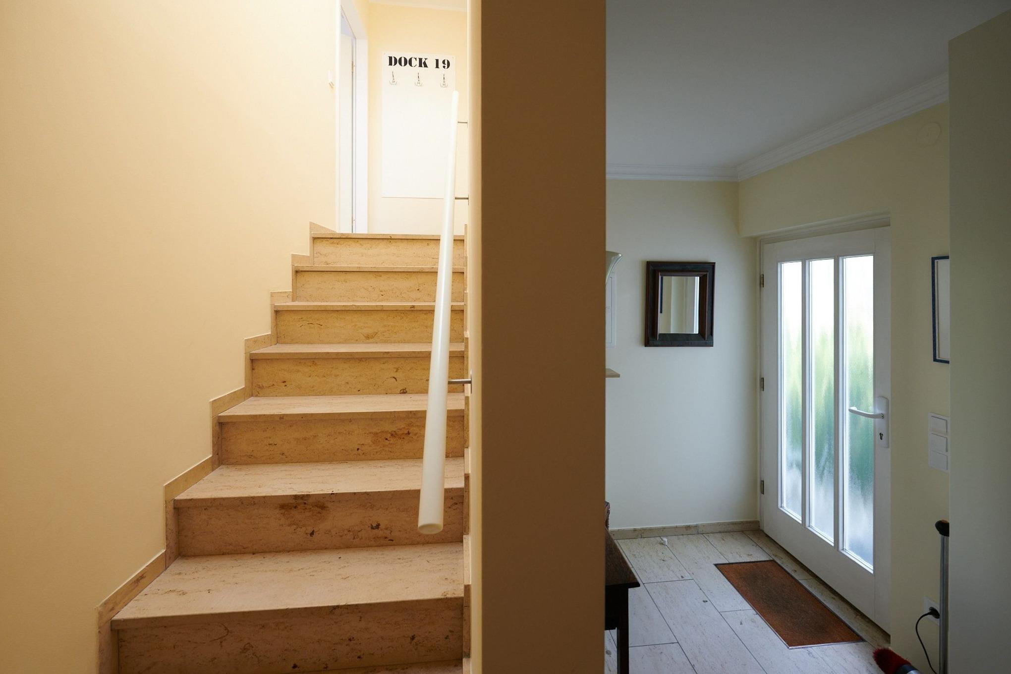 Sowohl vom überdachten Balkon, der über die gesamte Breite des Hauses verläuft und mit einem Deckchair möbliert ist, als auch vom Wohnraum und der Küche aus haben Sie einen herrlichen Blick auf die Förde in Richtung Nord-Ostsee-Kanal. Hier können Sie den Sonnenuntergang genießen und die Kreuzfahrer, Fähren Frachter sowie Segelschiffe vorbeiziehen sehen. Diese geschmackvoll eingerichtete Wohnung besticht durch ihre lichtdurchfluteten Räume mit weißgeöltem Eichenholzparkett. Der Wohnraum verfügt über einen Essplatz mit bequemen Loom Sesseln an der langen Fensterfront. In einer gemütlichen Sitznische befinden sich ein Sofa und ein Sessel. Der Fernseher ist durch eine Aufhängung in verschiedene Richtungen schwenkbar. So lässt sich sowohl aus der Küche, vom Esstisch aus oder vom Sofa das Programm genießen. Die offene Küche ist gut ausgestattet und durch einen Bartresen vom Wohnbereich getrennt. Ein paar Stufen höher liegt das helle Schlafzimmer mit einem Boxspringbett (160x200 cm). Ihre Garderobe findet Platz in zwei Schrankelementen und einer großen Kommode. Die vier Dachflächenfenster ermöglichen einen tollen Blick in den Himmel und lassen sich per Fernbedienung mit elektrischen Außenrollläden verdunkeln. Gegenüber befindet sich das moderne Duschbad mit großem Spiegel. Die über die ganze Breite des Bades befindliche Dusche ist über eine kleine Stufe begehbar und mit einer Glasabtrennung versehen. Hier kann zwischen einem klassischen Duschkopf und einer Regendusche gewählt werden.