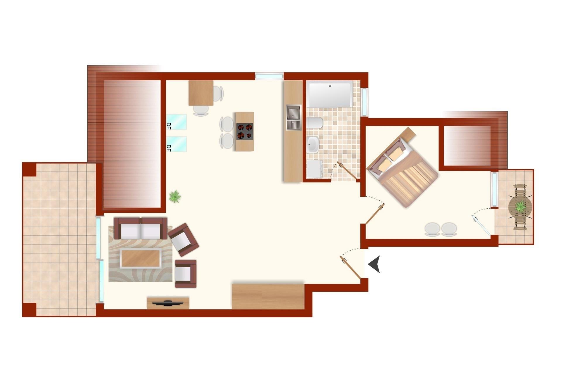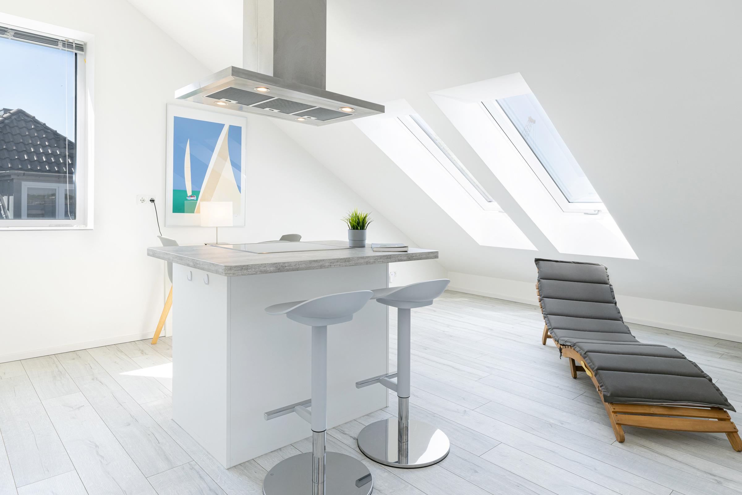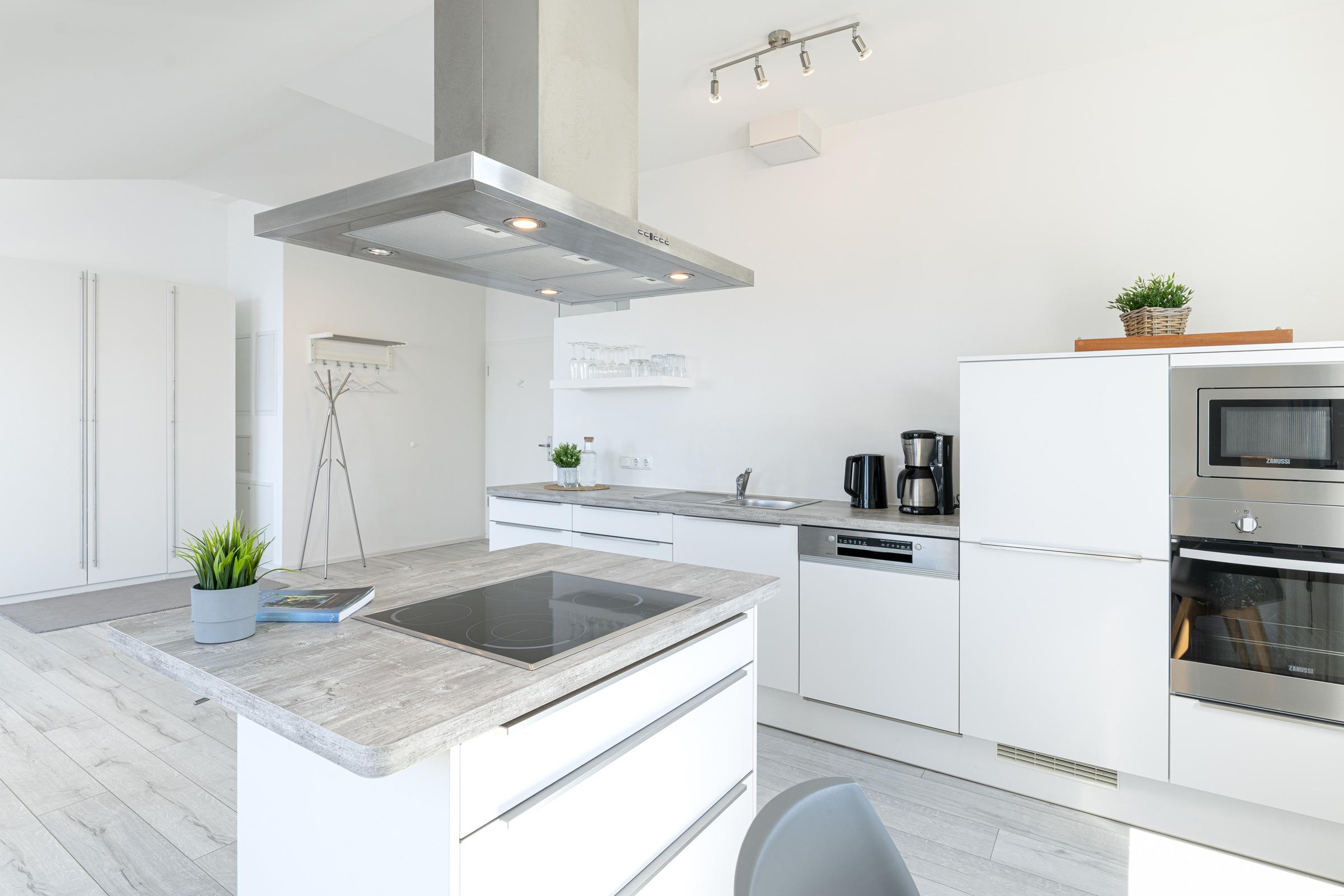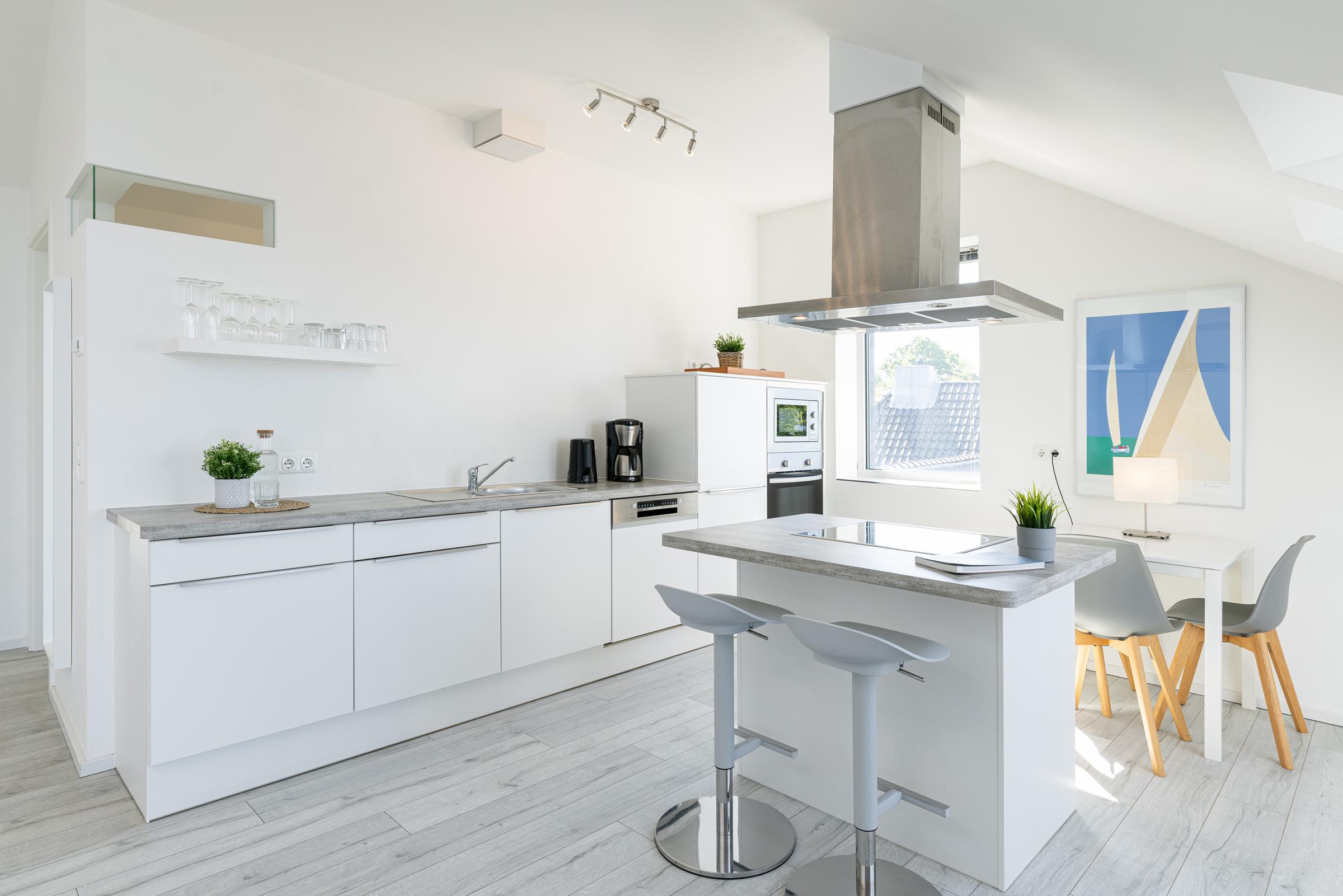 Diese hochwertig und modern eingerichtete 2-Zimmer-Ferienwohnung für maximal zwei Erwachsene - in der 2. Etage gelegen - verfügt über 1 separates Schlafzimmer mit Boxspringbett und begehbarem Balkon. Das große Tageslicht-Badezimmer verfügt über eine ebenerdige Dusche. Das sehr großzügige Wohnzimmer ist kombiniert mit einer offenen Wohnküche (Kochinsel mit Dunstabzug und Essbereich). Im Wohnbereich finden Sie eine bequeme Sofalandschaft und Sessel vor, die auf den Balkon und den Flachbildschirm ausgerichtet sind.