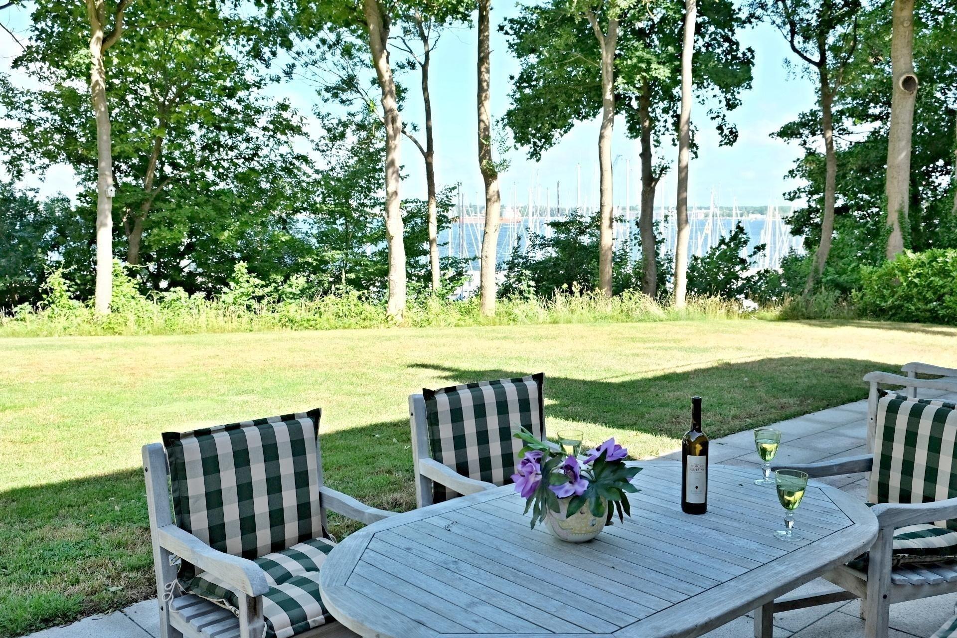 Das über 140 qm große Apartment befindet sich im Erdgeschoss der Villa Bellevue; ausreichend Platz für 4 Erwachsene und 2 Kinder. Der großzügige Flur führt direkt in den lichtdurchfluteten modernen Wohnraum. Große Terrassenschiebetüren eröffnen Ihnen den Blick in den wundervollen Garten, den Möltenorter Yachthafen und die Kieler Förde. Am Esstisch, perfekt platziert vor der großen Terrasse, können Sie gleich beim Frühstück den schönen Blick auf das Meer genießen; gleich daneben die offene Küche.