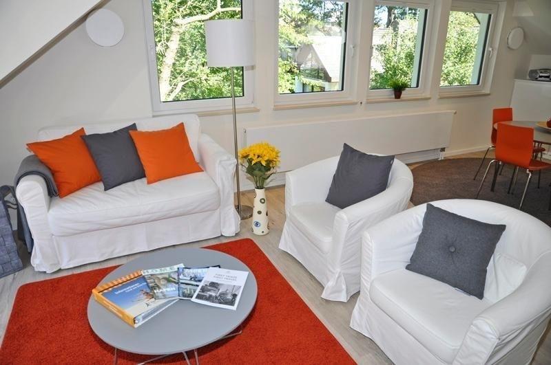 Das über 80 qm große Apartment für 4 Personen erwartet Sie in der 1. Etage der Villa Bellevue. Rechts vom wohnungseigenen Flur gelangen Sie in den lichtdurchfluteten Wohnraum mit einer offenen Qualitäts-Küche und dem Essbereich.